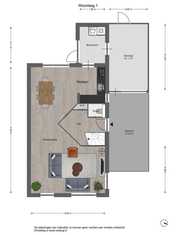 Begane grond: hal/entree, toilet met fontein, meterkast, L-vorige woonkamer met pvc-vloer en schuifpui naar terras/tuin, open keuken met keukenblok in hoekopstelling v.v. gaskookplaat, oven en wasemkap, bijkeuken/achterentree met pvc-vloer en wasmachineaansluiting, binnendoor naar garage/berging.