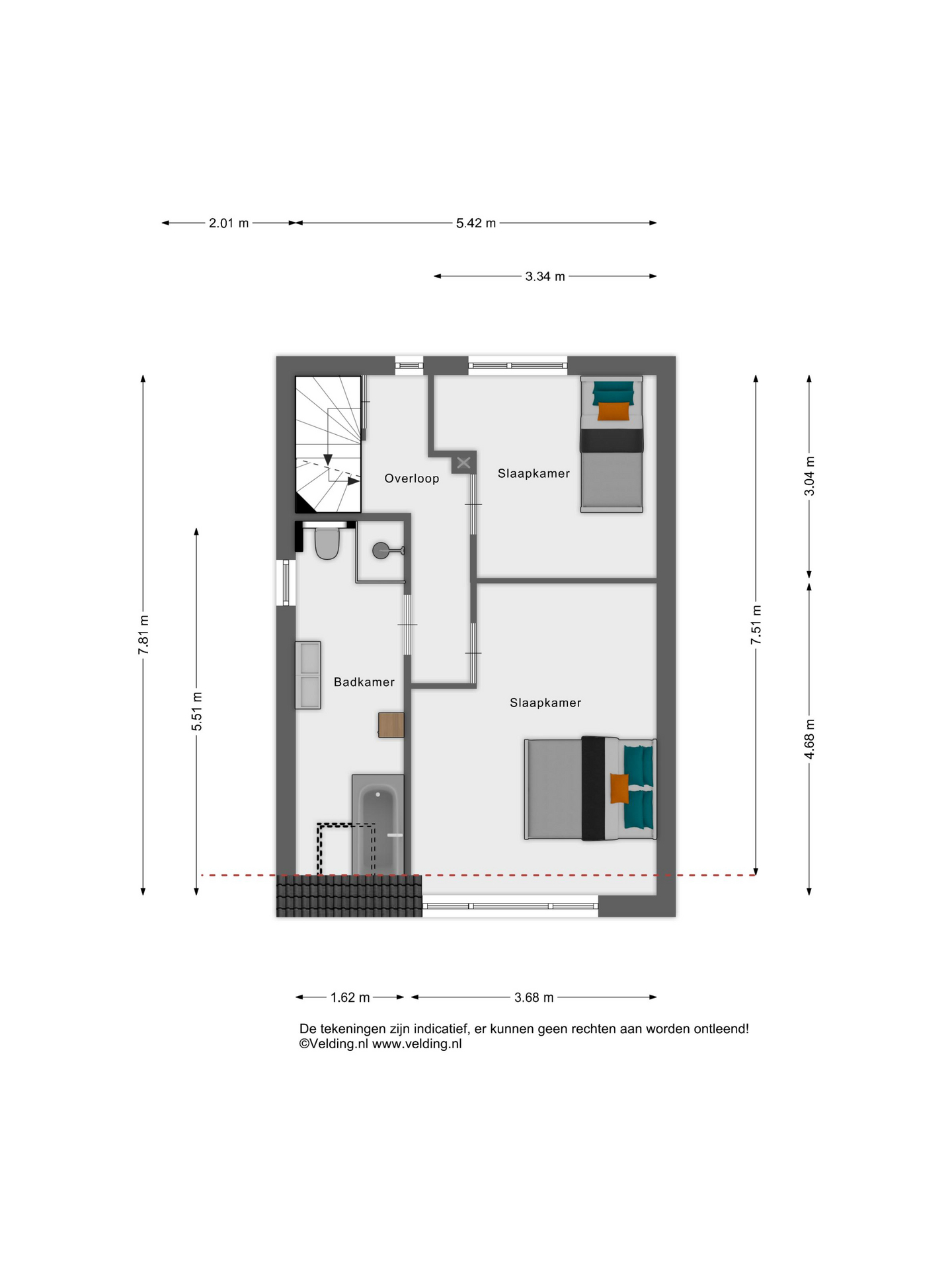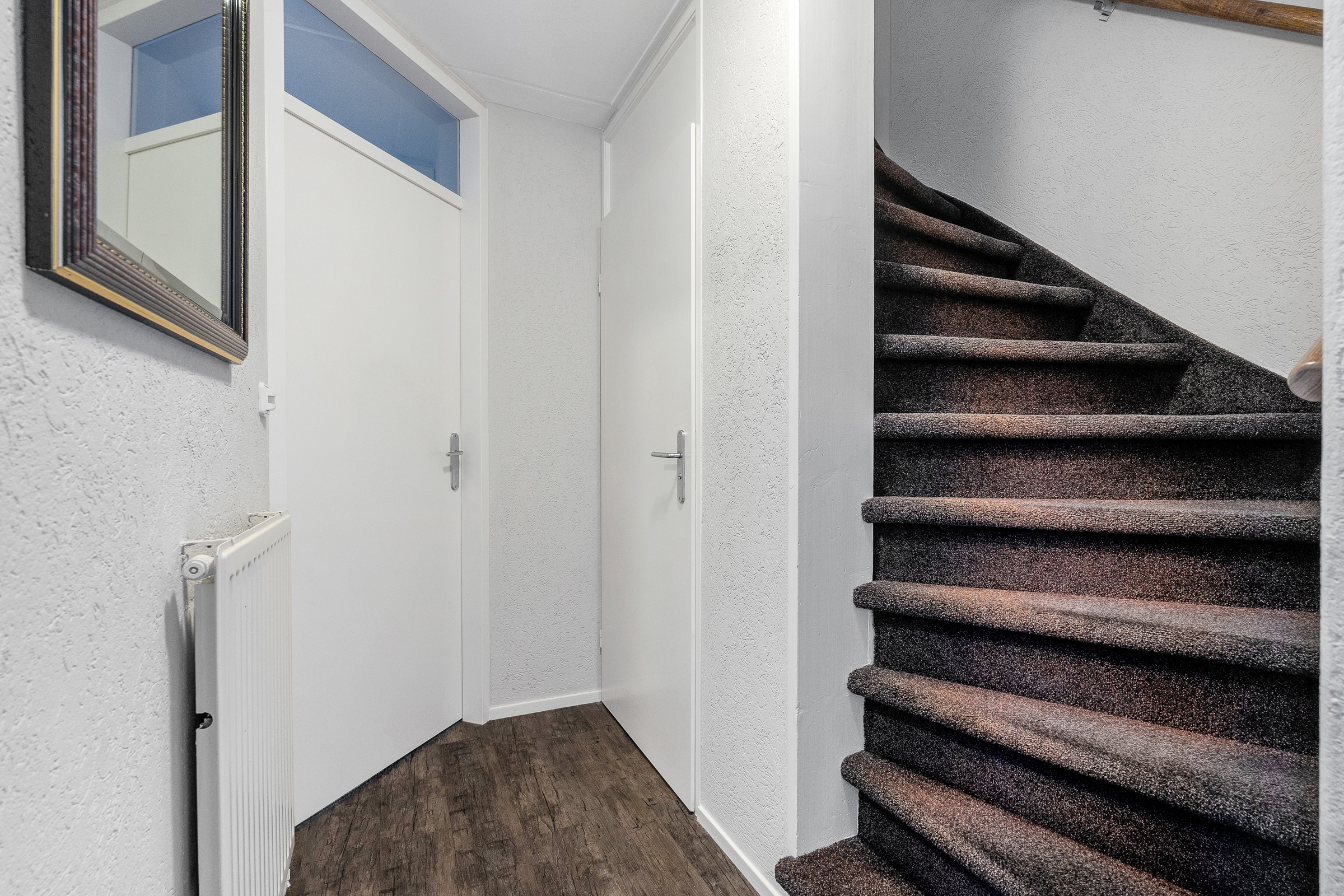 Tweede verdieping: vaste trap naar overloop, cv- installatie, 3e slaapkamer met pvc-vloer.