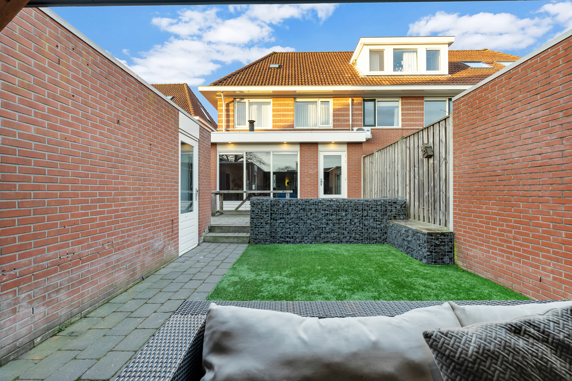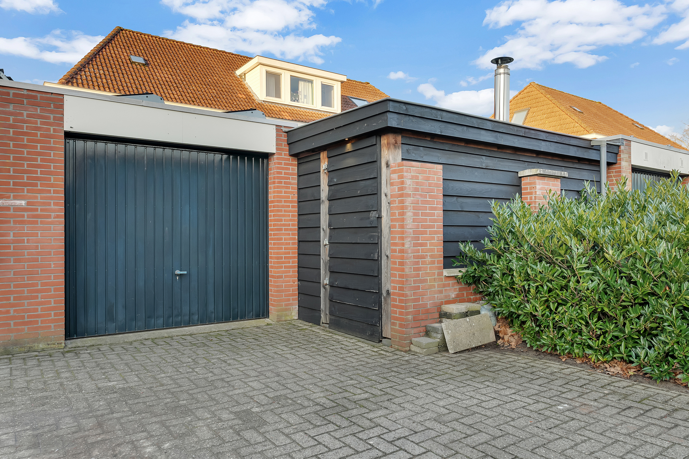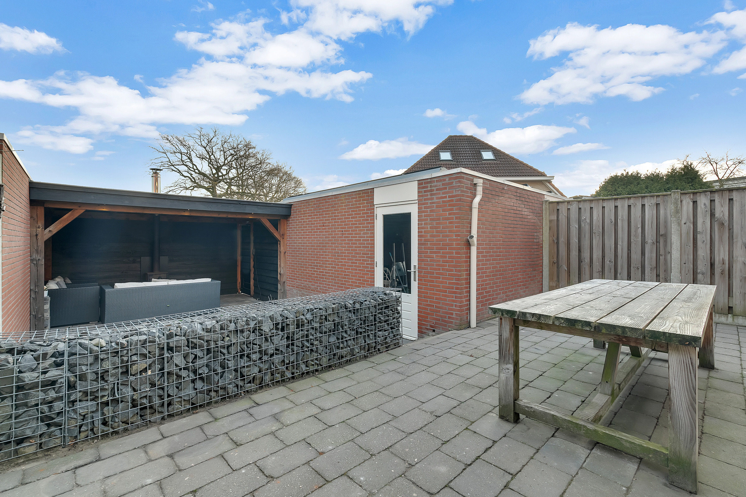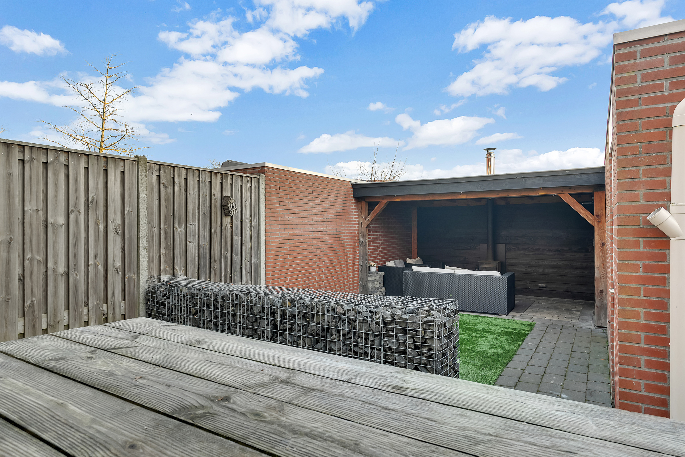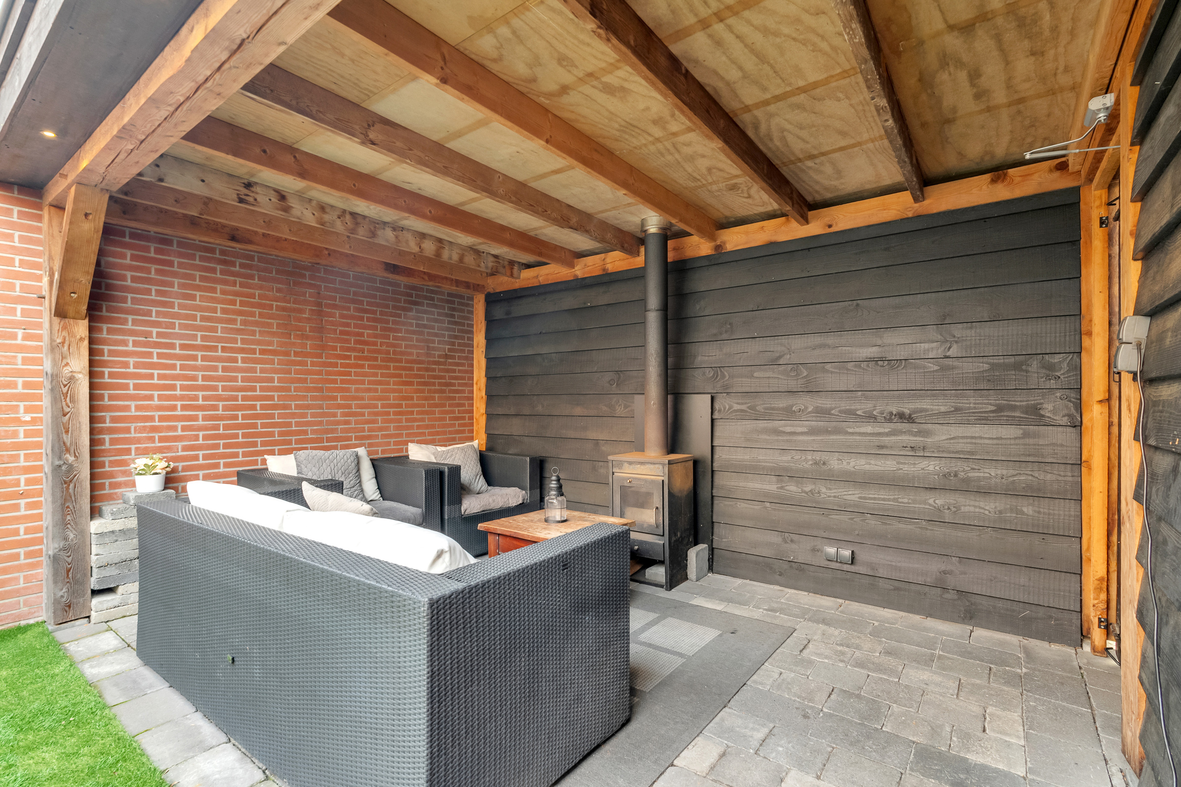 De achtertuin is een heerlijke plek om te ontspannen, met een gezellige overkapping voorzien van houtkachel. De garage bevindt zich achter in de tuin en is bereikbaar via de weg aan de achterzijde – handig voor de auto, fietsen of extra opslag.