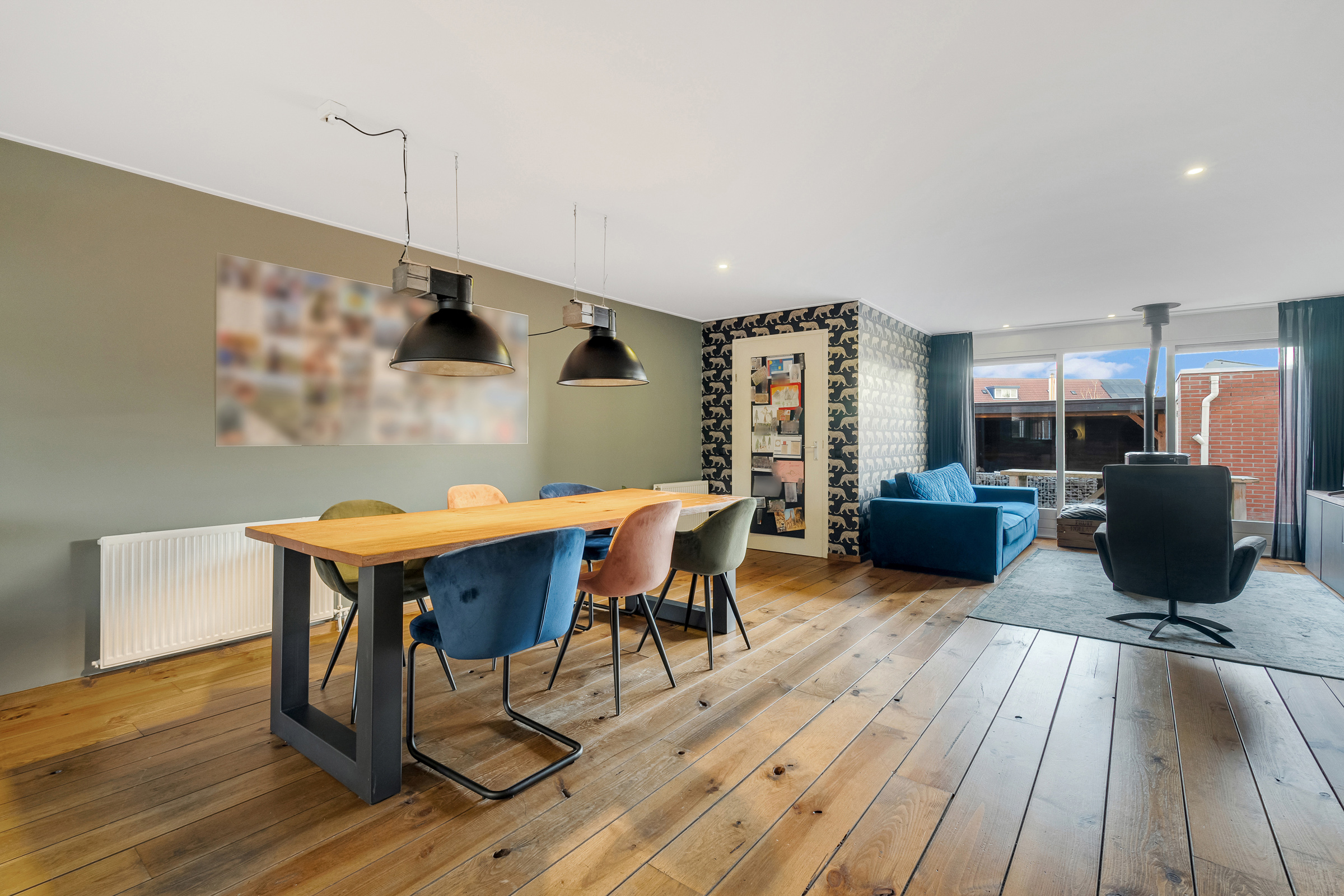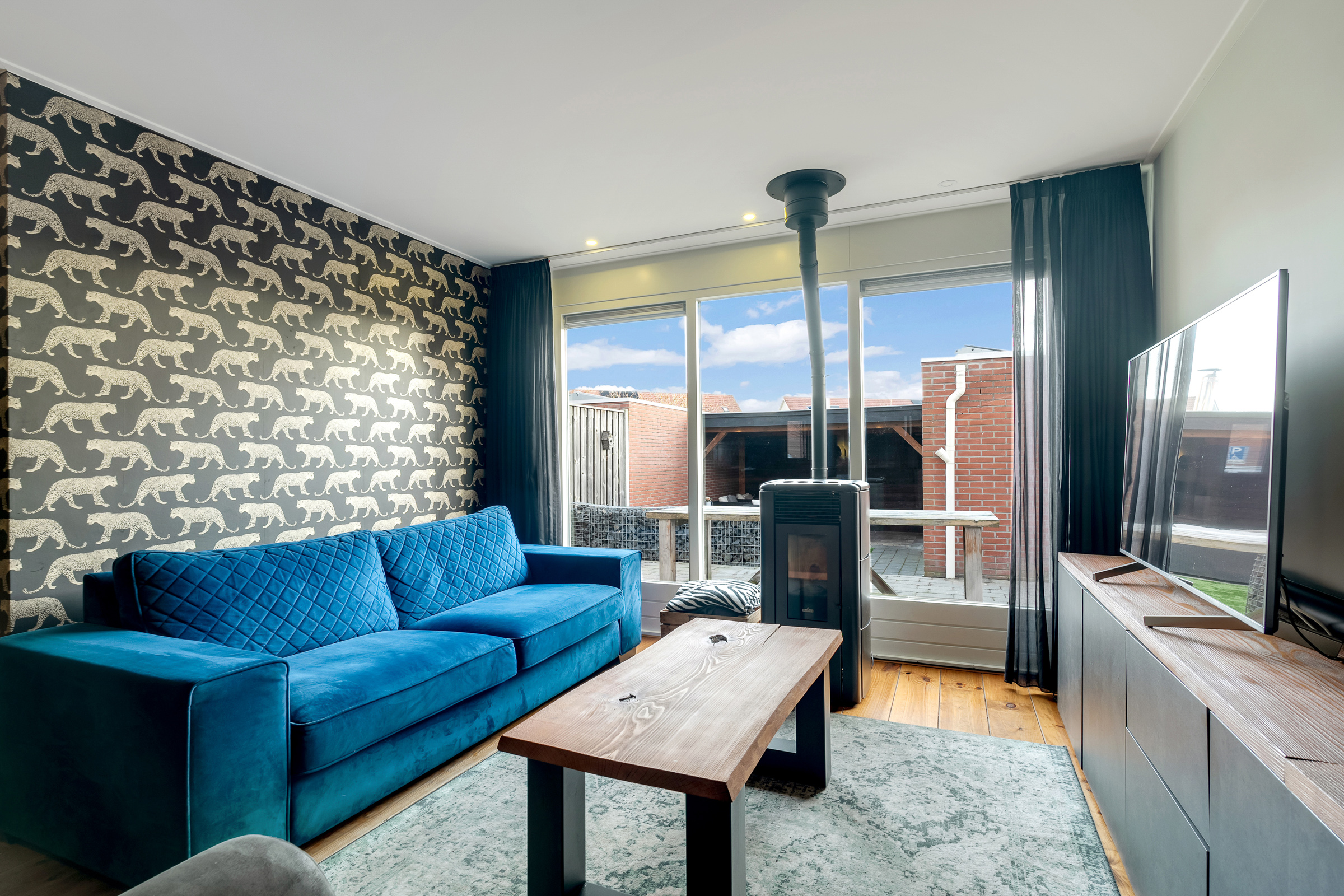 Aan de achterzijde is de woning over de volle breedte uitgebouwd, waardoor de woonkamer lekker ruim is. Dankzij de ramen tot aan de grond is het hier lekker licht en heb je een mooie verbinding met de tuin. De pelletkachel draagt bij aan een comfortabele en gezellige sfeer.