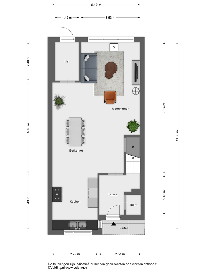 - Achtertuin 50 m2 (9 meter diep en 5.5 meter breed)