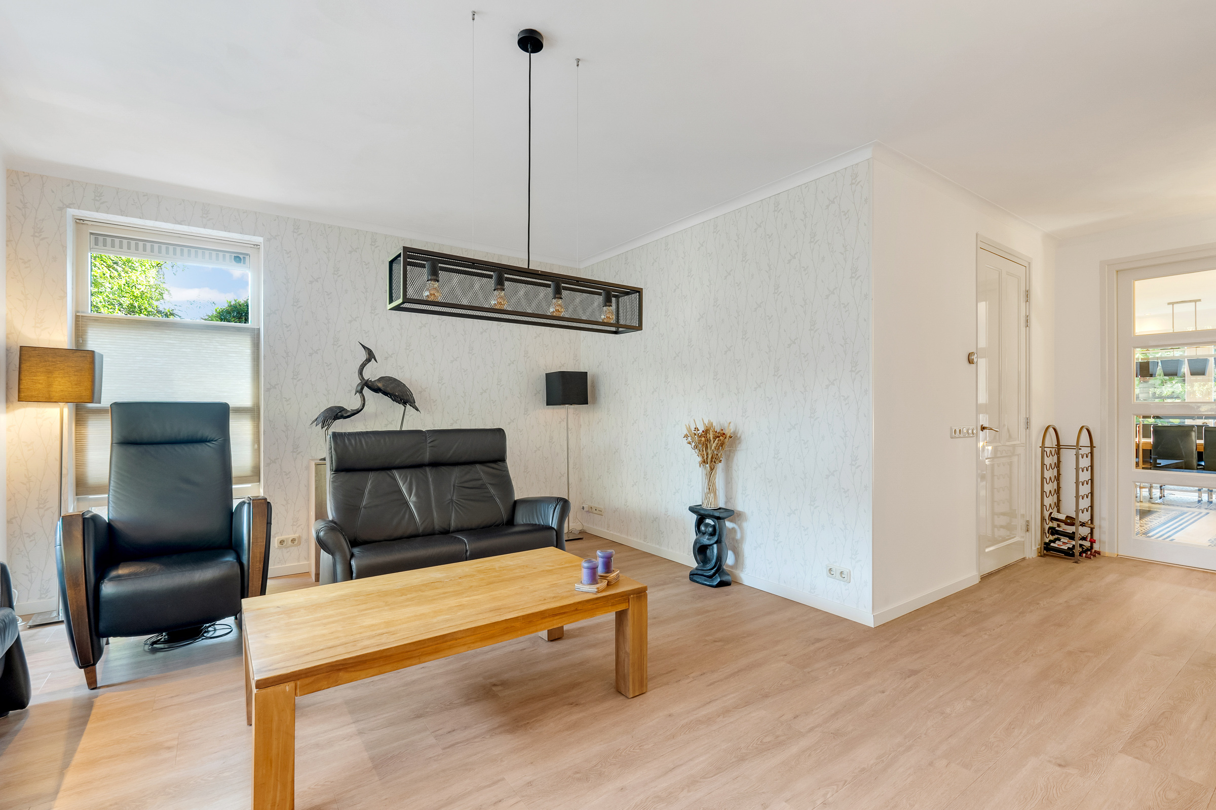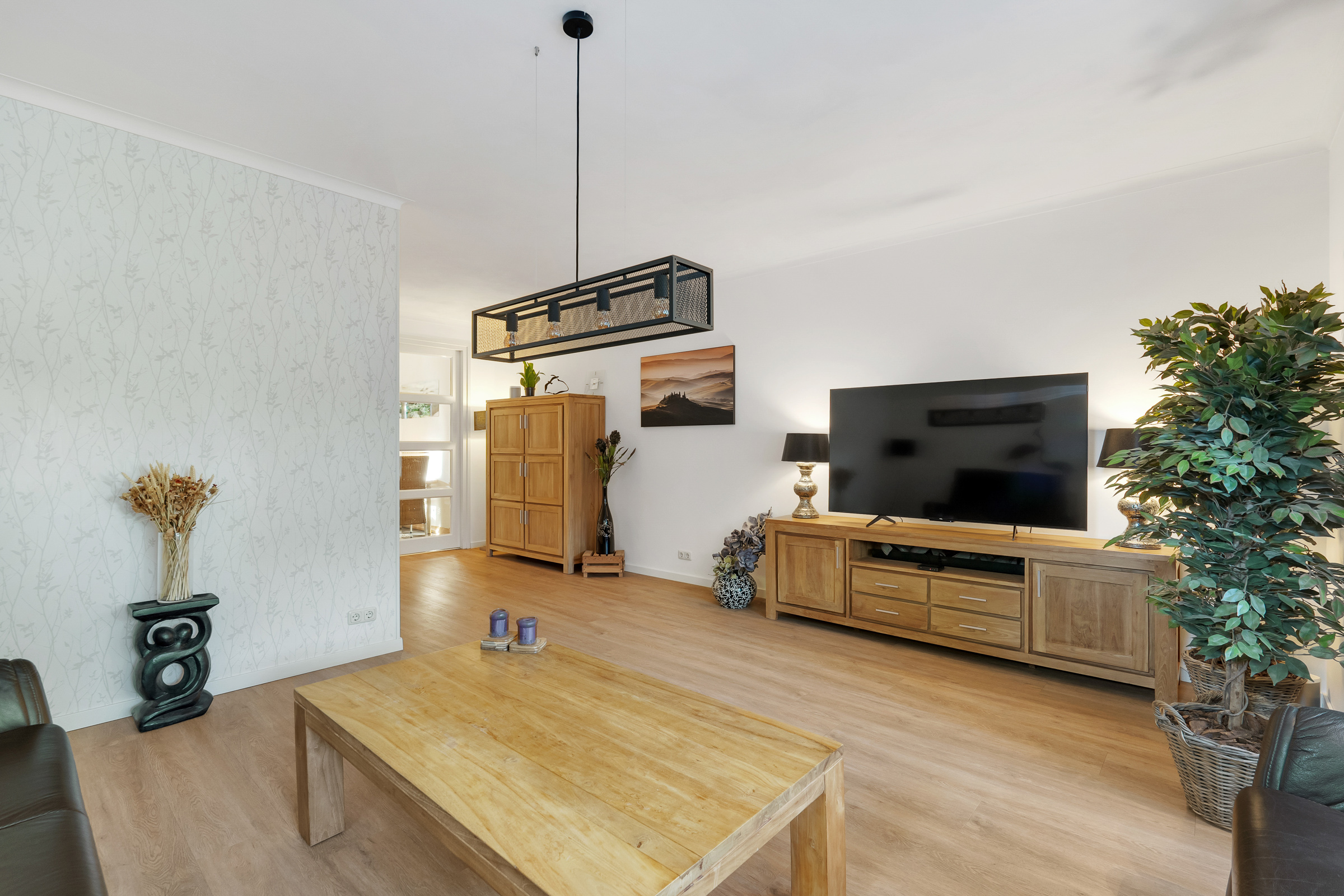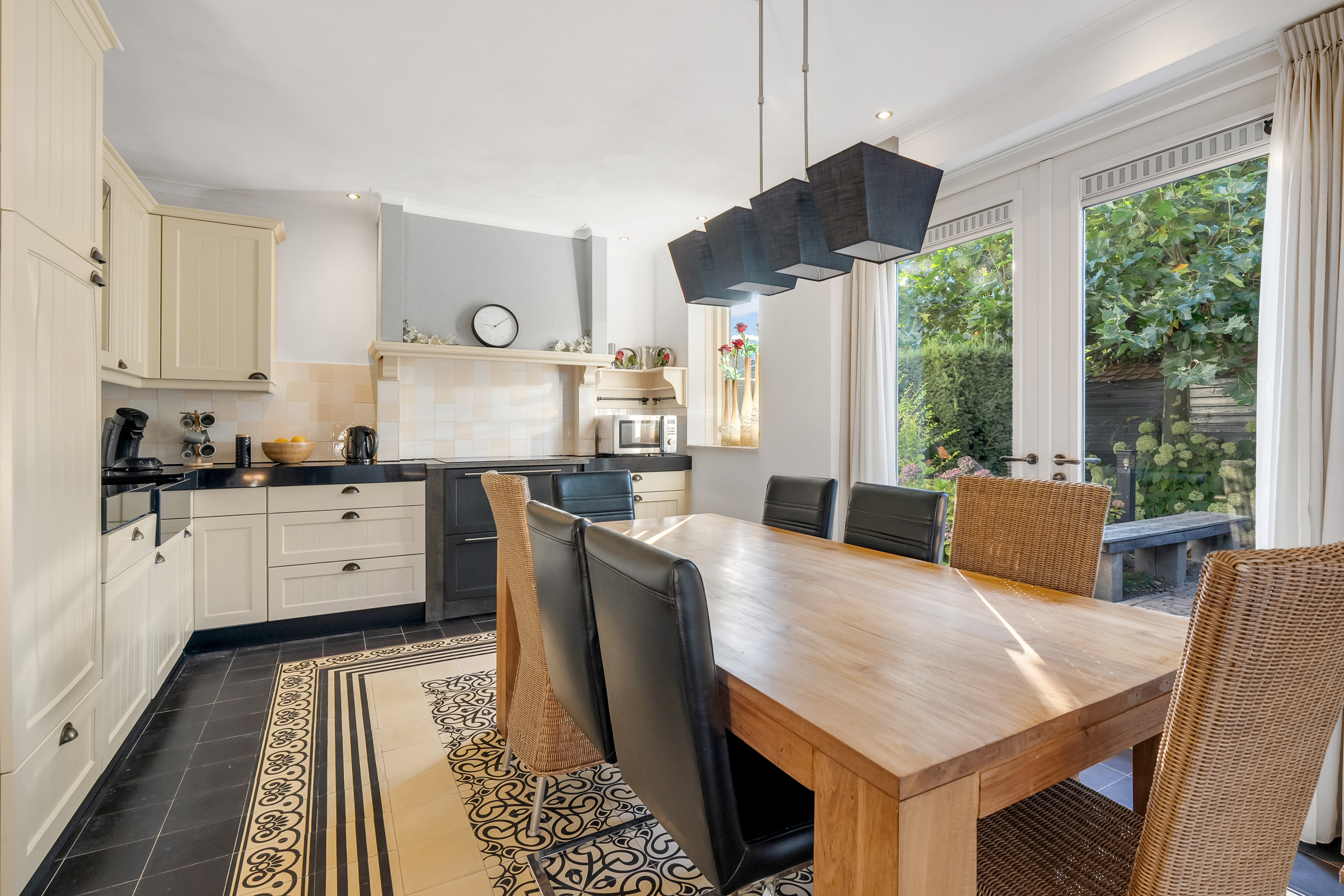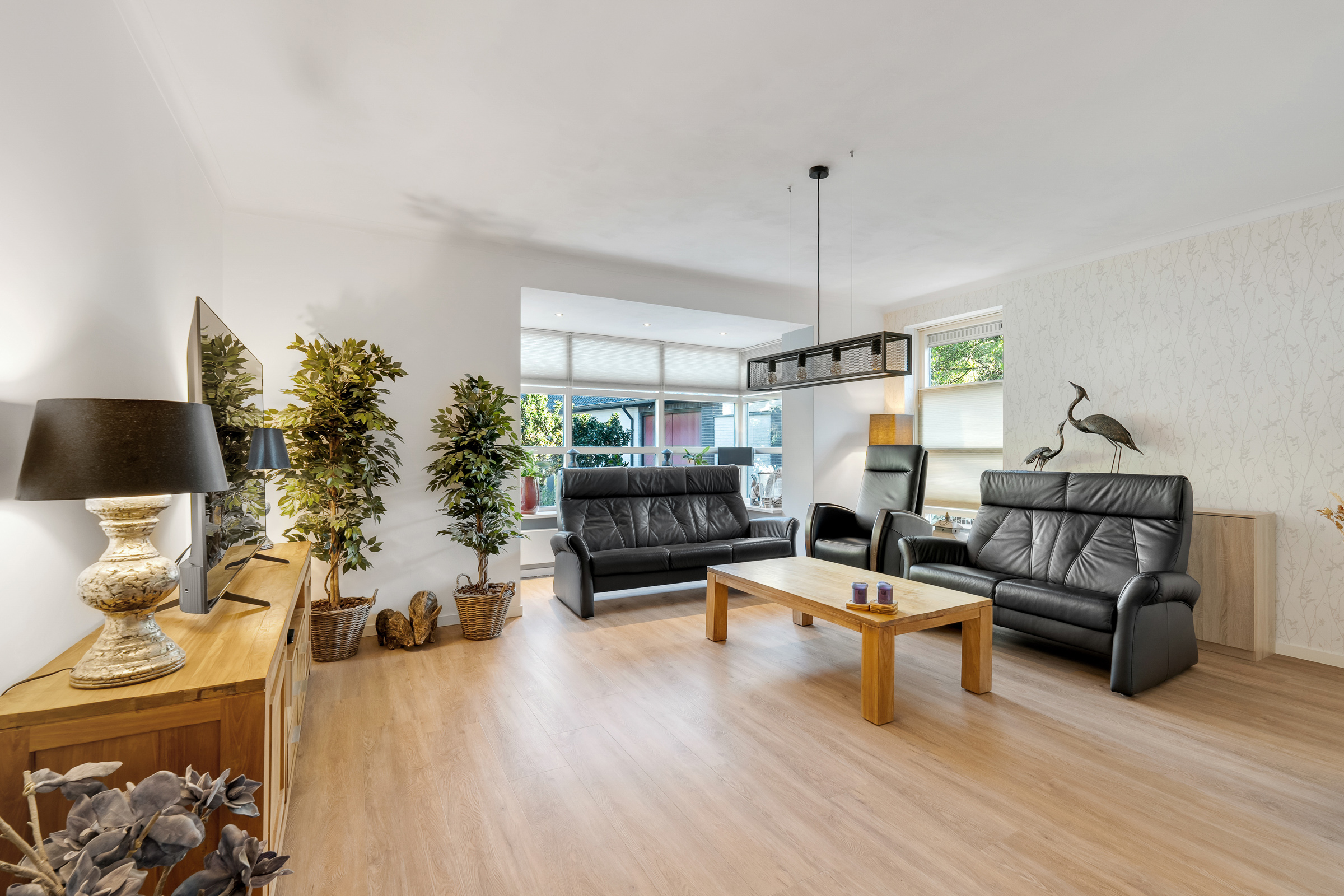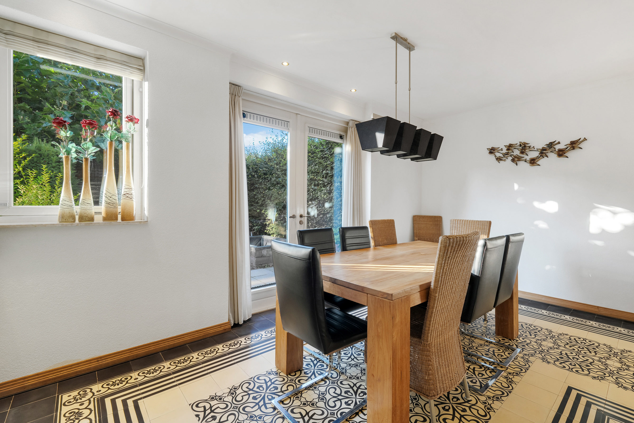 De L-vormige woonkamer en woonkeuken zijn voorzien van vloerverwarming en via de openslaande tuindeuren stap je zo de zonnige achtertuin in. Via een binnendoor komen we in de garage/berging welke bovendien, mede door de aanwezigheid van een extra toilet, geschikt is voor bijvoorbeeld een praktijk aan huis.