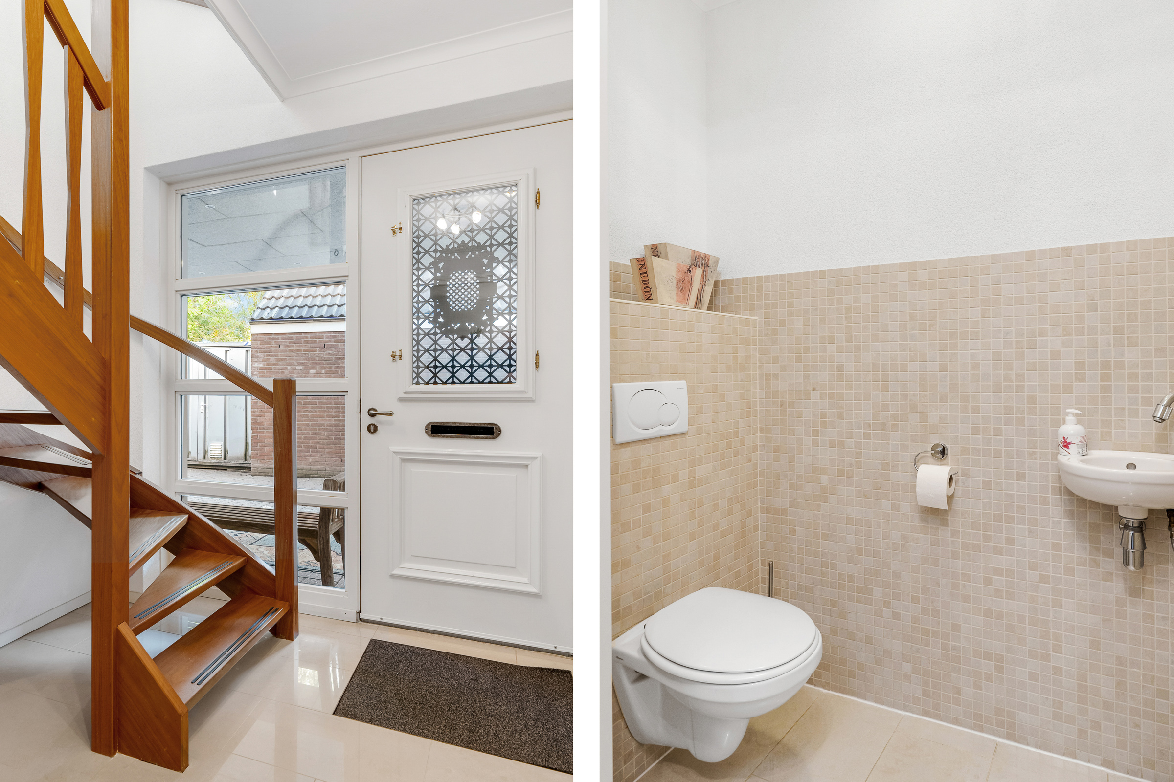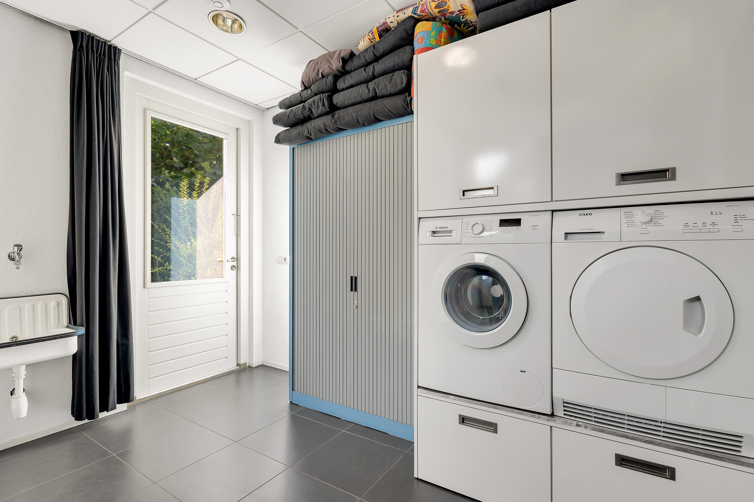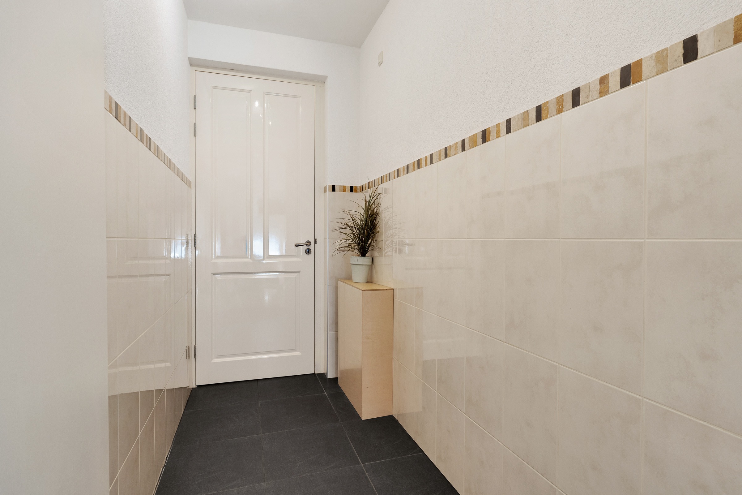 Begane grond: hal/entree met natuurstenen vloertegels v.v. vloerverwarming, toilet met fontein, meterkast, L-vormige woonkamer met pvc-vloer v.v. vloerverwarming, woonkeuken met plavuizen vloertegels v.v. vloerverwarming, keukenblok in hoekopstelling v.v. keramische kookplaat, wasemkap, koelkast en vaatwasser, tuindeuren, tussenportaal met voorraadkast, binnendoor naar garage/berging, wasmachineaansluiting, toilet.
