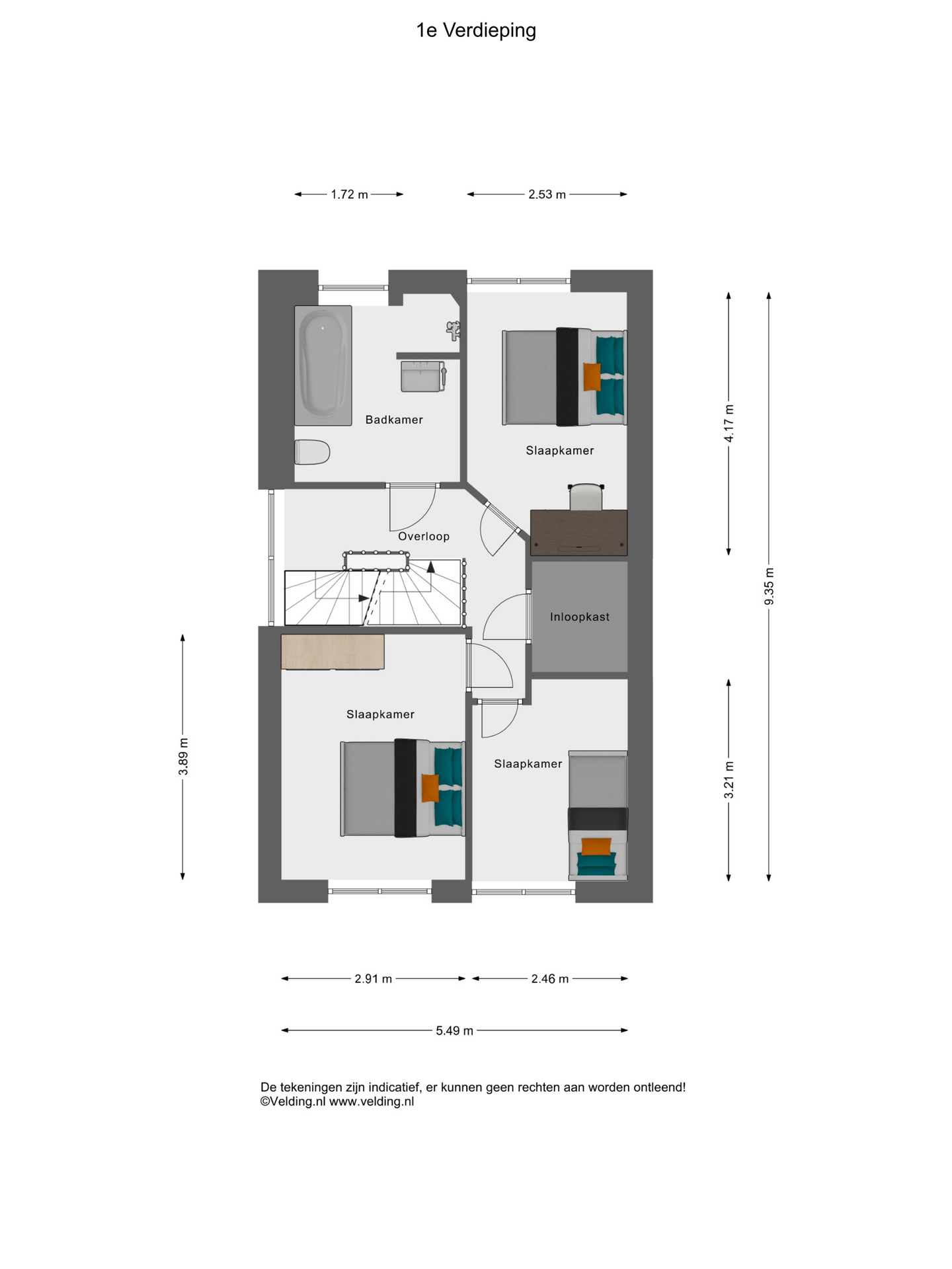 Eerste verdieping: overloop met pvc-vloer en inloopkast, 1e slaapkamer met pvc-vloer en wastafelmeubel, 2e slaapkamer met laminaatvloer, 3e slaapkamer met laminaatvloer, badkamer v.v. ligbad, douche, wastafelmeubel, toilet en vloerverwarming.