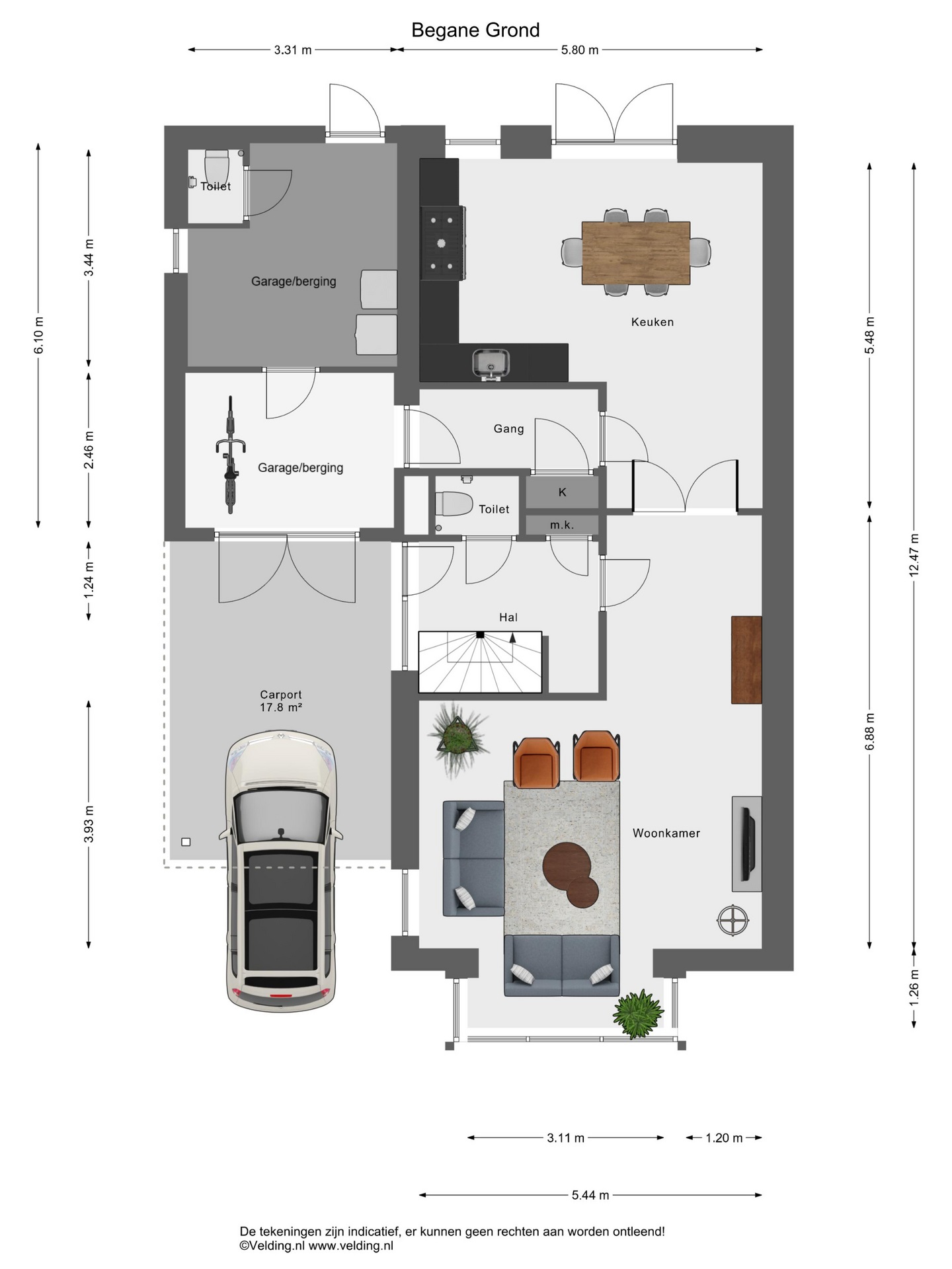 Begane grond: hal/entree met natuurstenen vloertegels v.v. vloerverwarming, toilet met fontein, meterkast, L-vormige woonkamer met pvc-vloer v.v. vloerverwarming, woonkeuken met plavuizen vloertegels v.v. vloerverwarming, keukenblok in hoekopstelling v.v. keramische kookplaat, wasemkap, koelkast en vaatwasser, tuindeuren, tussenportaal met voorraadkast, binnendoor naar garage/berging, wasmachineaansluiting, toilet.