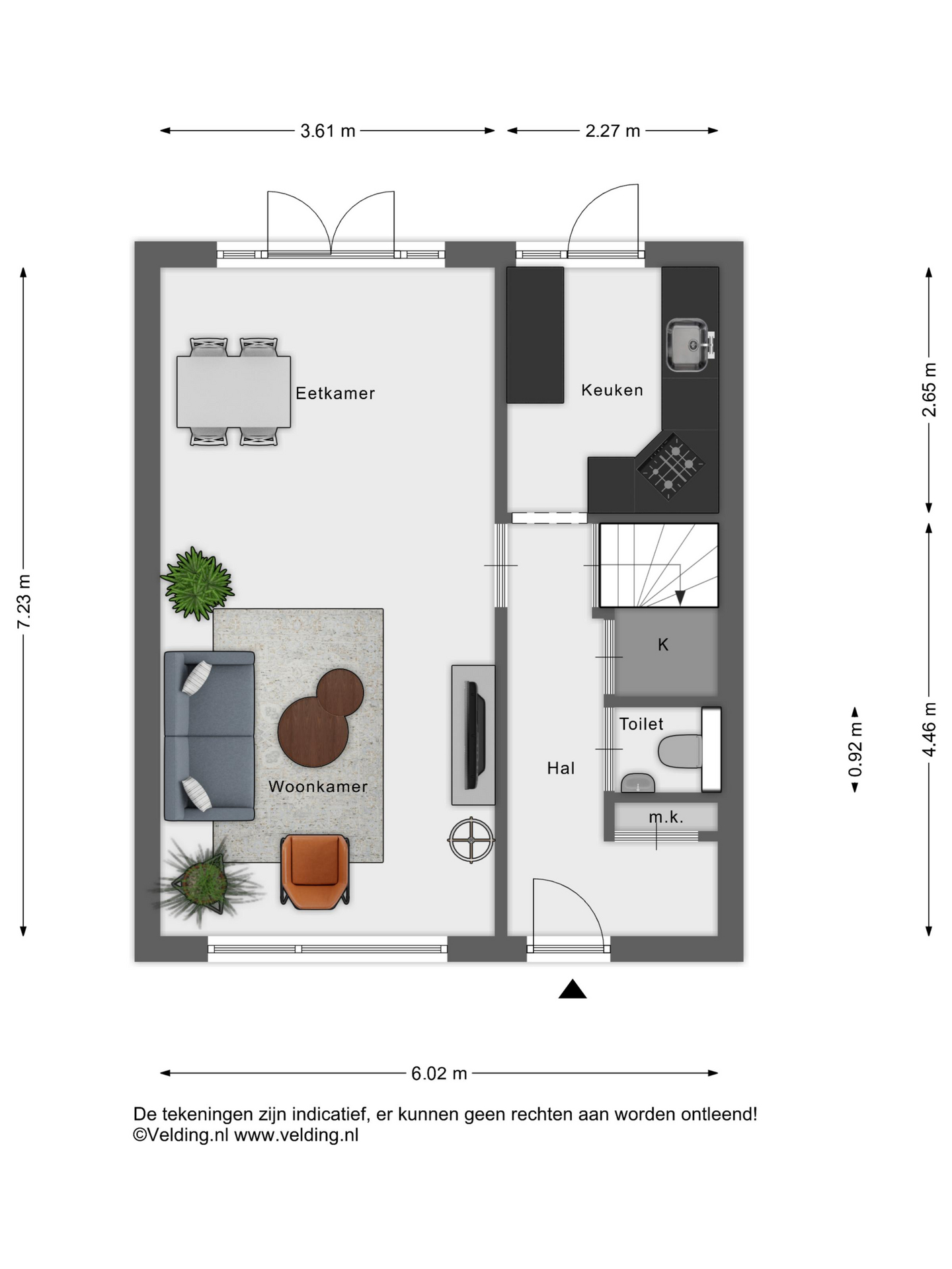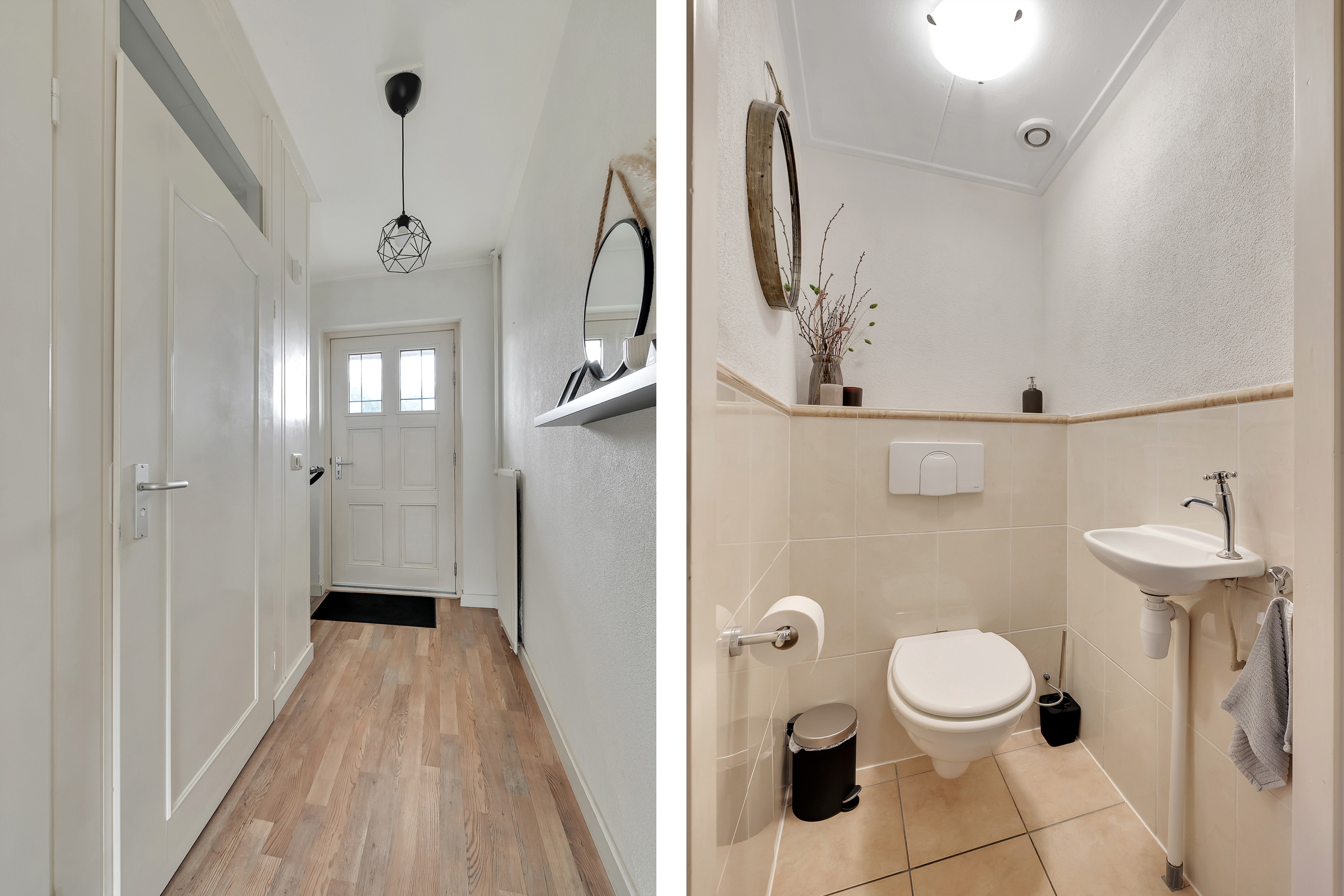 Begane grond: hal/entree, meterkast, trapopgang, toilet met fontein, trapkast, gesloten keuken met keukenblok in hoekopstelling v.v. inductiekookplaat, wasemkap, oven, koelkast en vaatwasser, doorzonwoonkamer met laminaatvloer en tuindeuren naar terras/tuin.