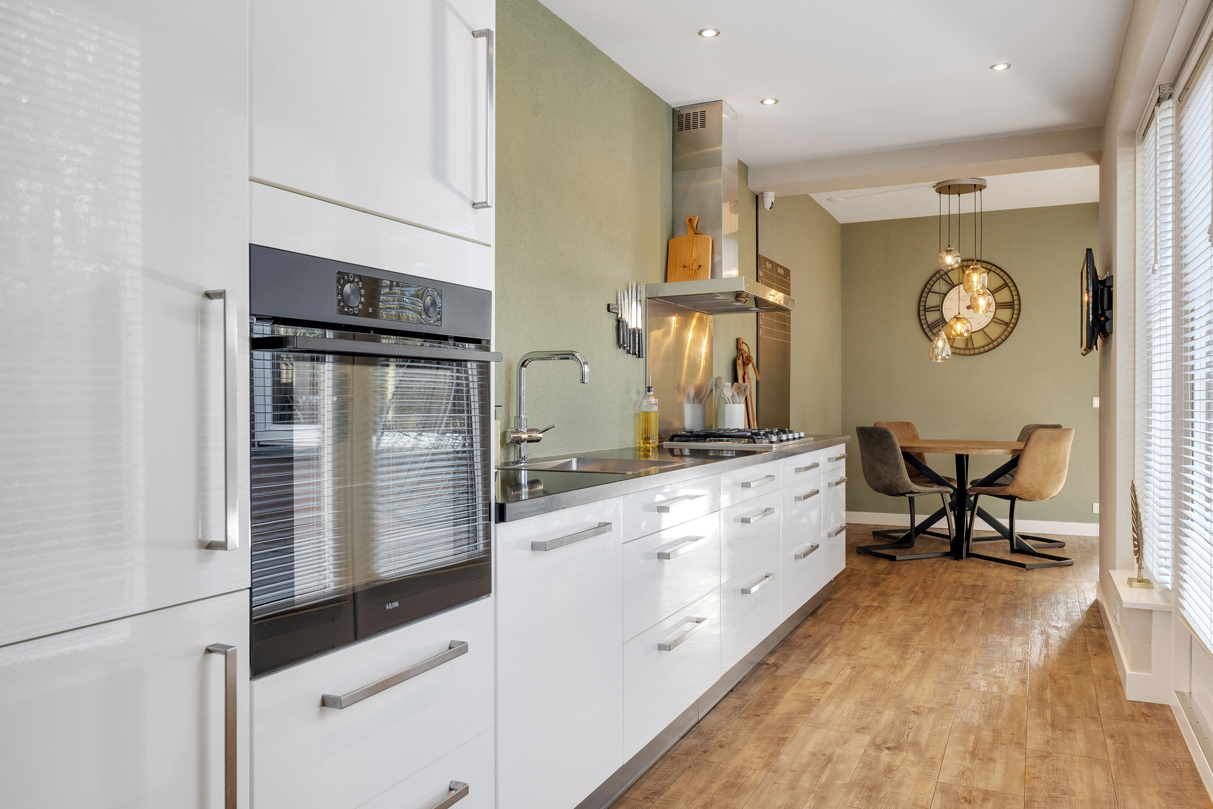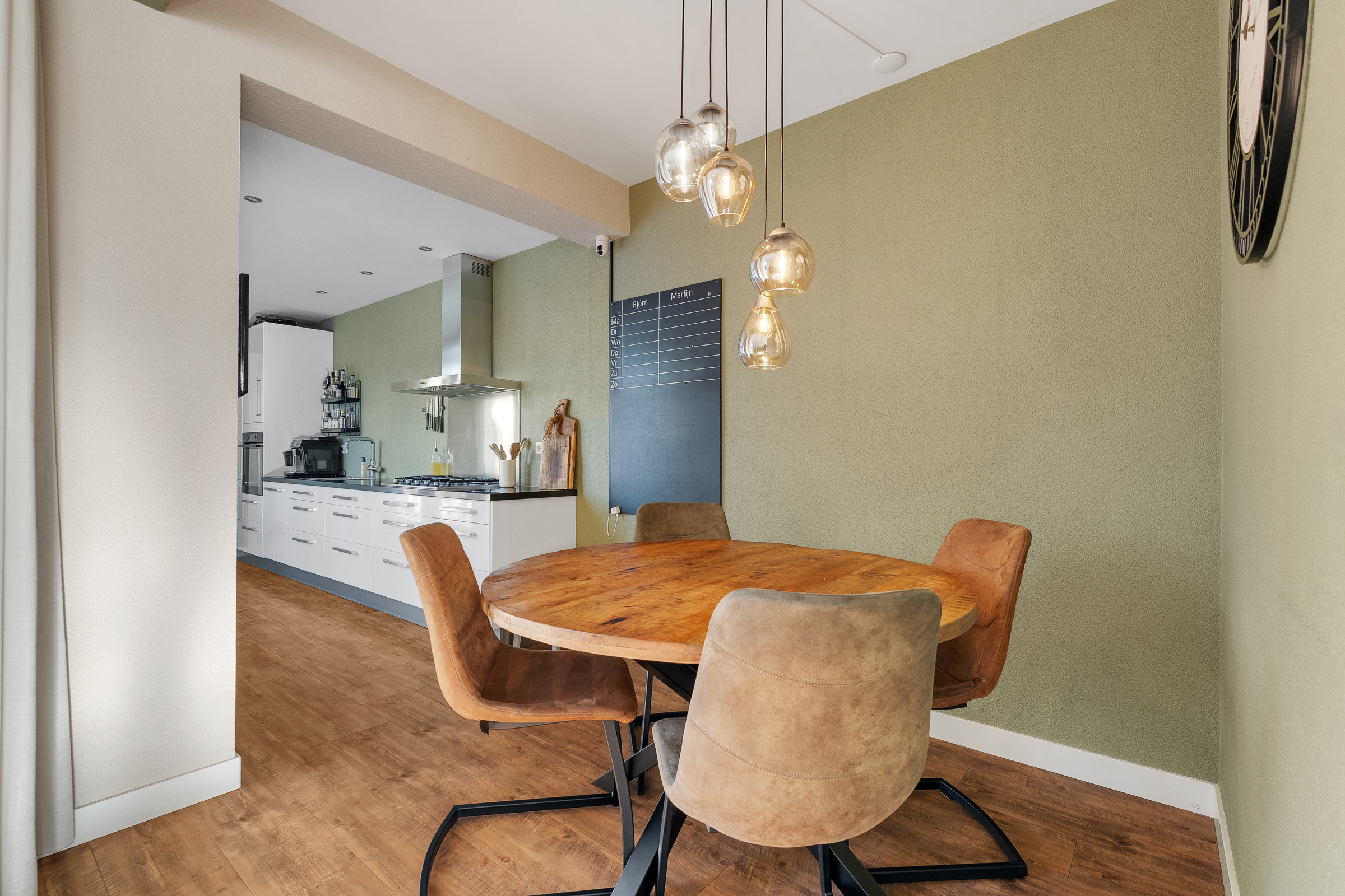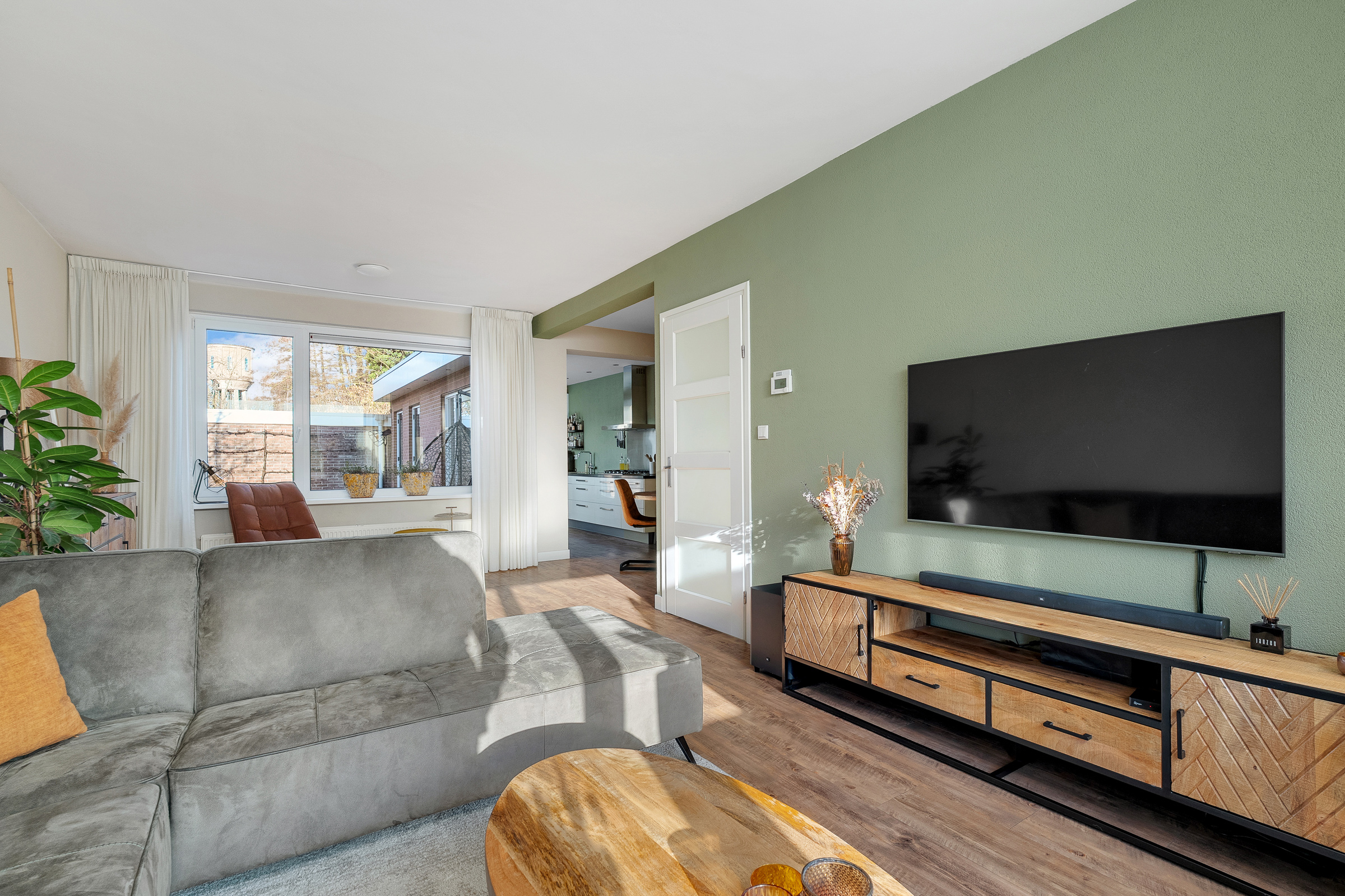 De lichte en speels ingedeelde woonkamer vormt samen met het eetgedeelte een fijne leefruimte. In het verlengde ligt de halfopen keuken, die in 2012 is aangebouwd en werkelijk van alle gemakken is voorzien. De moderne keuken beschikt over diverse inbouwapparatuur, een elektrische boiler, warmwaterkraan en vloerverwarming! Dankzij de openslaande deuren naar de tuin wordt binnen moeiteloos met buiten verbonden. In de zomer zet je alles open en betrek je het terras optimaal bij de woonruimte – heerlijk genieten! Via de praktische bijkeuken met volop kastruimte loop je binnendoor door naar de garage, ideaal voor extra opslag of hobbyruimte.
