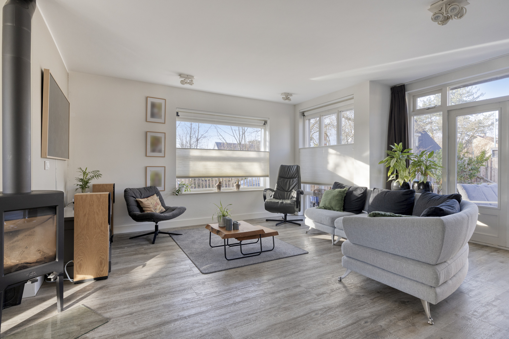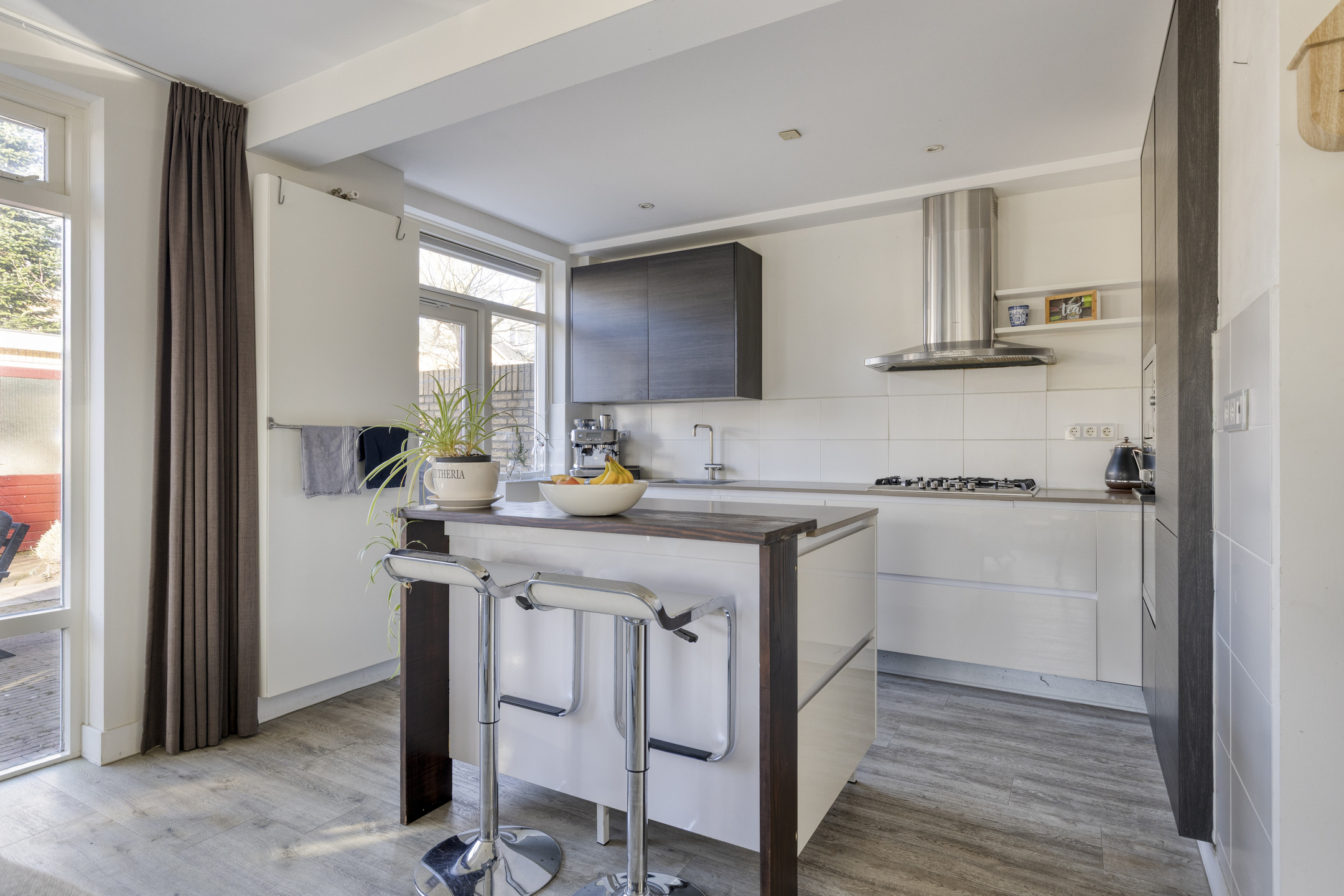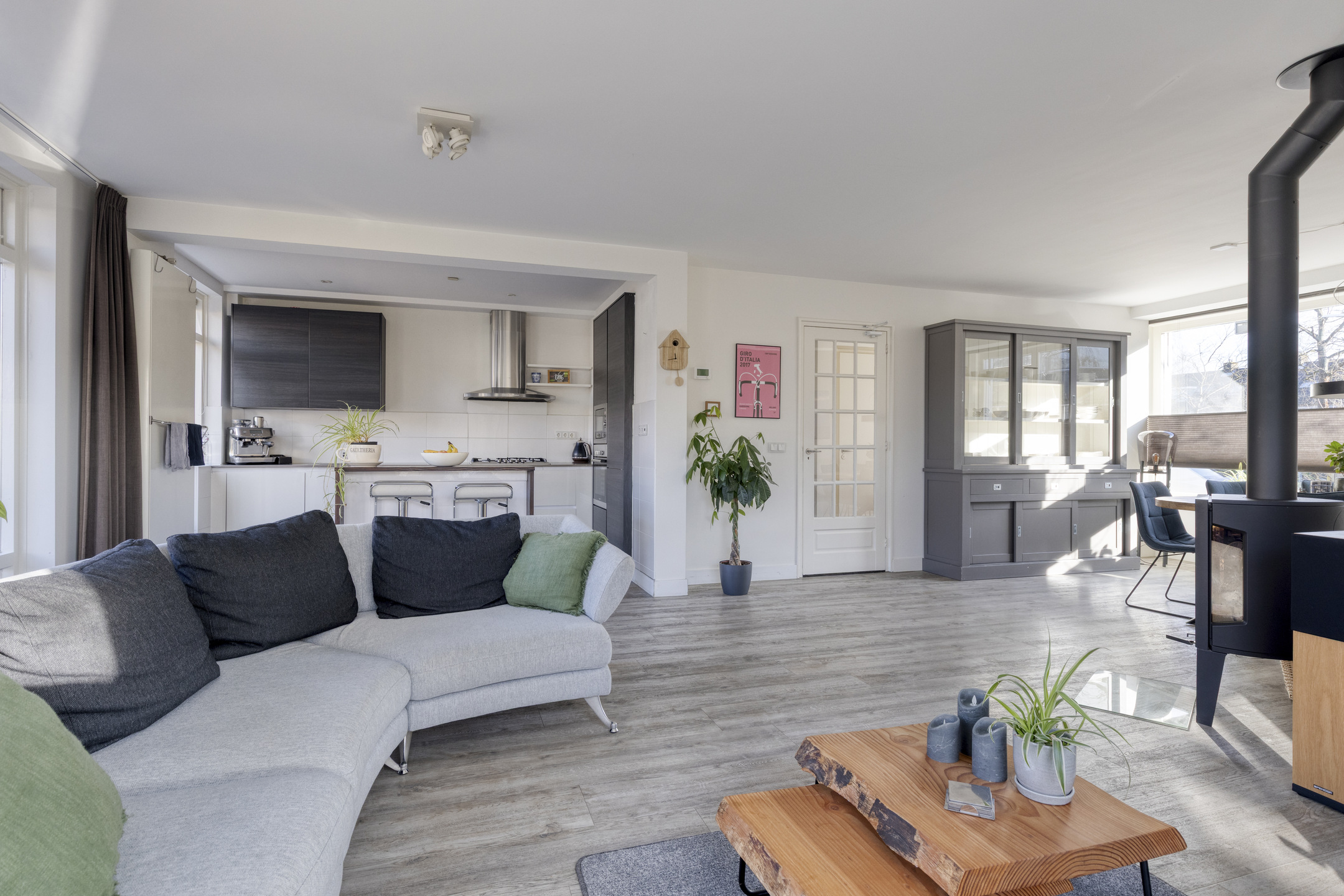 U betreedt de woning via de ruime voortuin. In de hal vindt u een modern toilet, de trapopgang en toegang tot het woongedeelte. De woonkamer is aan de zijkant uitgebouwd, waardoor het daglicht van drie zijdes het woongedeelte binnenvalt. Het zitgedeelte is deels gesitueerd in fraaie zijaanbouw en tevens voorzien van comfortabele houtkachel. Het eetgedeelte aan de voorzijde, met grote raampartij, biedt een royale plek voor gezellige diners. De open keuken met eiland heeft een moderne, praktische indeling en is uitgevoerd in een lichte kleurstelling met composiet werkbladen. De keuken is voorzien van diverse inbouwapparatuur, waaronder een gaskookplaat, afzuigkap, oven, magnetron, vaatwasser en een koel-/vriescombinatie. Vanuit de keuken kijkt u uit over het zitgedeelte en de royale achtertuin. De gehele begane grond is voorzien van een gerenoveerde, geïsoleerde betonvloer met comfortabele vloerverwarming en is verder keurig afgewerkt met gestuukte wanden en plafonds.