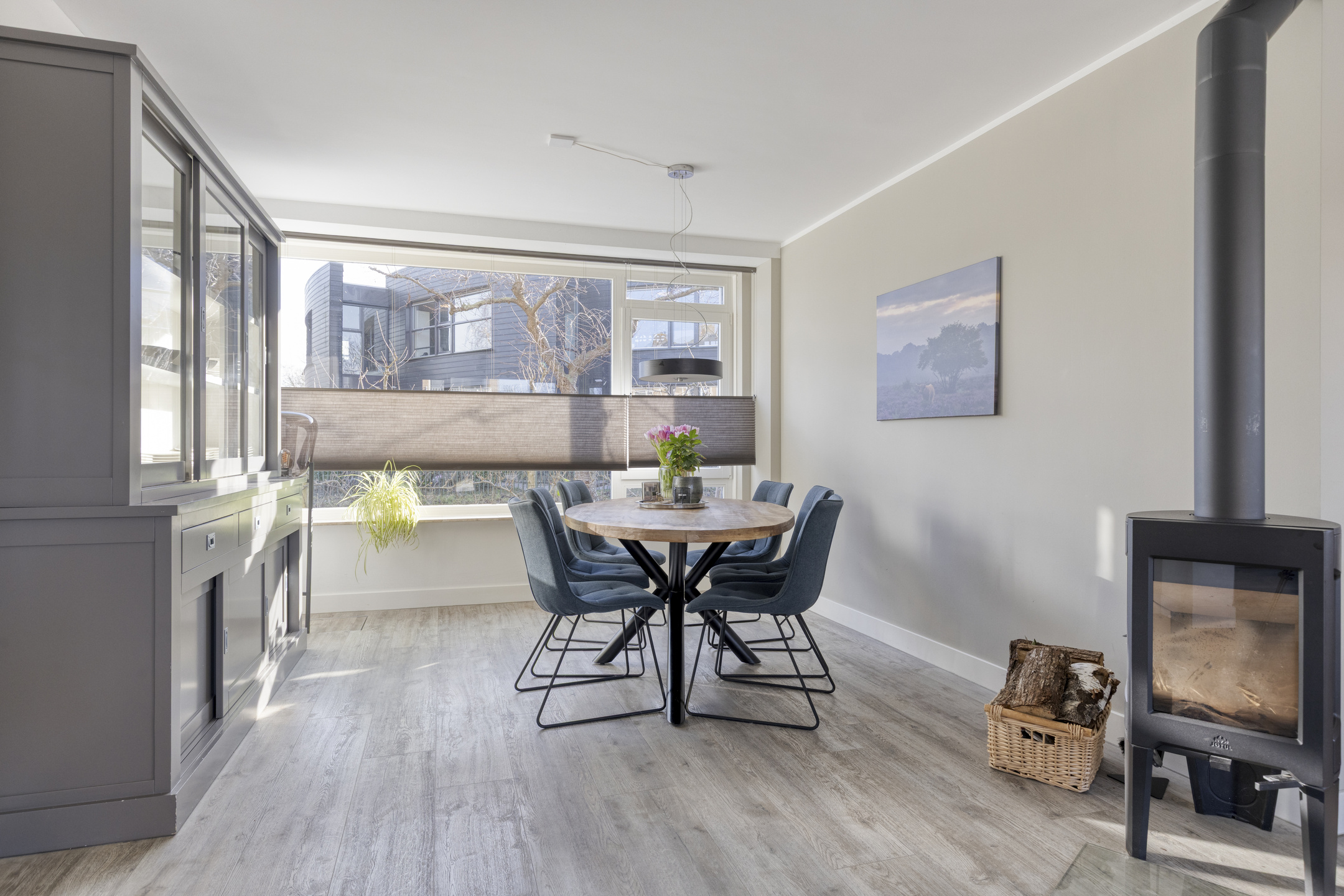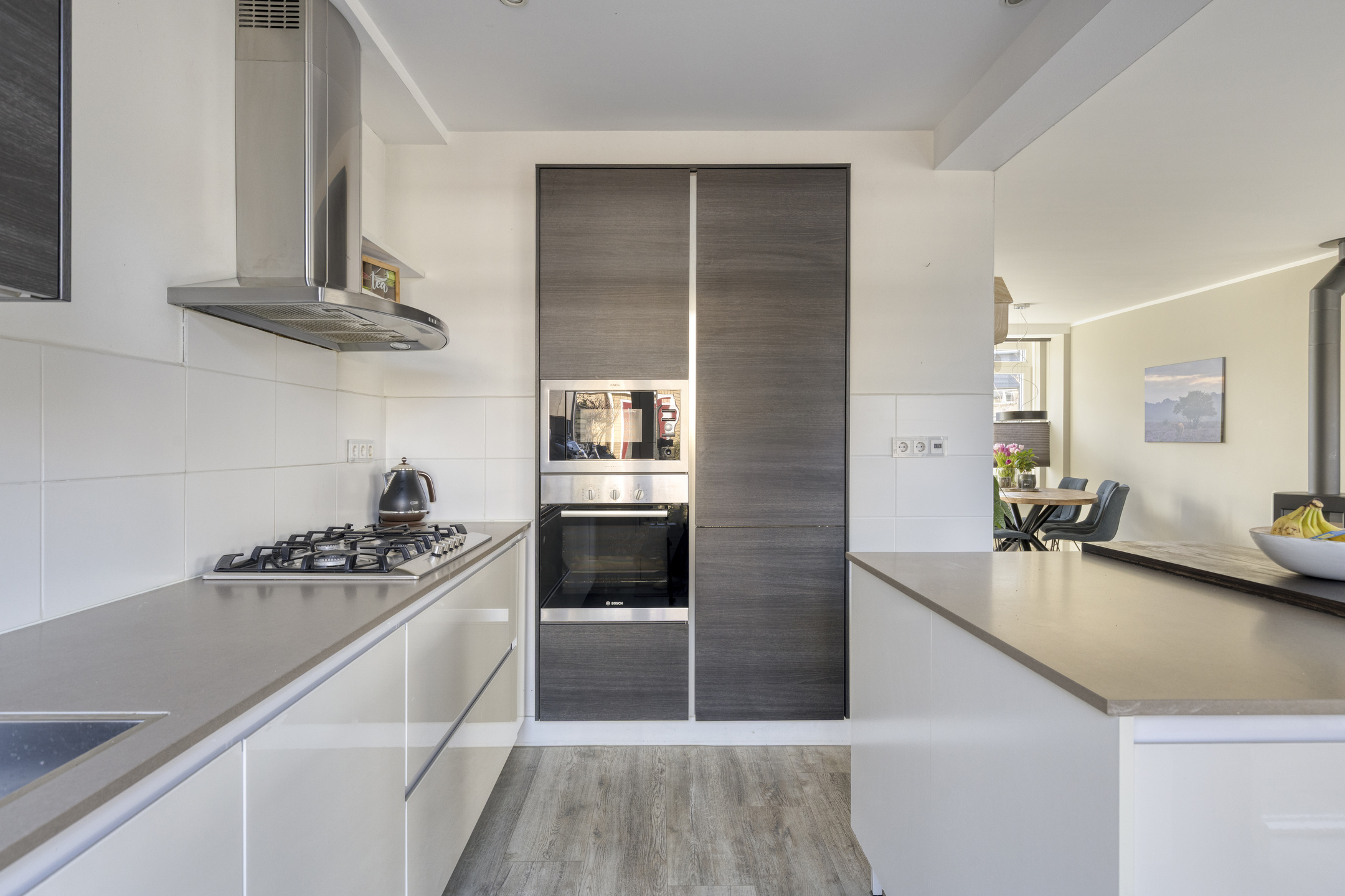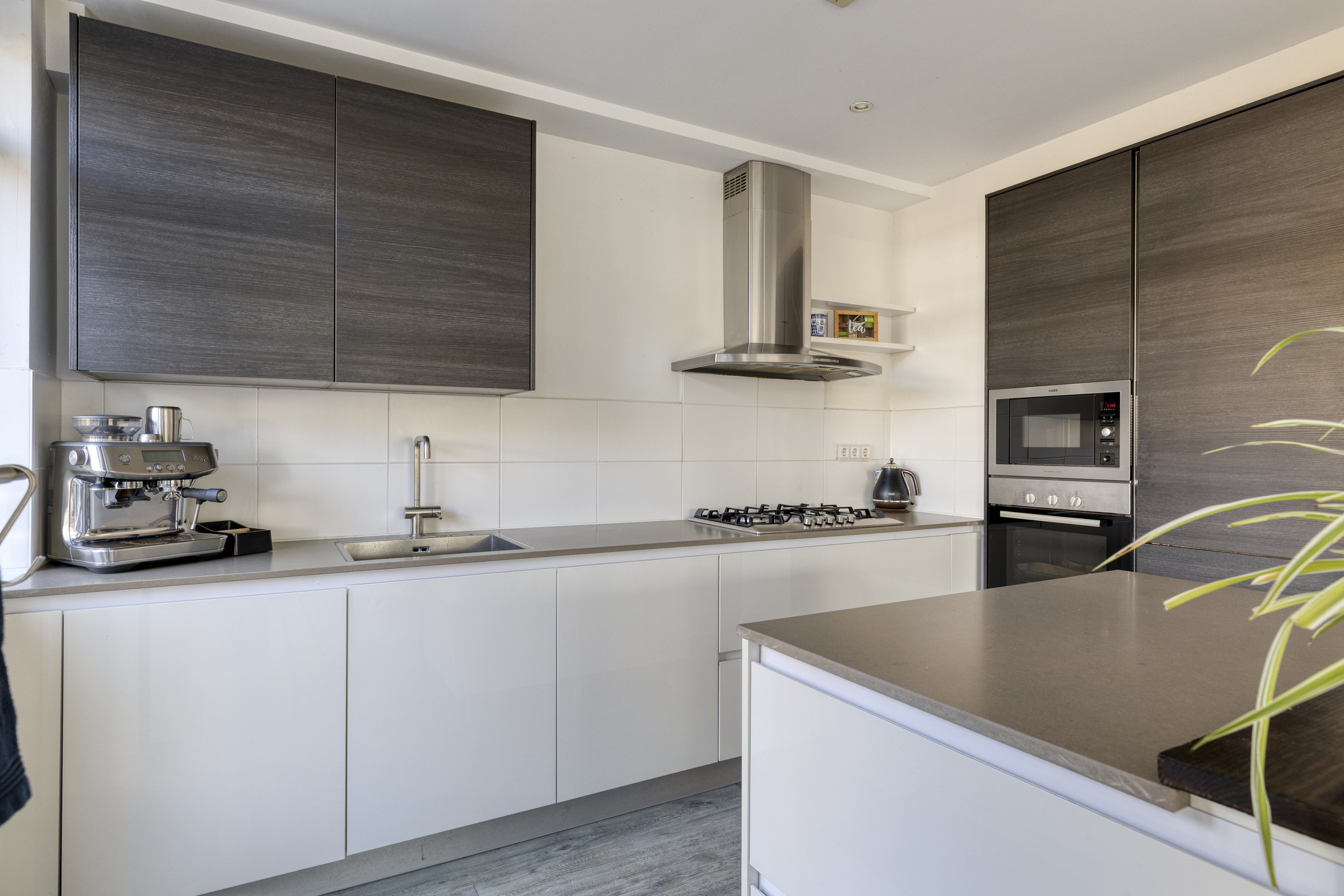 U betreedt de woning via de ruime voortuin. In de hal vindt u een modern toilet, de trapopgang en toegang tot het woongedeelte. De woonkamer is aan de zijkant uitgebouwd, waardoor het daglicht van drie zijdes het woongedeelte binnenvalt. Het zitgedeelte is deels gesitueerd in fraaie zijaanbouw en tevens voorzien van comfortabele houtkachel. Het eetgedeelte aan de voorzijde, met grote raampartij, biedt een royale plek voor gezellige diners. De open keuken met eiland heeft een moderne, praktische indeling en is uitgevoerd in een lichte kleurstelling met composiet werkbladen. De keuken is voorzien van diverse inbouwapparatuur, waaronder een gaskookplaat, afzuigkap, oven, magnetron, vaatwasser en een koel-/vriescombinatie. Vanuit de keuken kijkt u uit over het zitgedeelte en de royale achtertuin. De gehele begane grond is voorzien van een gerenoveerde, geïsoleerde betonvloer met comfortabele vloerverwarming en is verder keurig afgewerkt met gestuukte wanden en plafonds.