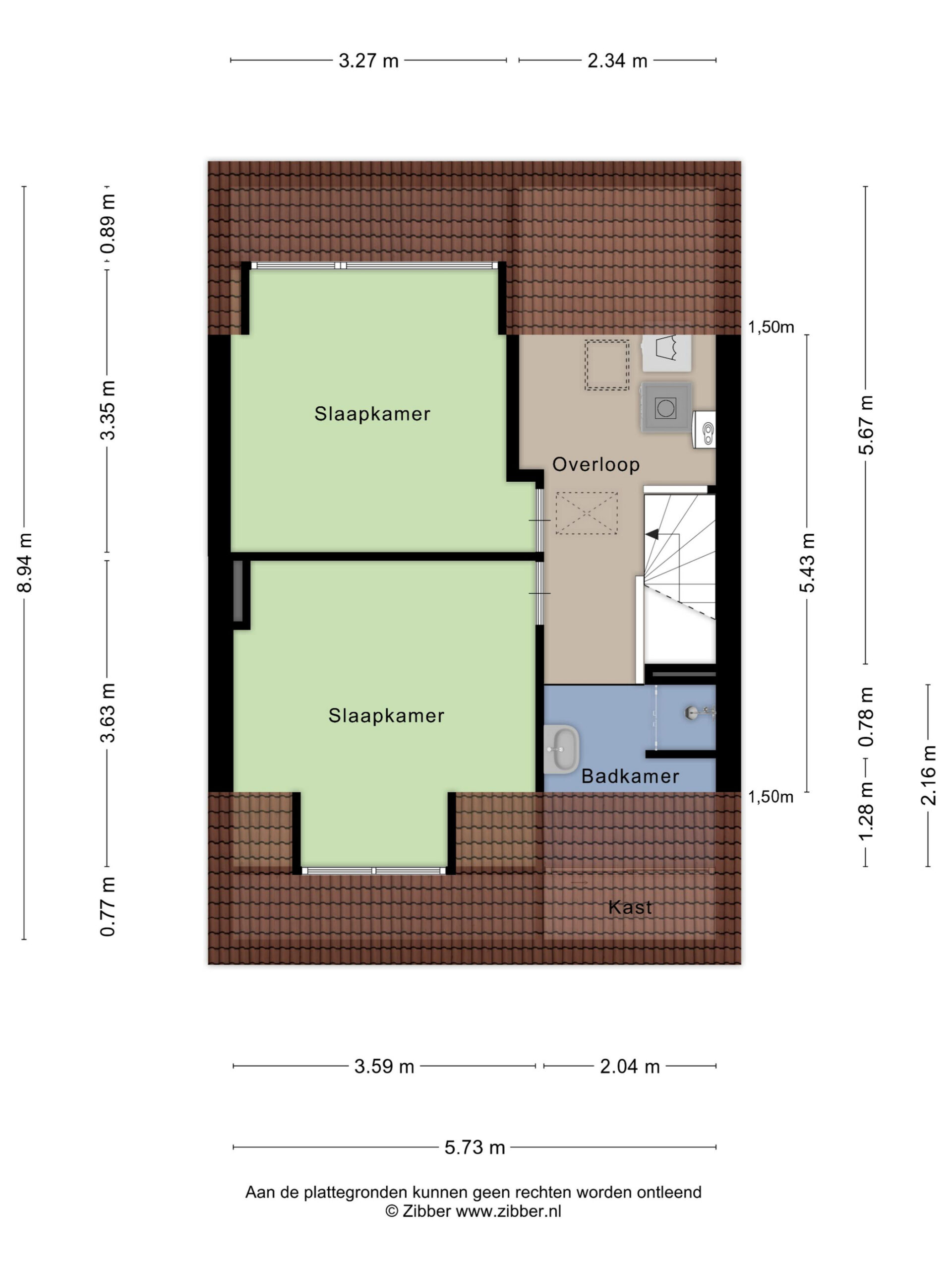 De tweede verdieping biedt twee ruime slaapkamers, beide voorzien van een dakkapel. Op de royale overloop is de cv-installatie geplaatst. Hier bevinden zich ook de aansluitingen voor de wasmachine en droger. Verder bevindt zich op deze verdieping een tweede badkamer, uitgerust met een douche en wastafel. Deze verdieping beschikt tevens over tal van opbergruimtes en een vliering.