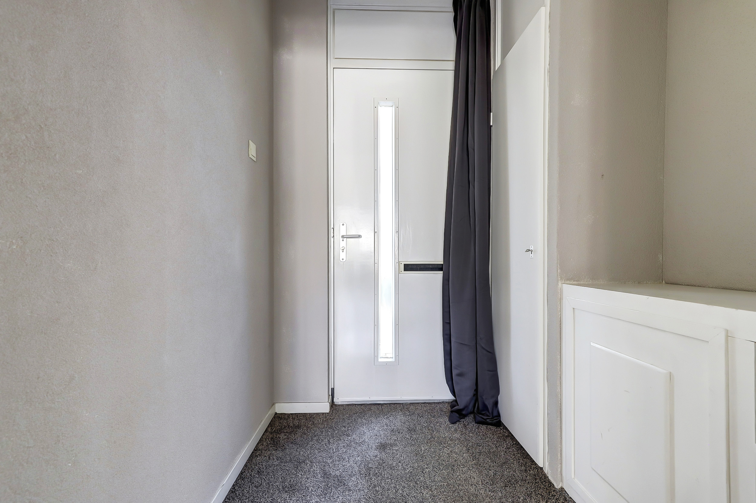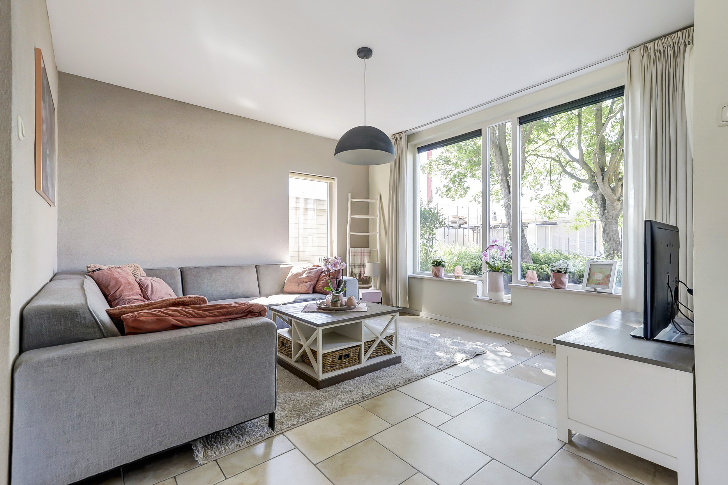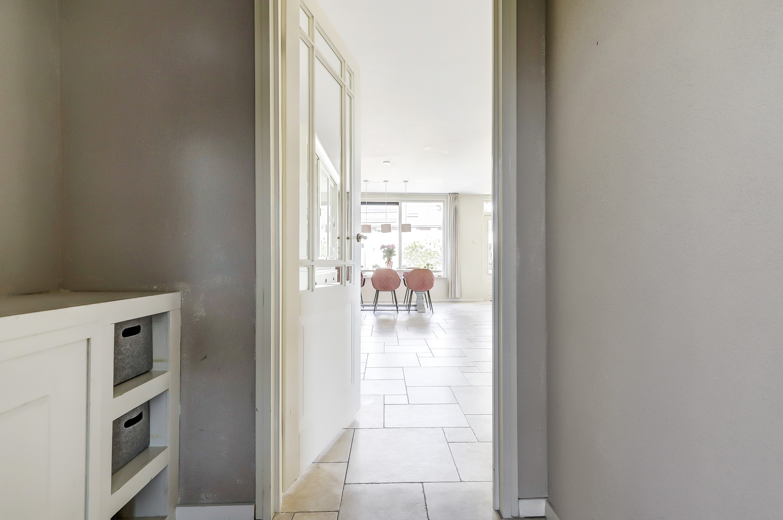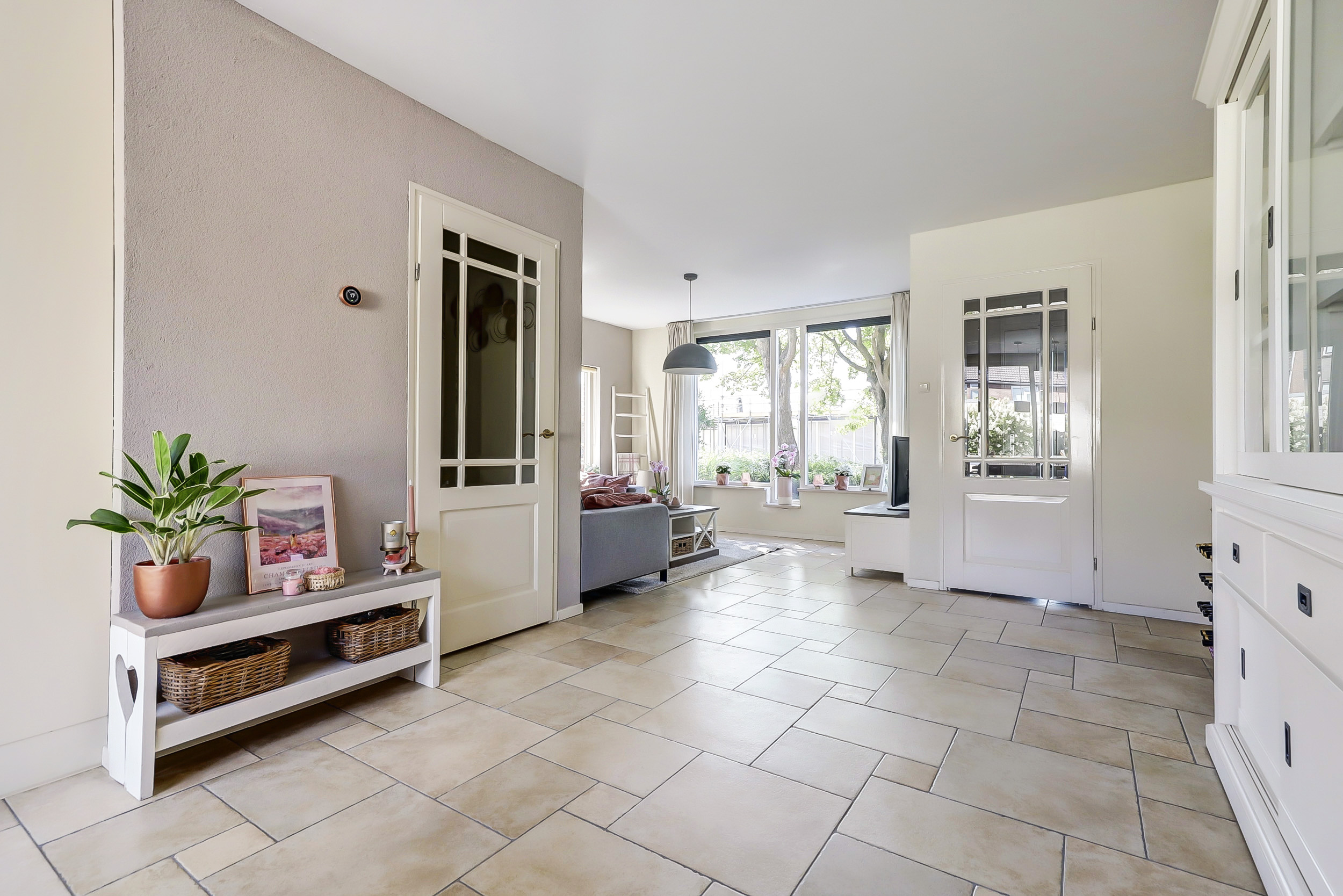 De netjes aangelegde voortuin leidt naar de voordeur van de woning. Bij binnenkomst in de hal vind je de meterkast en de deur naar de woonkamer. De ruime en lichte doorzonwoonkamer valt direct op door de grote raampartijen aan de voor- en achterzijde, die zorgen voor een prettige lichtinval.