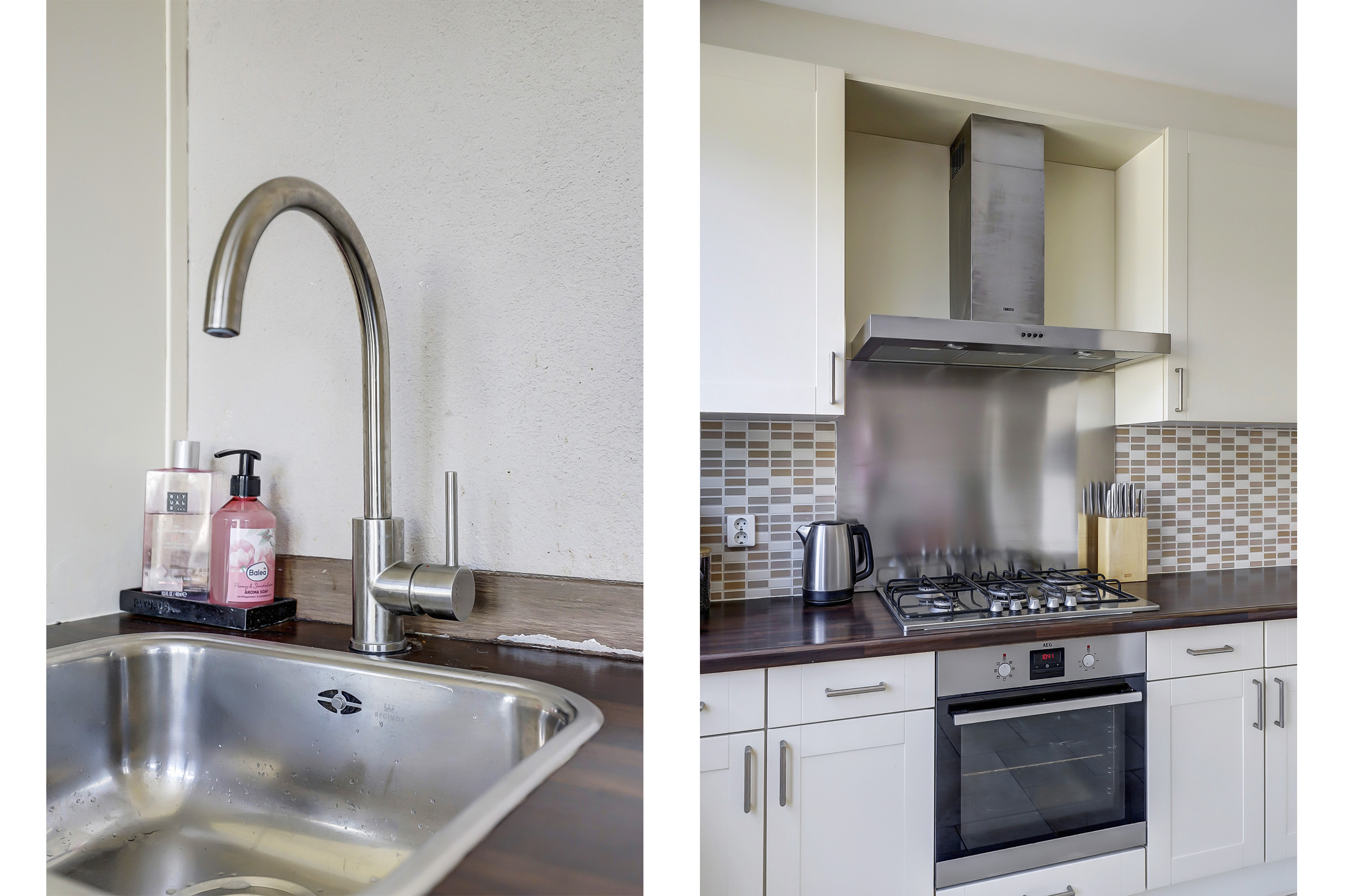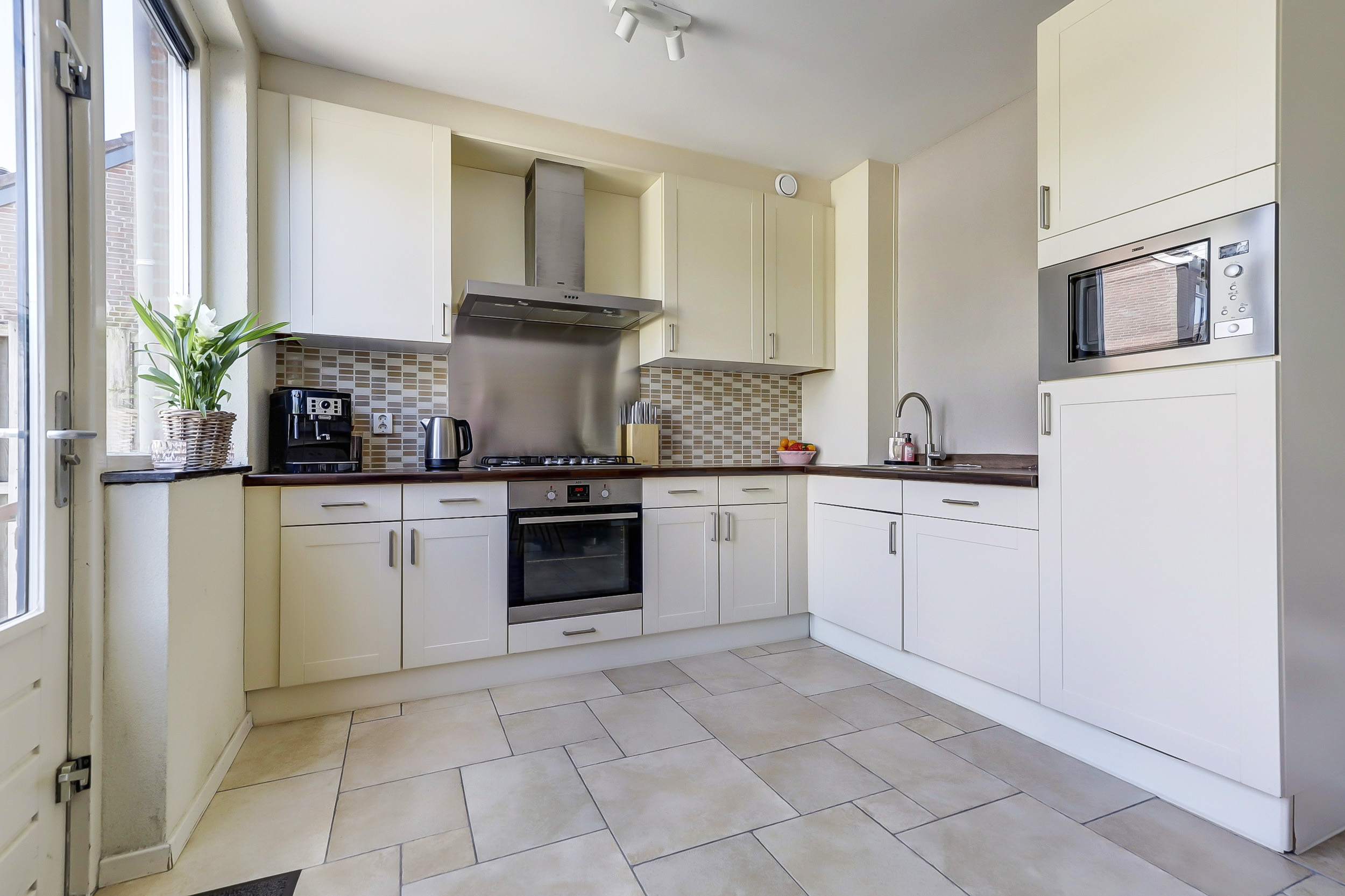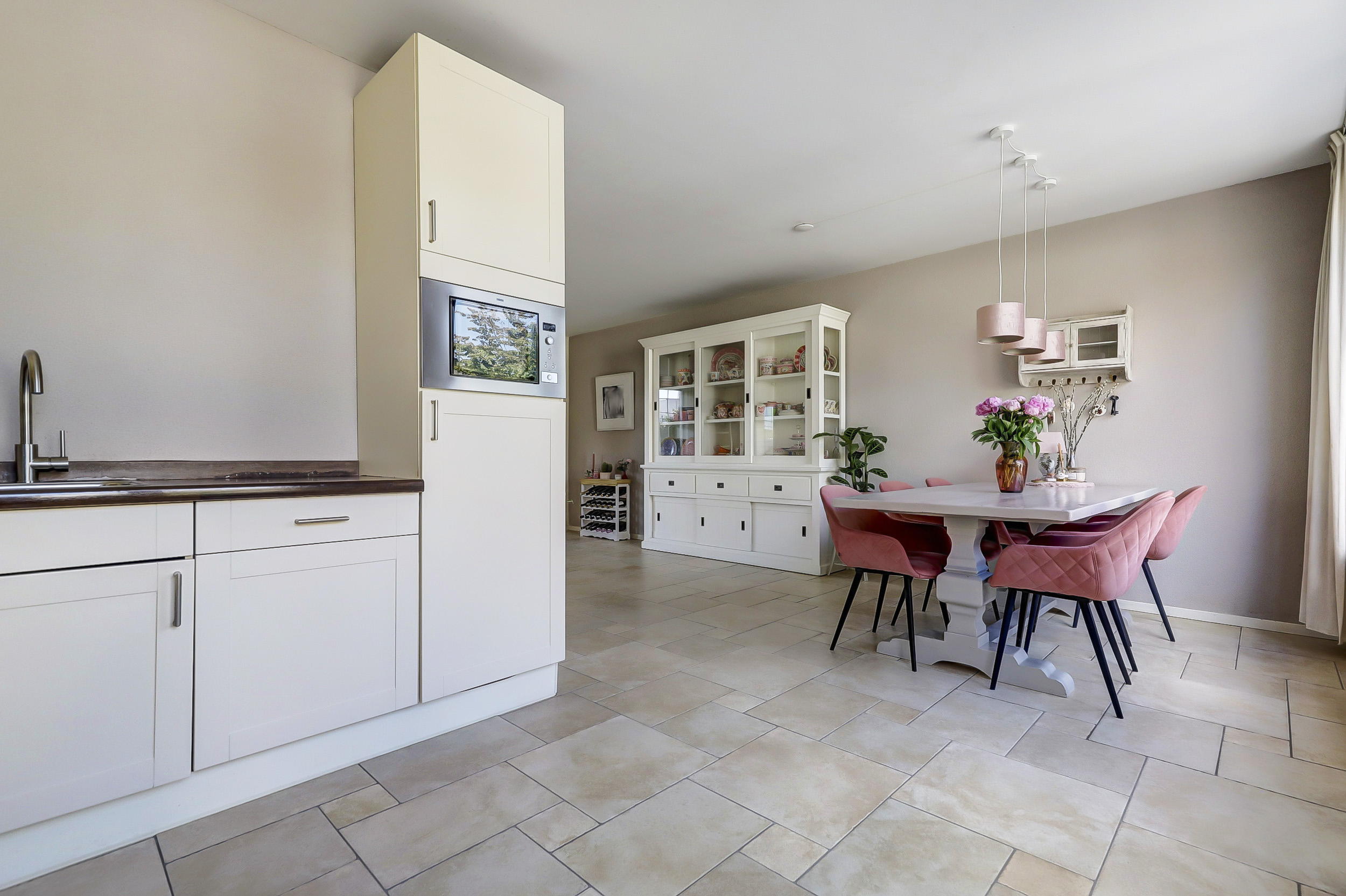 De neutrale tegelvloer en strakke afwerking maken de ruimte zowel sfeervol als onderhoudsvriendelijk. Aan de achterzijde is een open eetkamer gesitueerd, met direct toegang tot de tuin. De moderne hoekkeuken sluit hier perfect op aan en is uitgevoerd in lichte kleuren. Deze is voorzien van alle wenselijke inbouwapparatuur: een oven, gaskookplaat, afzuigkap, koelkast en magnetron. Een keuken die zowel praktisch als stijlvol is ingericht.