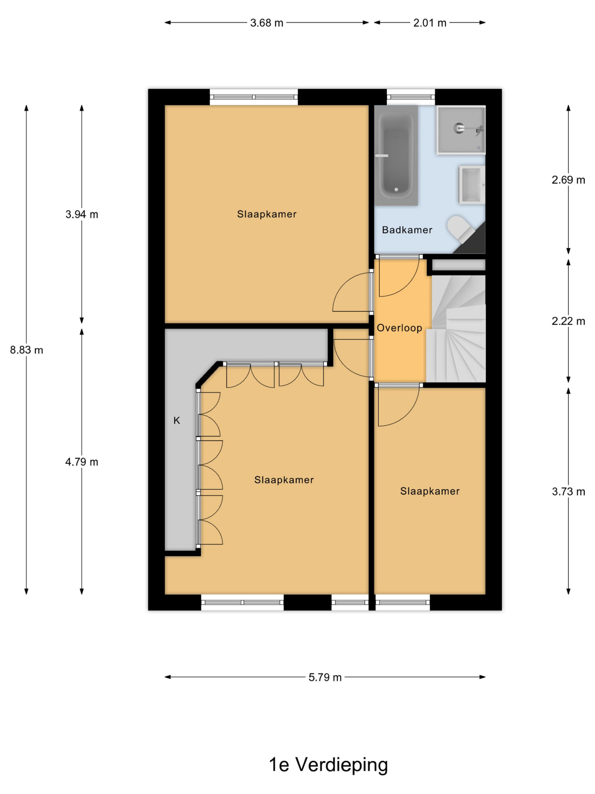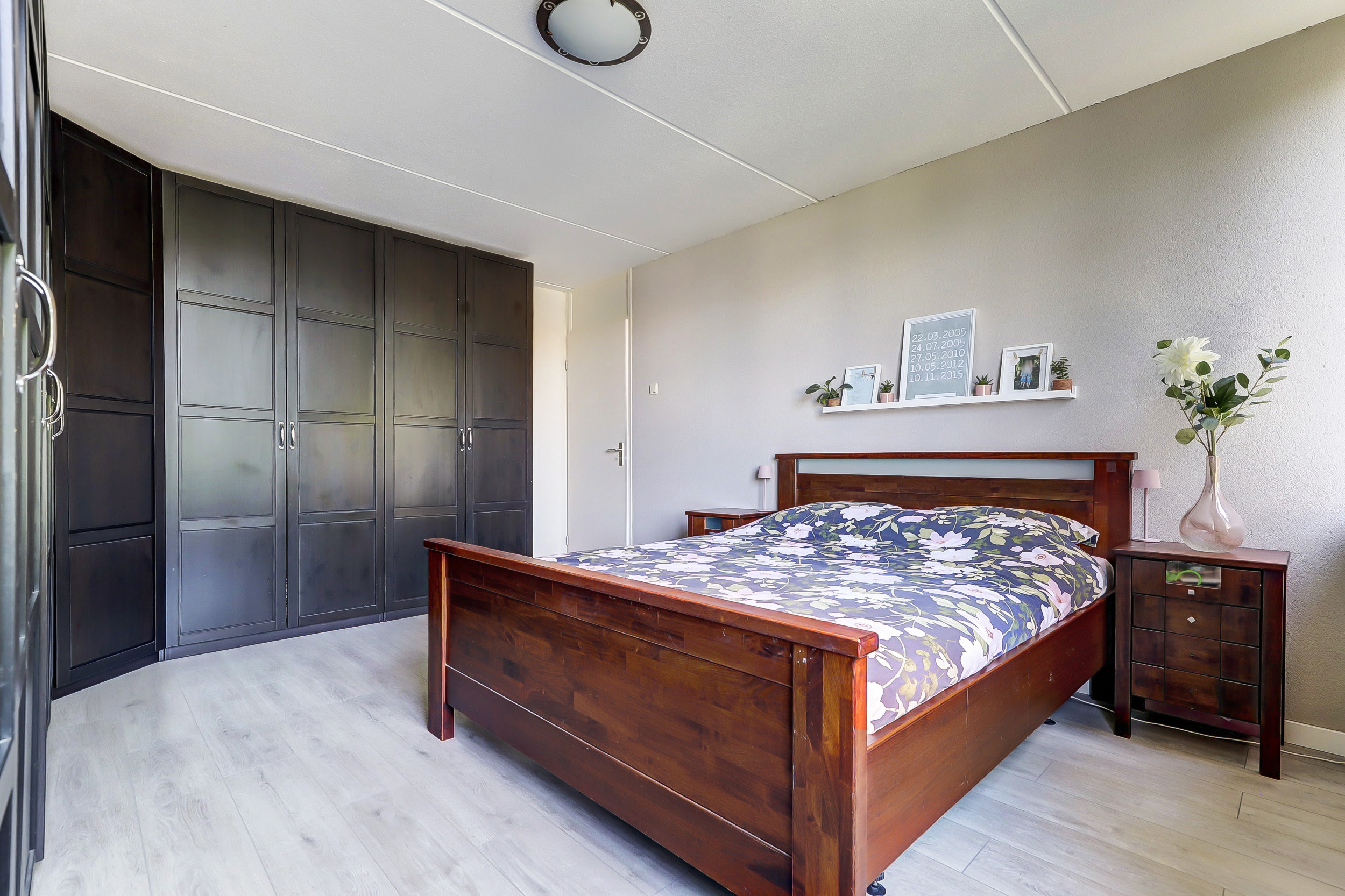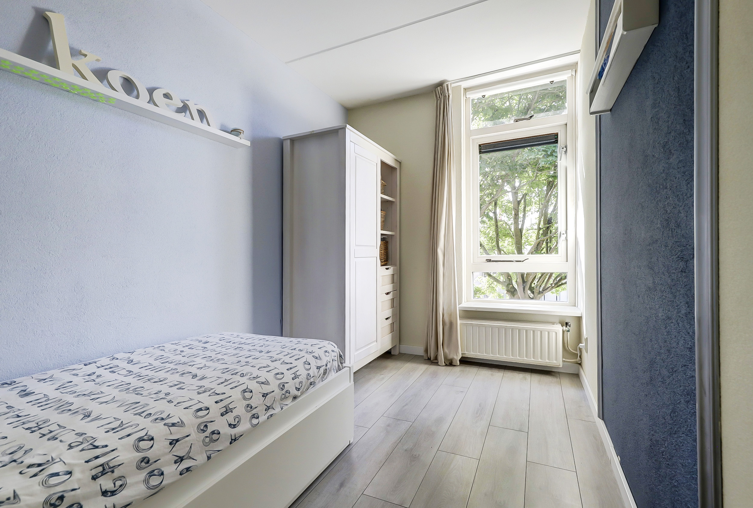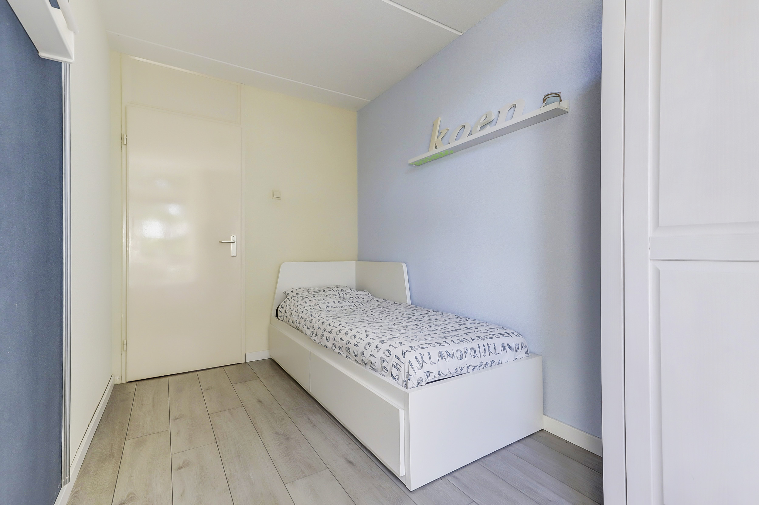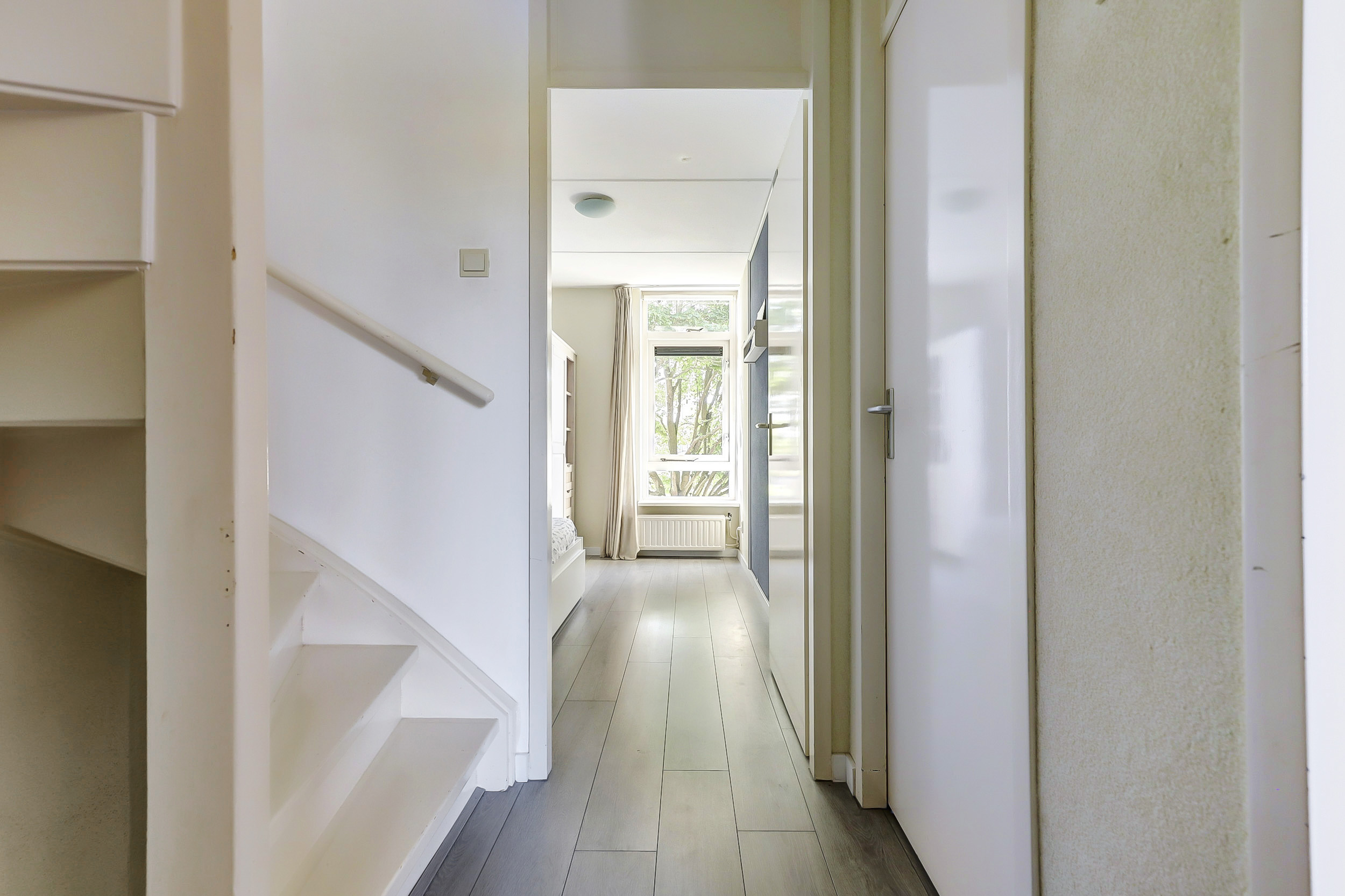 Op de eerste verdieping bevinden zich drie comfortabele slaapkamers. De grootste kamer ligt aan de voorzijde en beschikt over een dubbele raampartij, een vaste kastenwand en veel ruimte. De overige twee slaapkamers zijn eveneens keurig afgewerkt en ideaal in te richten als kinder- of werkkamer.