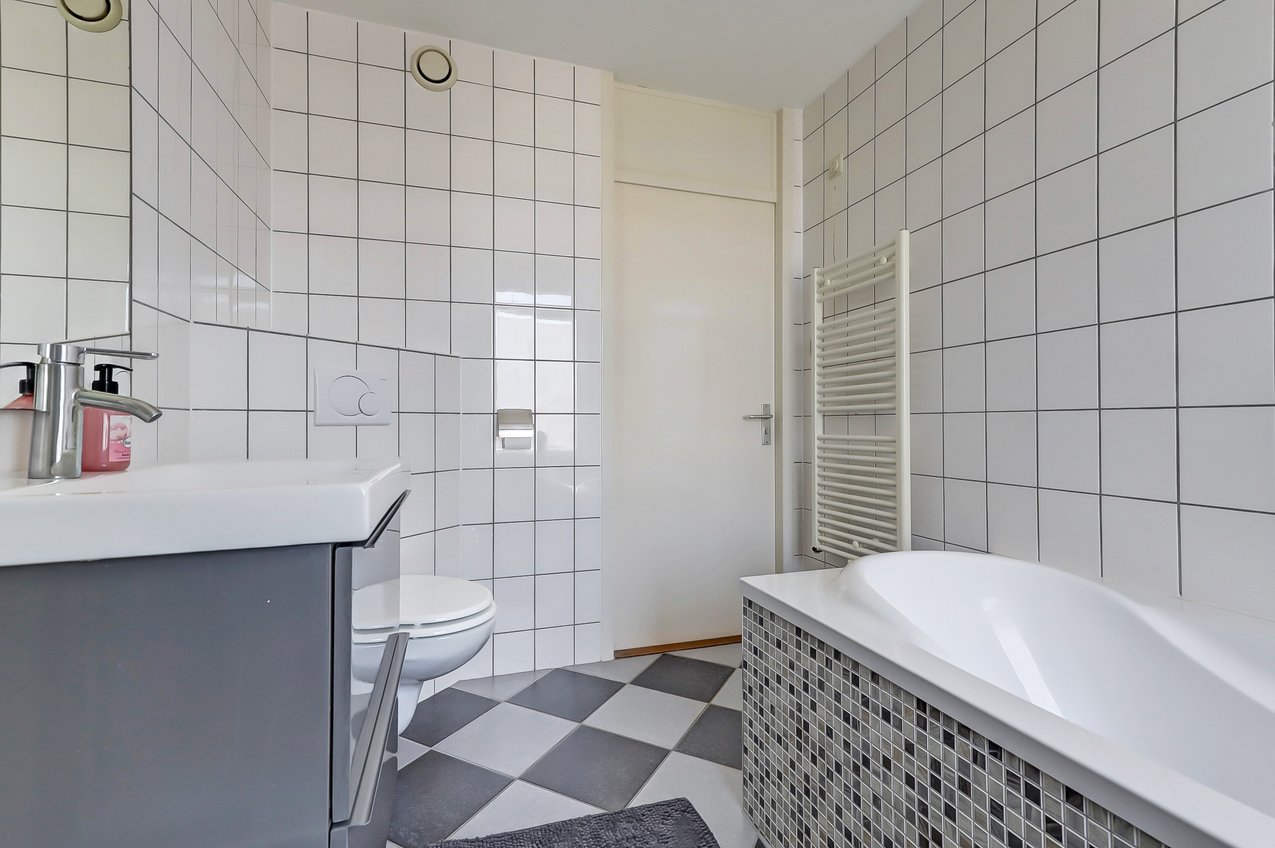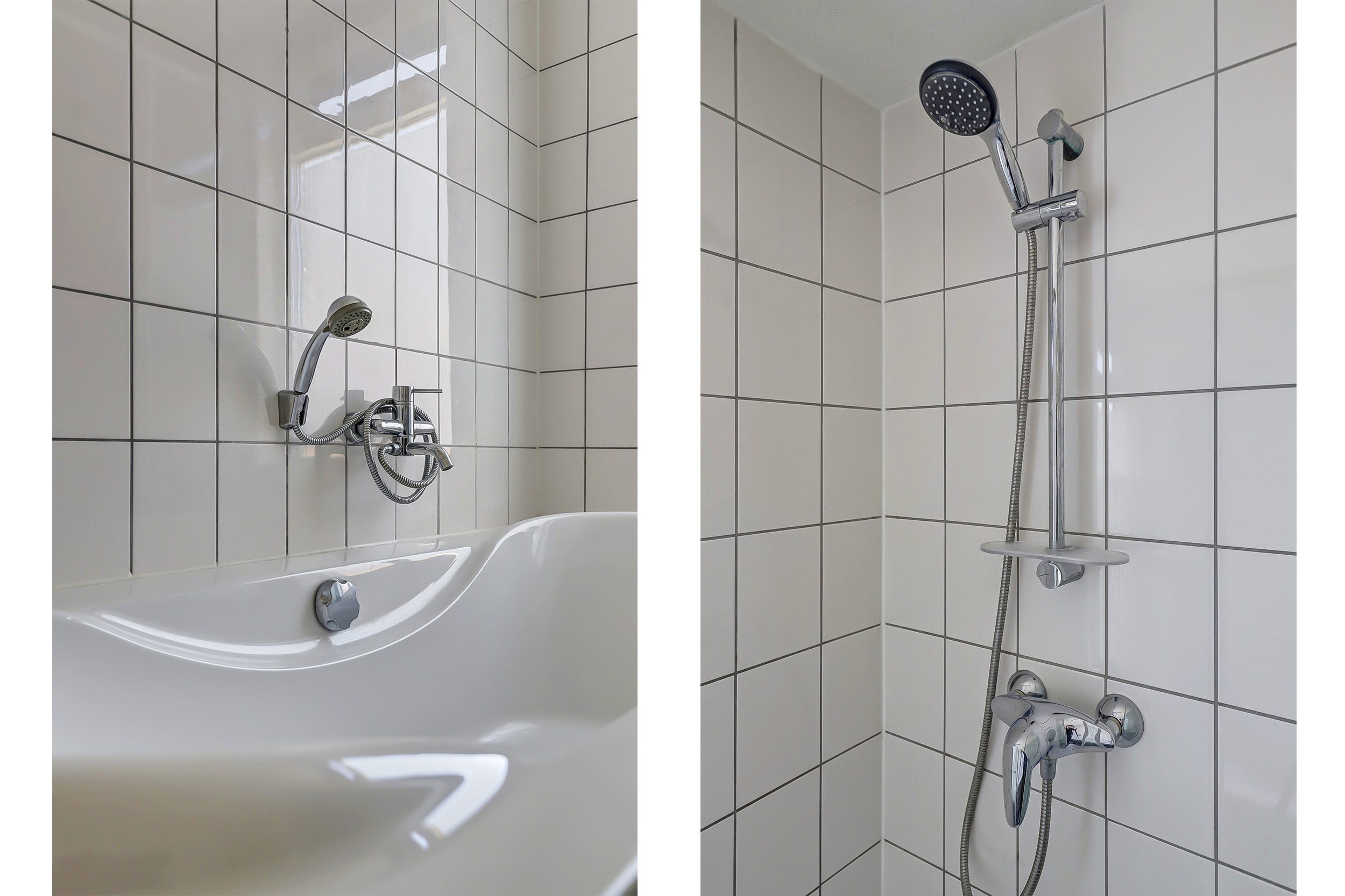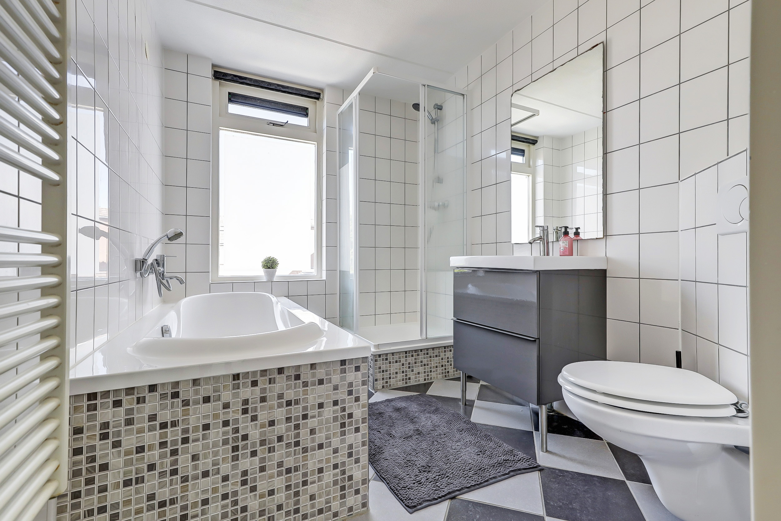 De moderne badkamer is betegeld en voorzien van een ligbad, aparte douchecabine, wastafelmeubel en tweede toilet. Dankzij het raam is er volop daglicht én natuurlijke ventilatie.