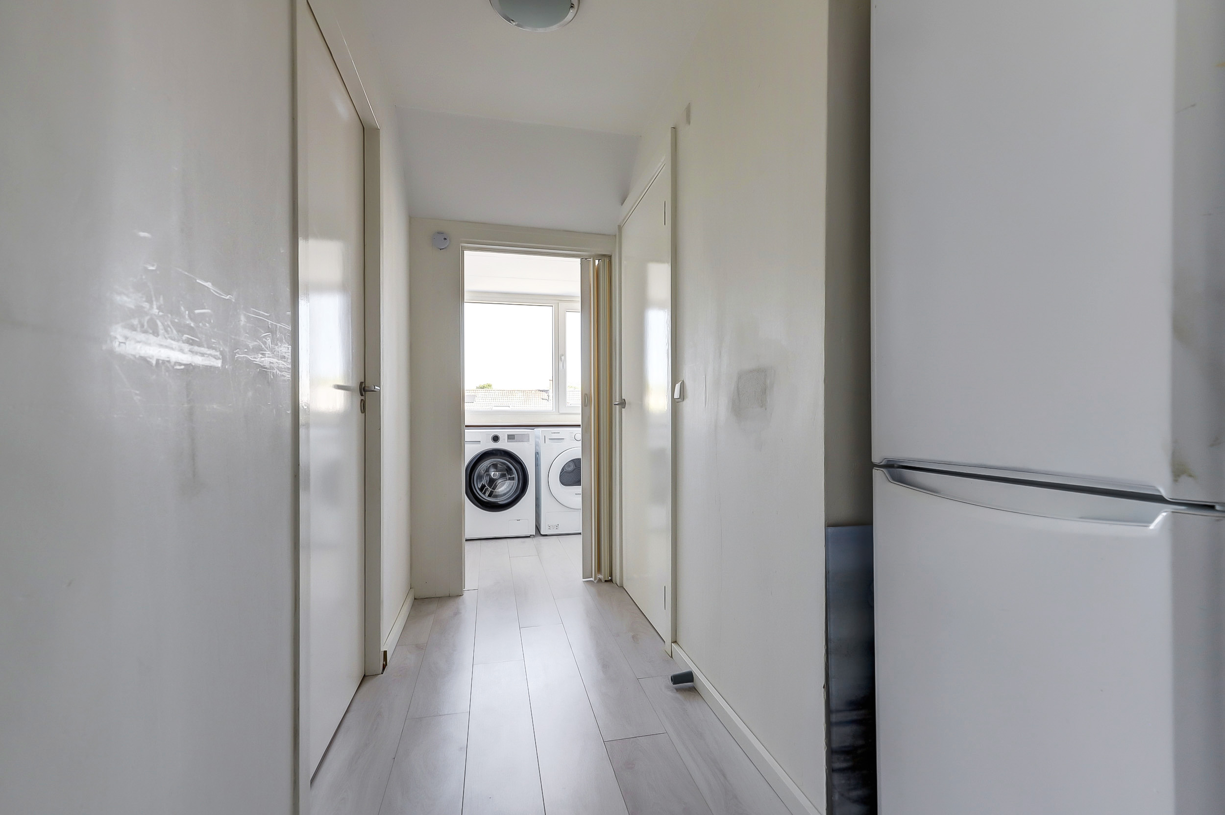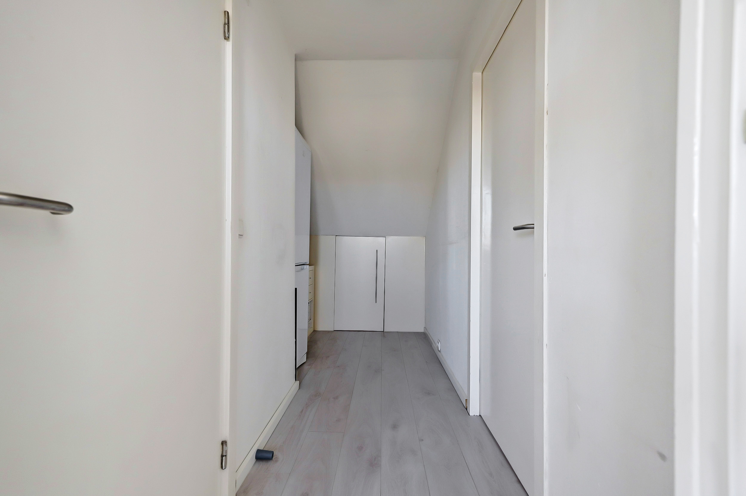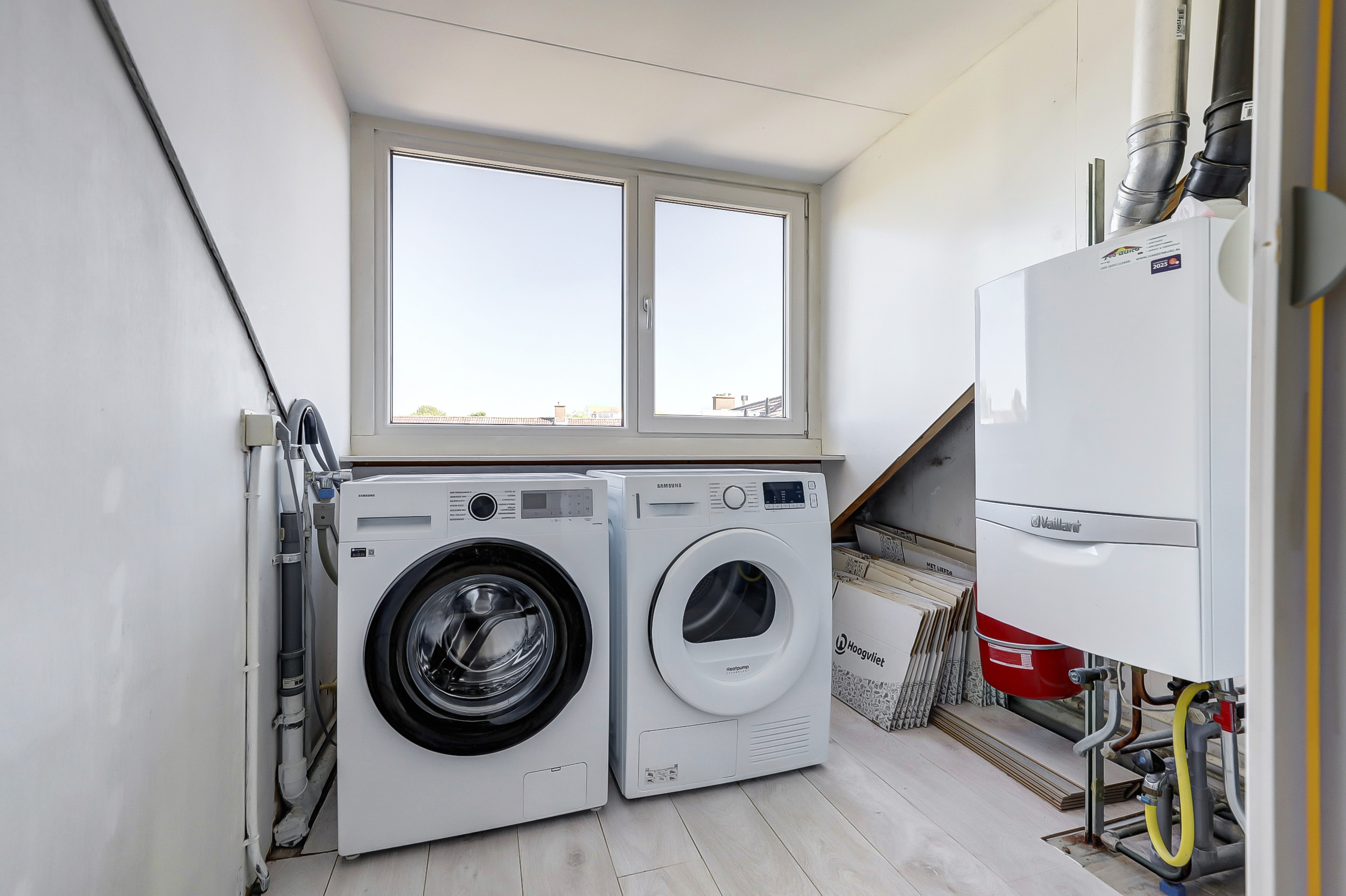 Vanaf de overloop is er toegang tot een praktisch washok met de aansluitingen voor de wasmachine en droger, evenals de cv-installatie. Onder de schuine dakdelen is extra bergruimte aanwezig.