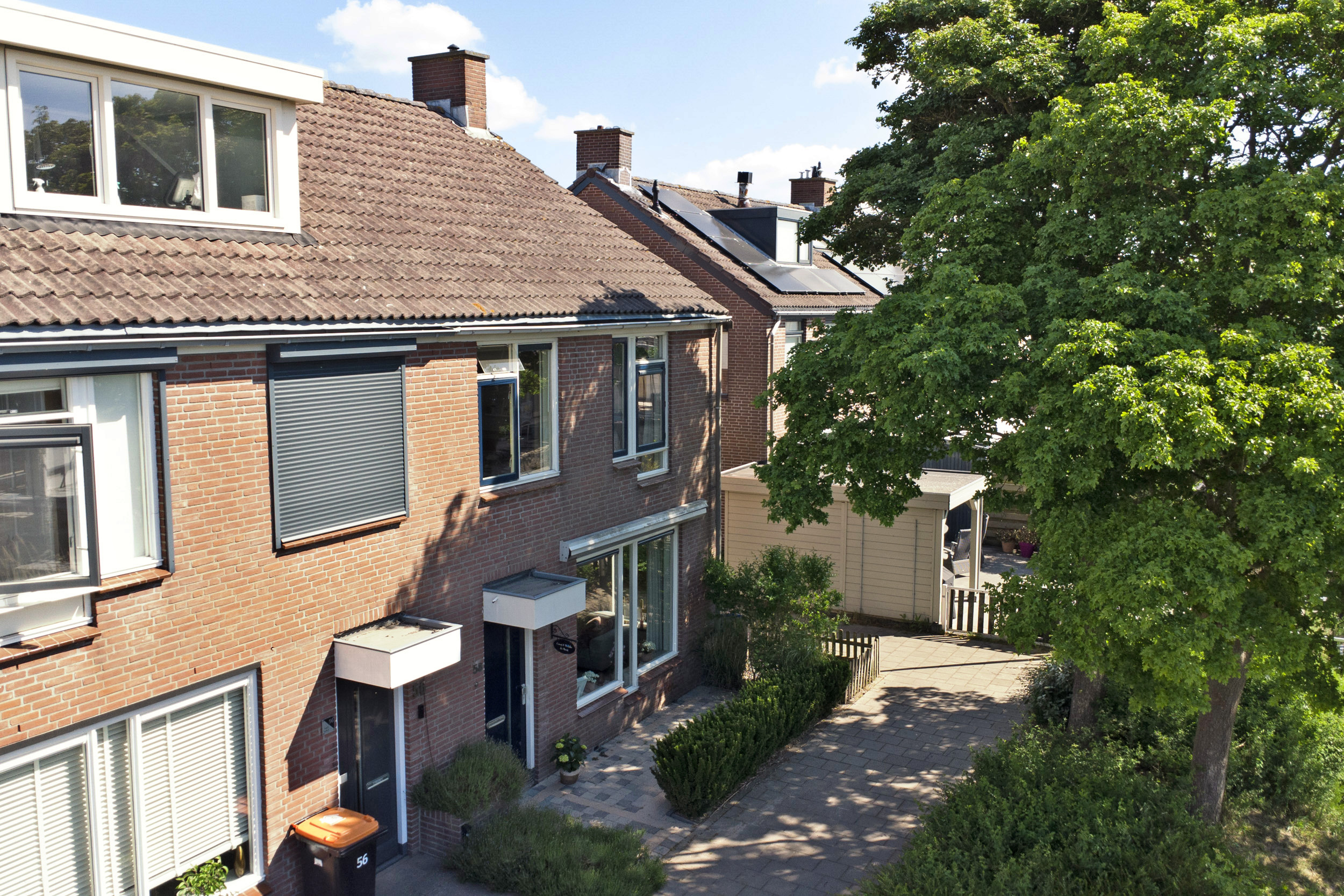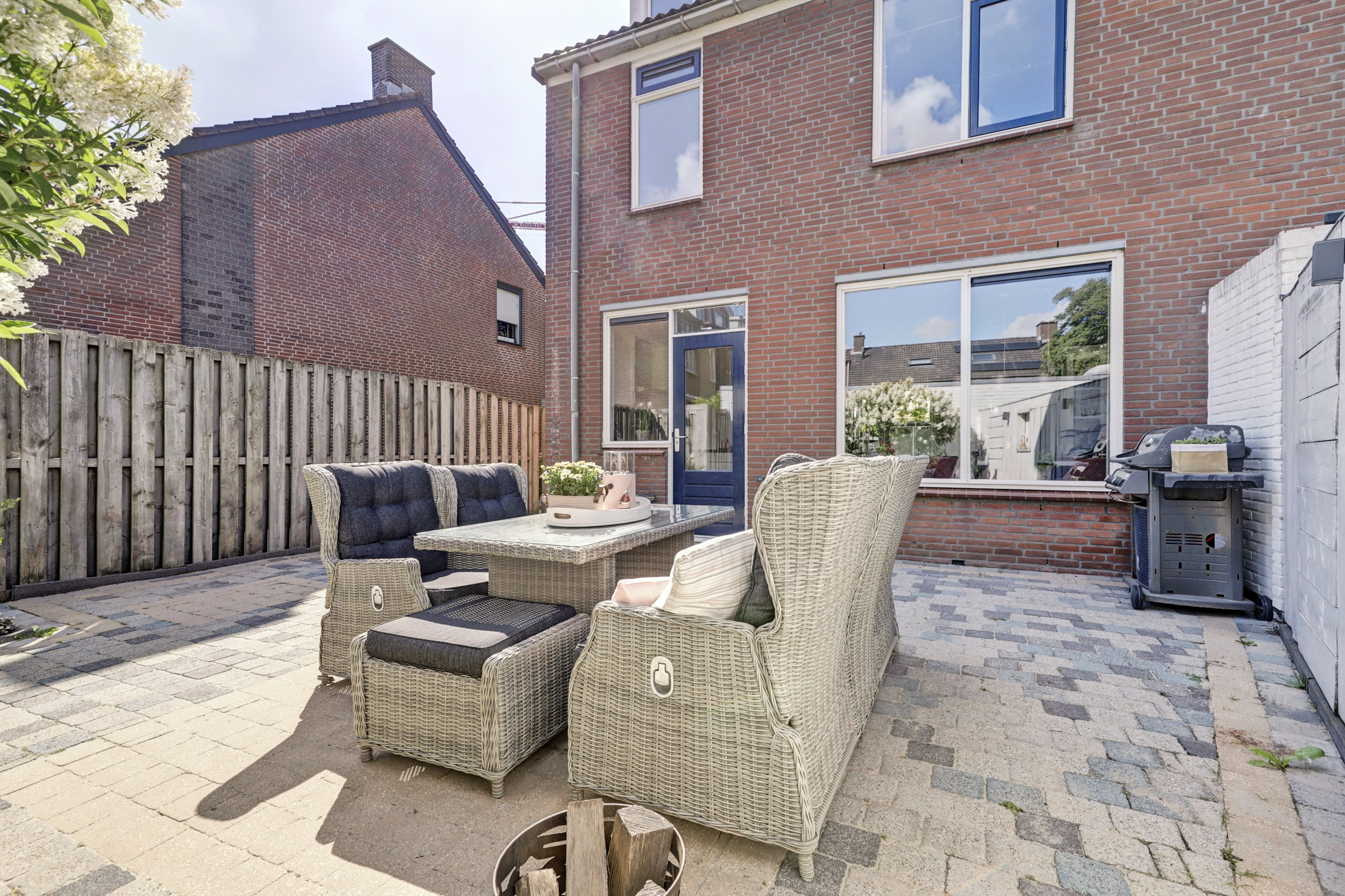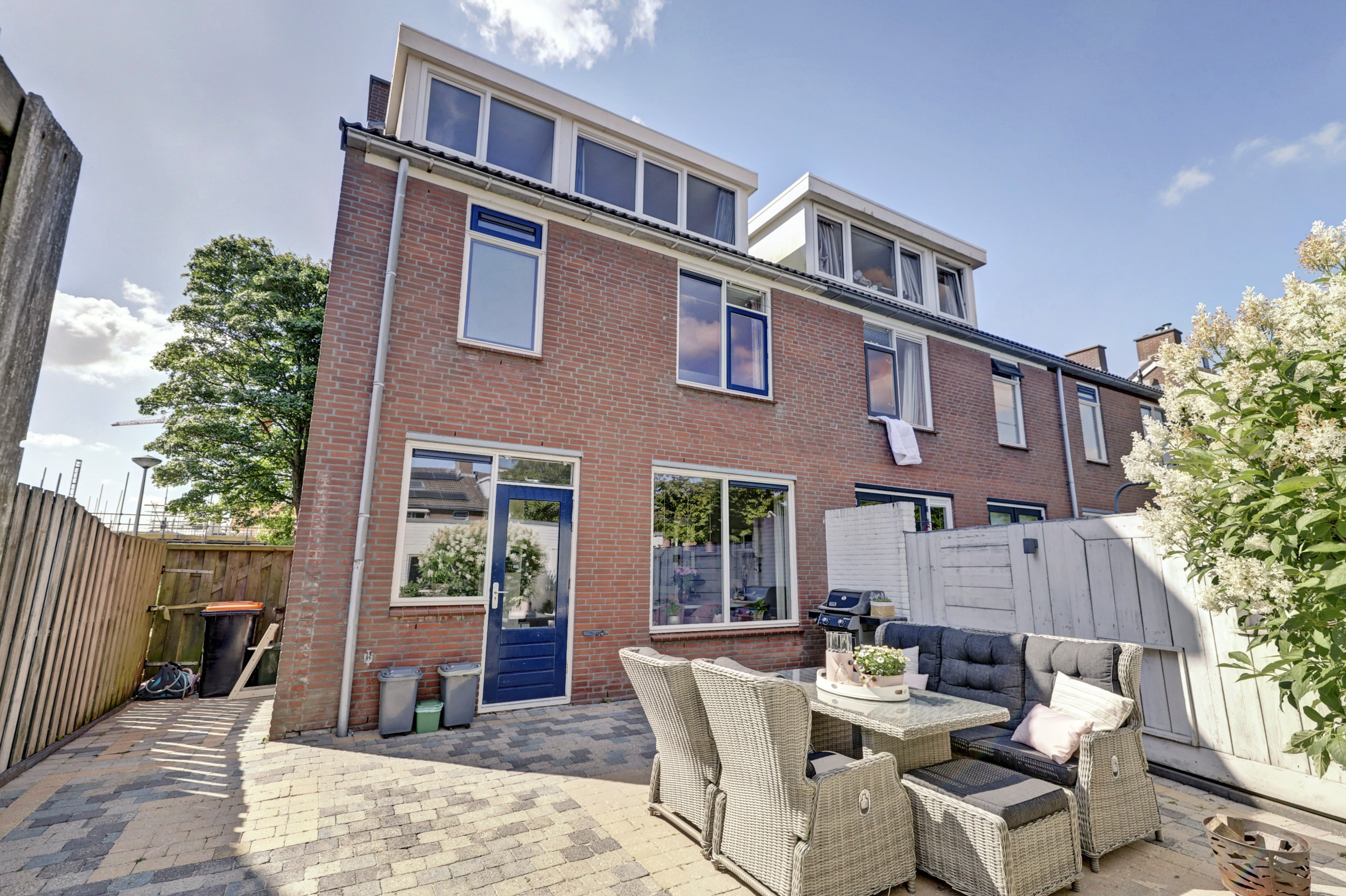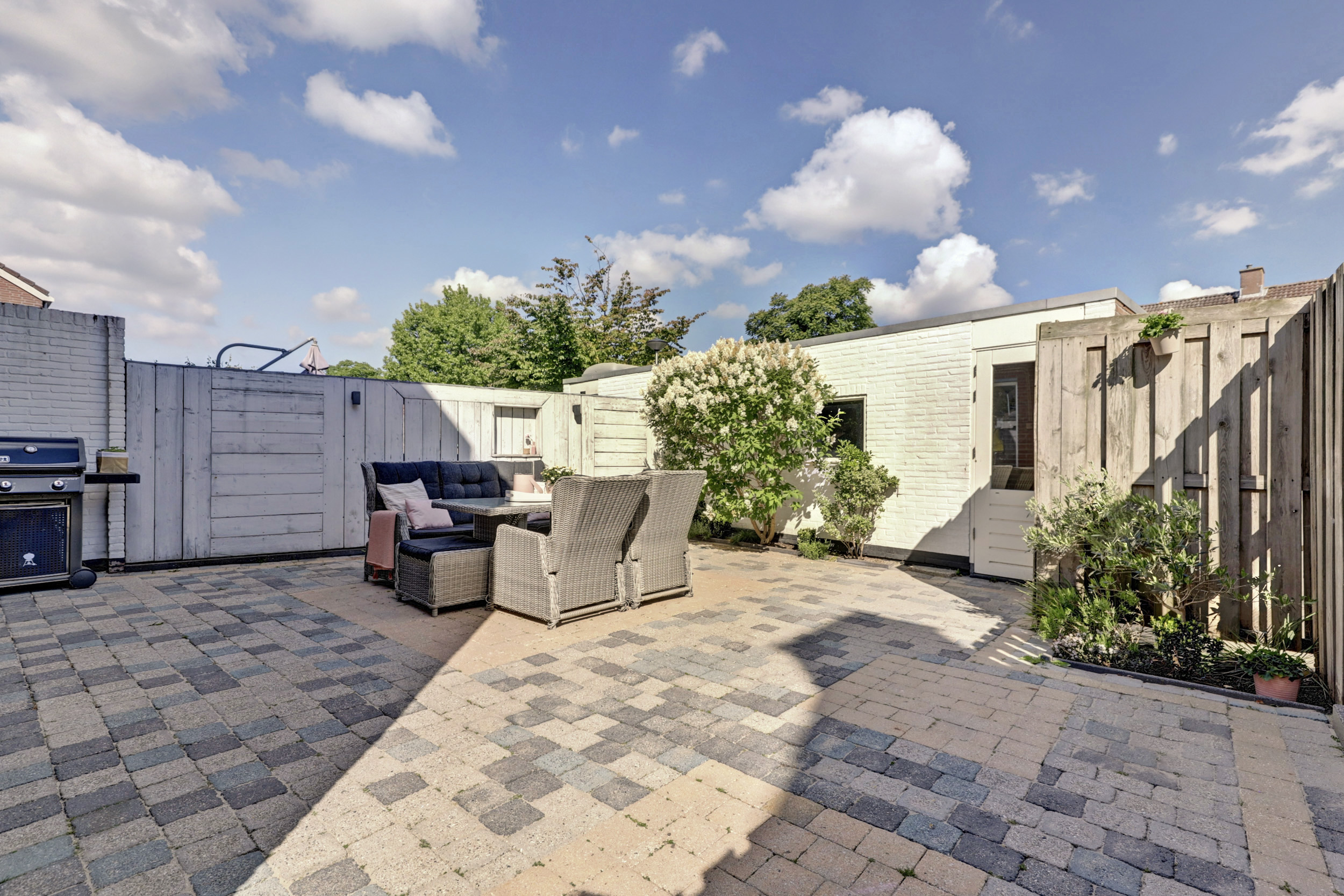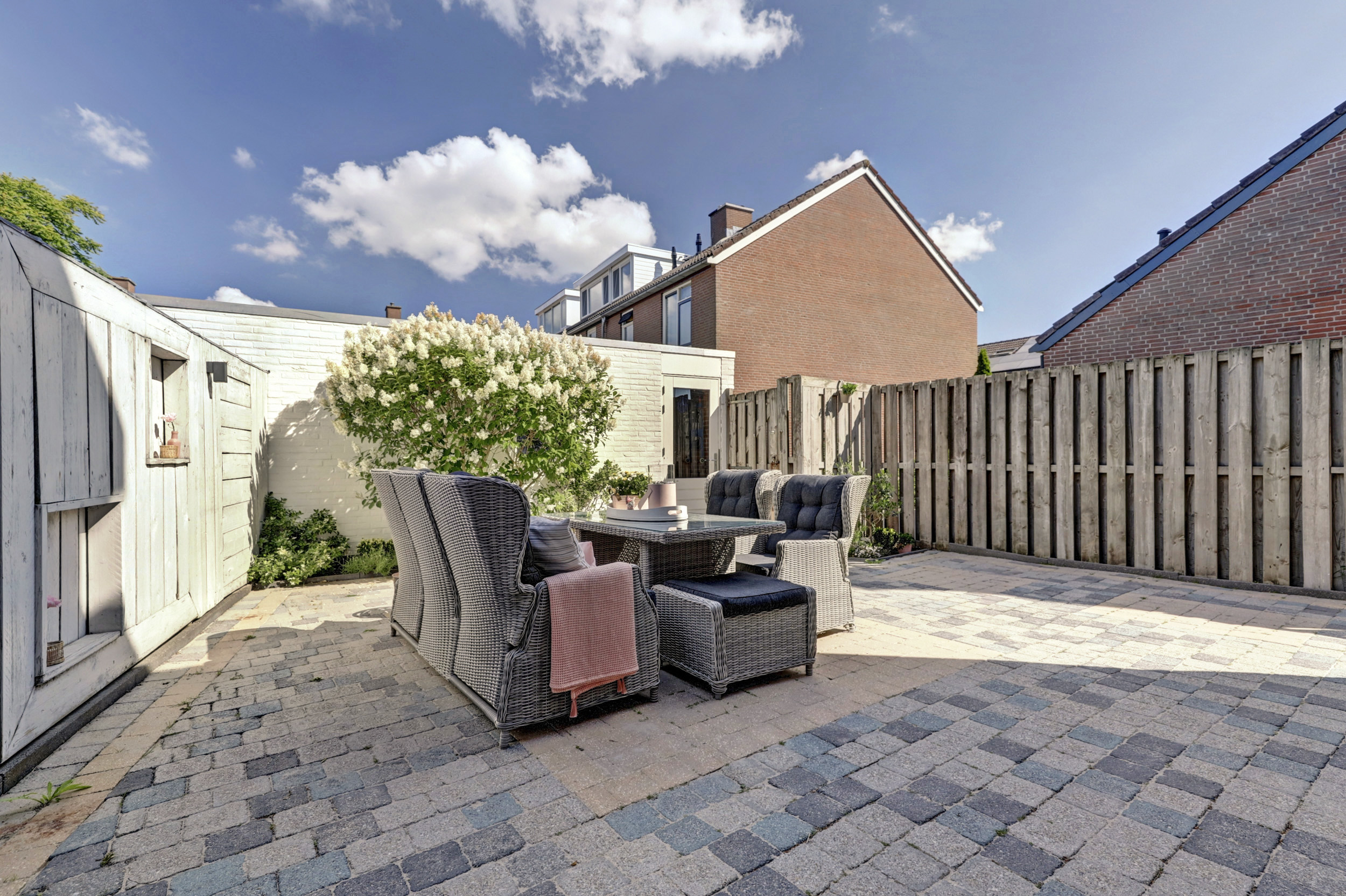 De zonnige achtertuin is volledig bestraat, wat zorgt voor een onderhoudsarme buitenruimte met volop mogelijkheden voor een loungehoek of eettafel. Achterin staat een stenen berging met elektra. Handig voor fietsen, gereedschap of tuinspullen. De tuin is daarnaast gemakkelijk bereikbaar via een achterom.