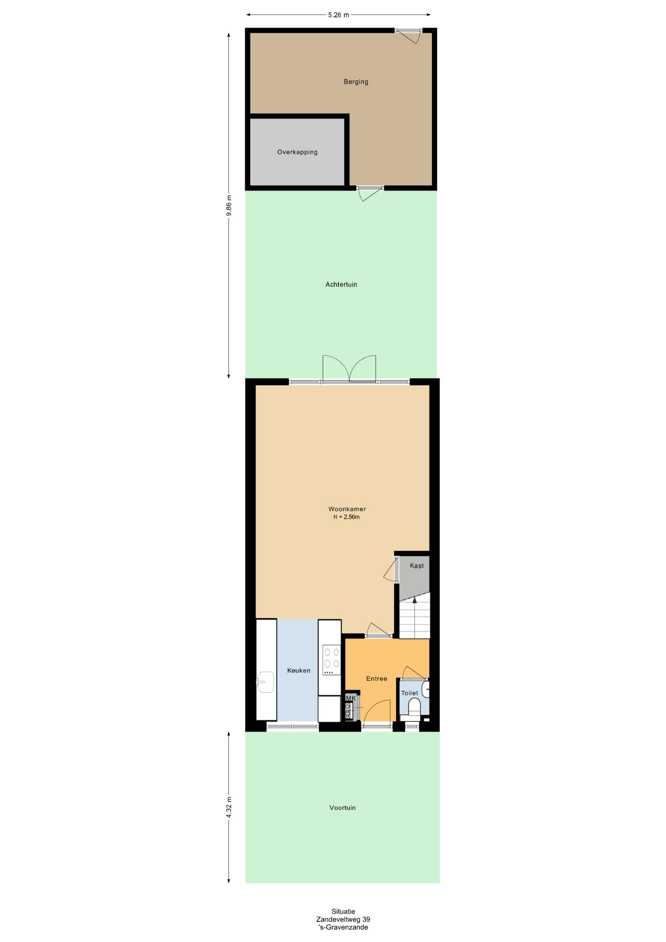 - Achtertuin 52 m2 (9.86 meter diep en 5.26 meter breed)