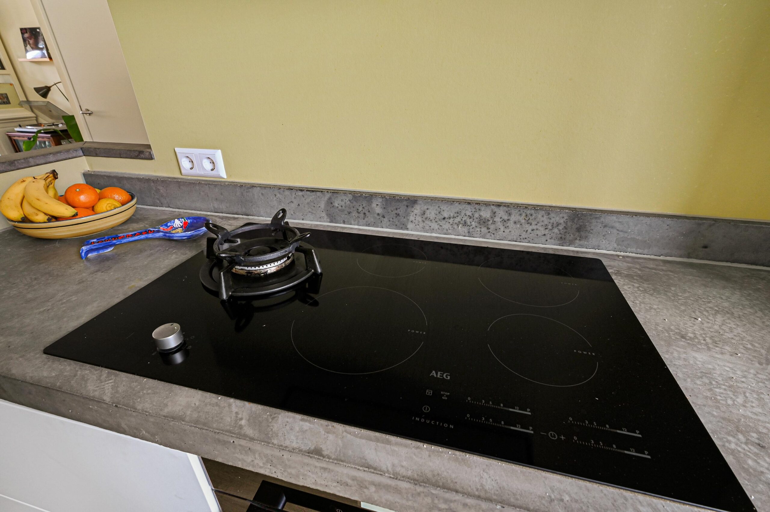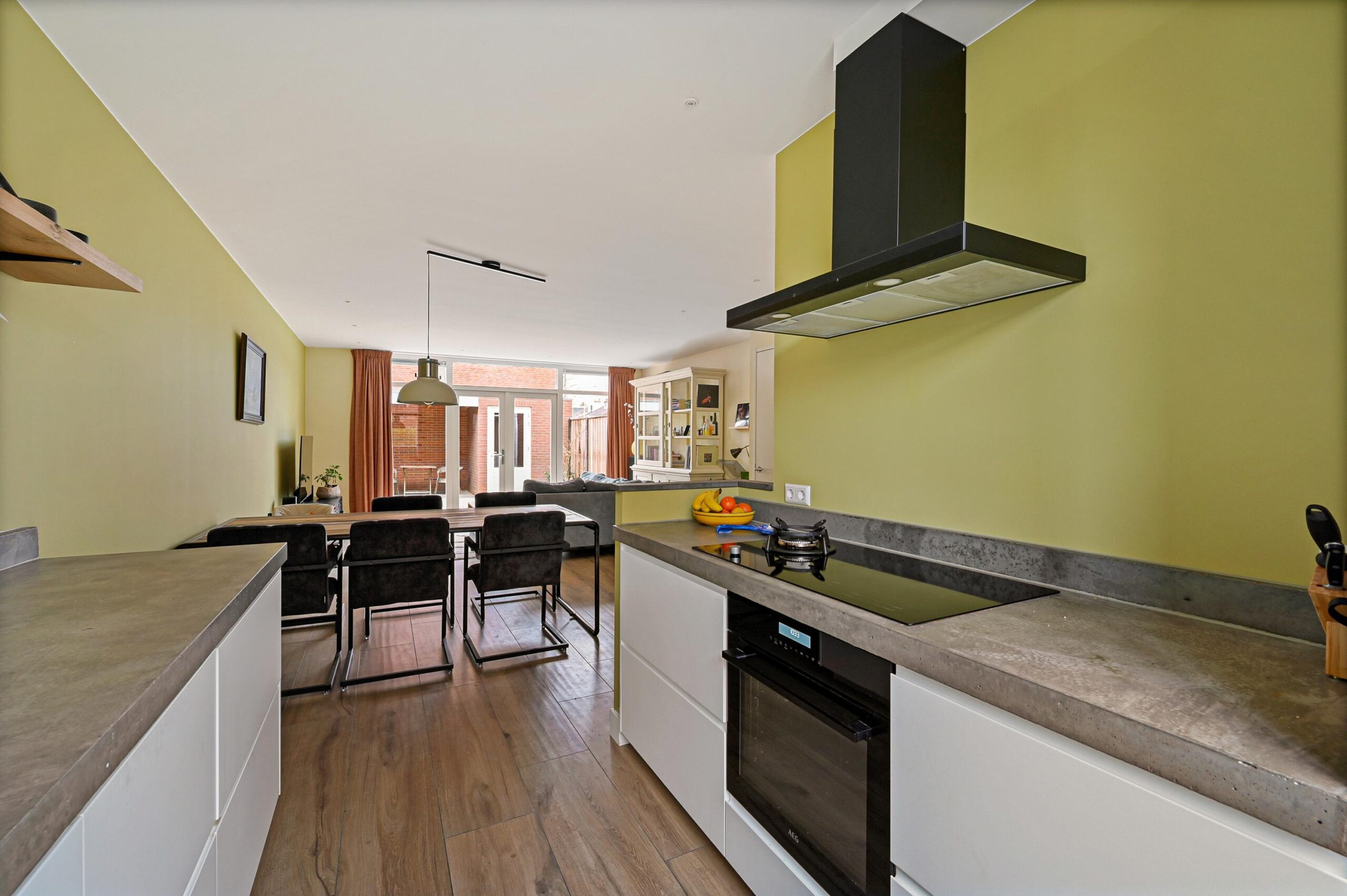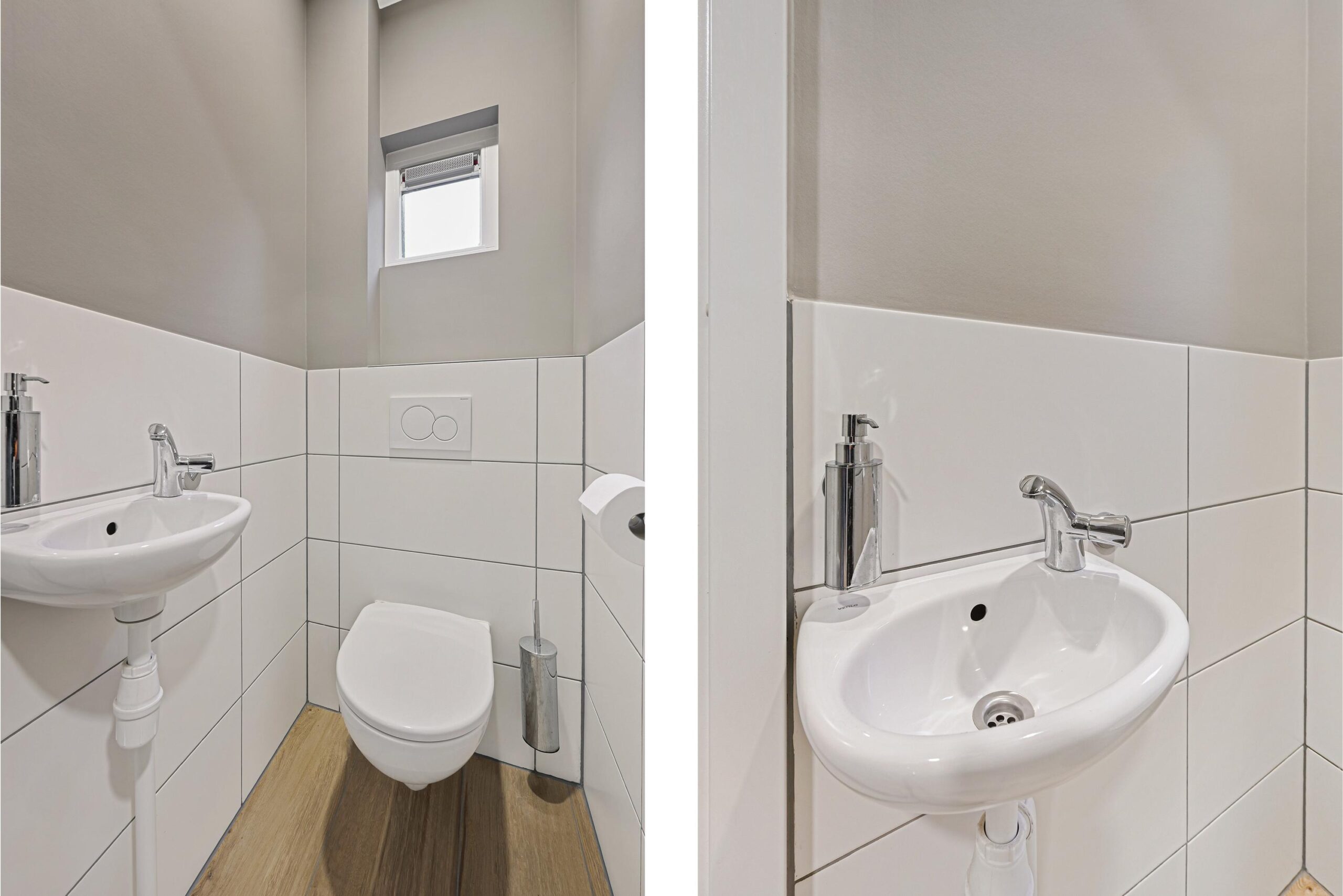 De begane grond biedt een lichte en sfeervolle woonkamer met een luxe plavuizen in houttint met vloerverwarming, strak gestuukte wanden en een geëgaliseerd plafond met inbouwspots. De openslaande deuren naar de tuin zorgen voor veel daglicht en een prettige verbinding tussen binnen en buiten. De halfopen keuken is in 2021 volledig vernieuwd en uitgevoerd in mat wit, gecombineerd met een grijs beton werkblad. De keuken beschikt over diverse AEG inbouwapparatuur, waaronder een AEG inductiekookplaat met wokpit, oven, vaatwasser, Quooker, een ruime koelkast en een separate vriezer. Het geheel heeft een strakke en luxe uitstraling en biedt veel werk- en bergruimte. Het toilet op de begane grond is eveneens vernieuwd en voorzien van een raam en toiletkraan.