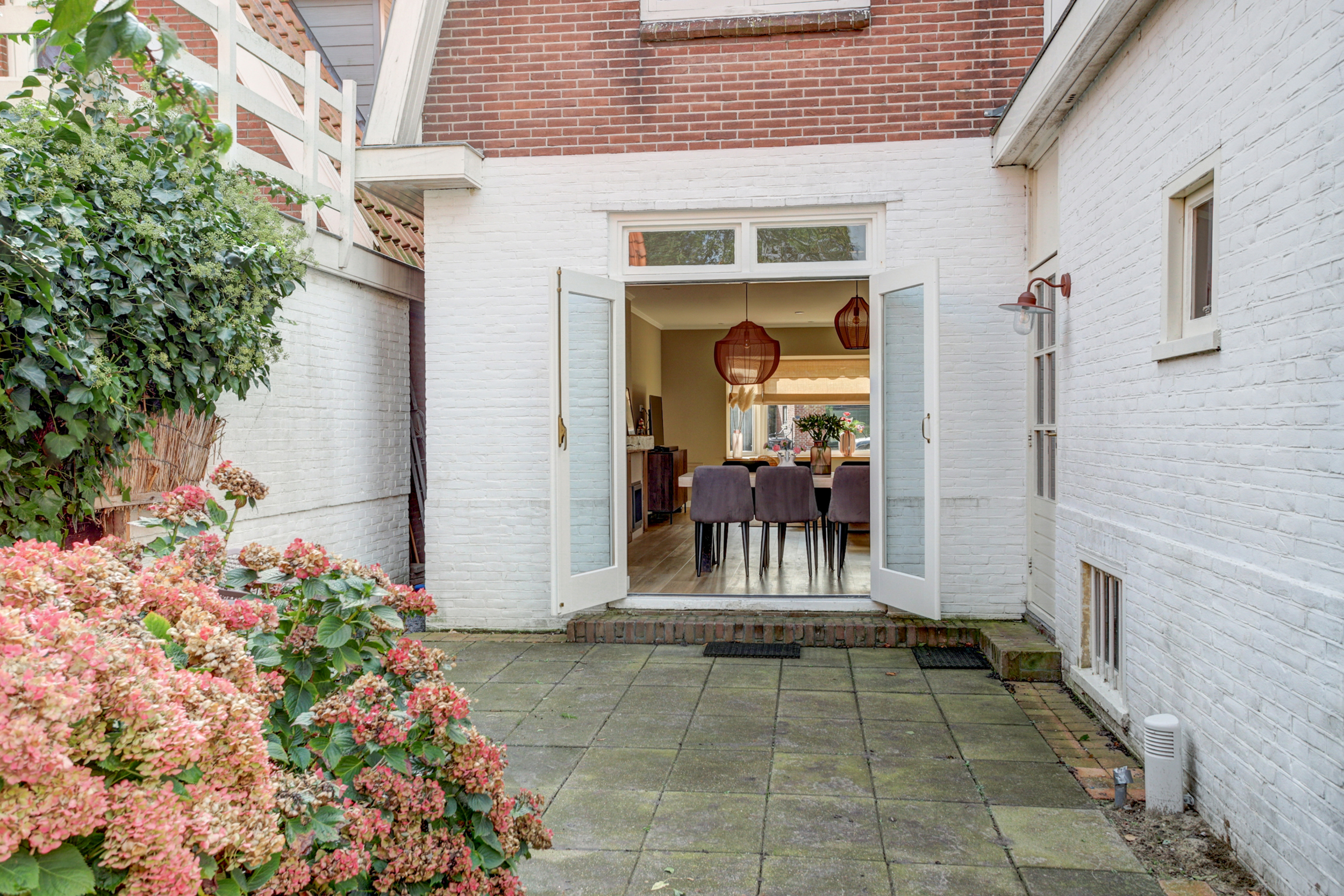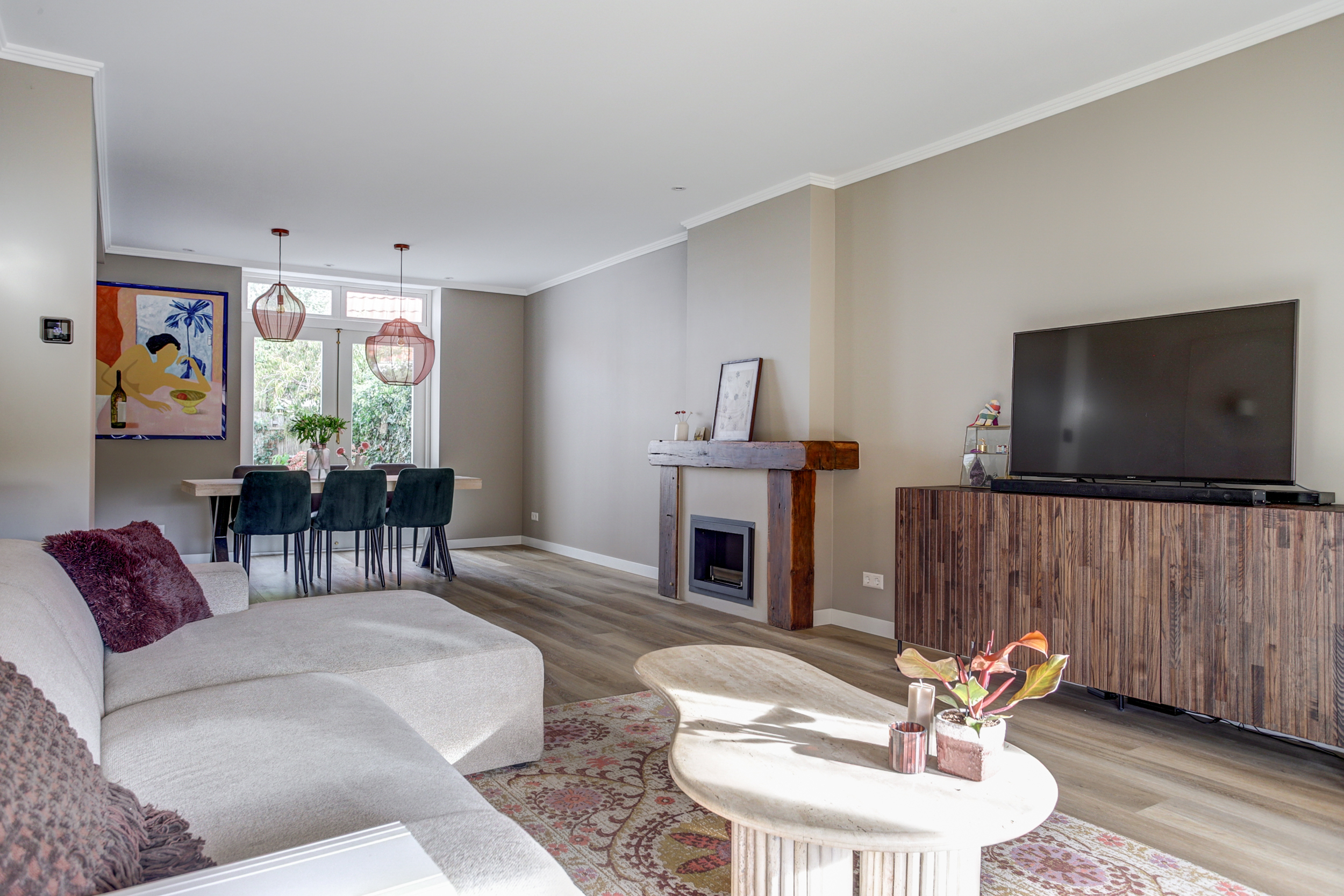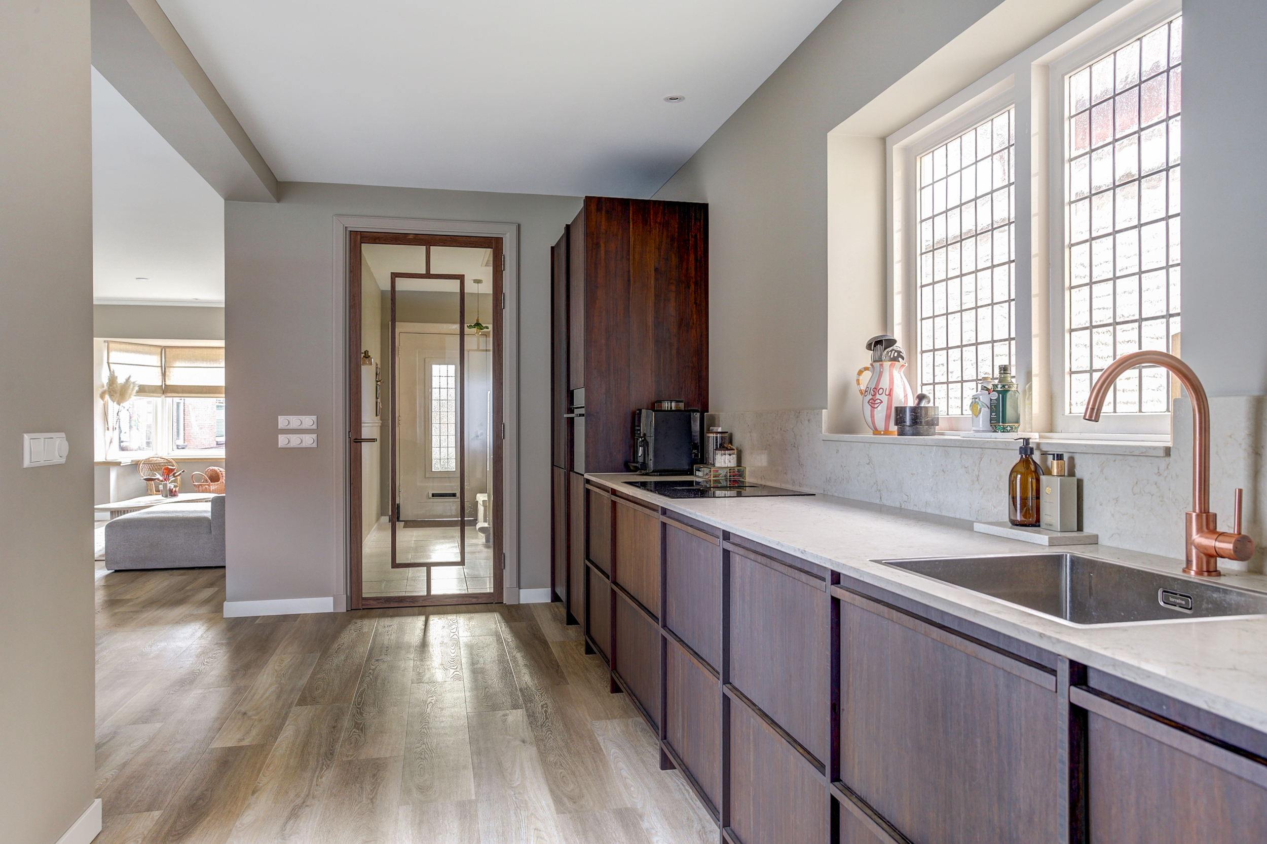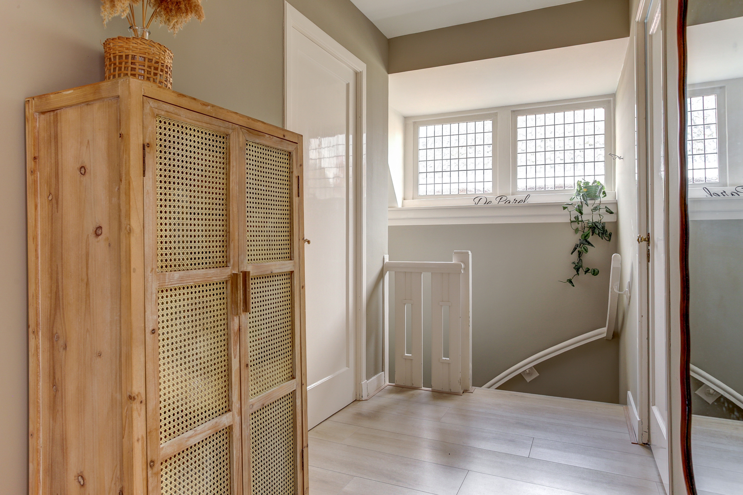 De keuken is in 2025 geheel vernieuwd en uitgevoerd met walnootfronten, een mooi werkblad en moderne inbouwapparatuur zoals een inductiekookplaat, combi-oven, vaatwasser, koelkast en vriezer. Een echte eyecatcher is de glazen vloerplaat met zicht op de wijnkelder, een bijzonder en stijlvol detail dat perfect past bij het karakter van de woning! De woonkamer ademt de charme van de jaren ’30 gecombineerd met modern comfort van nu. Met de prachtige erker, glas-in-loodramen, en de open haard op bio-ethanol. De openslaande deuren zorgen voor veel licht en een directe verbinding met de tuin. Aansluitend bevindt zich de praktische bijkeuken met aansluiting voor wasmachine en droger en het vernieuwde toilet. Naast de woning bevindt zich nog een berging/schuur, ideaal voor fietsen of extra opslag.