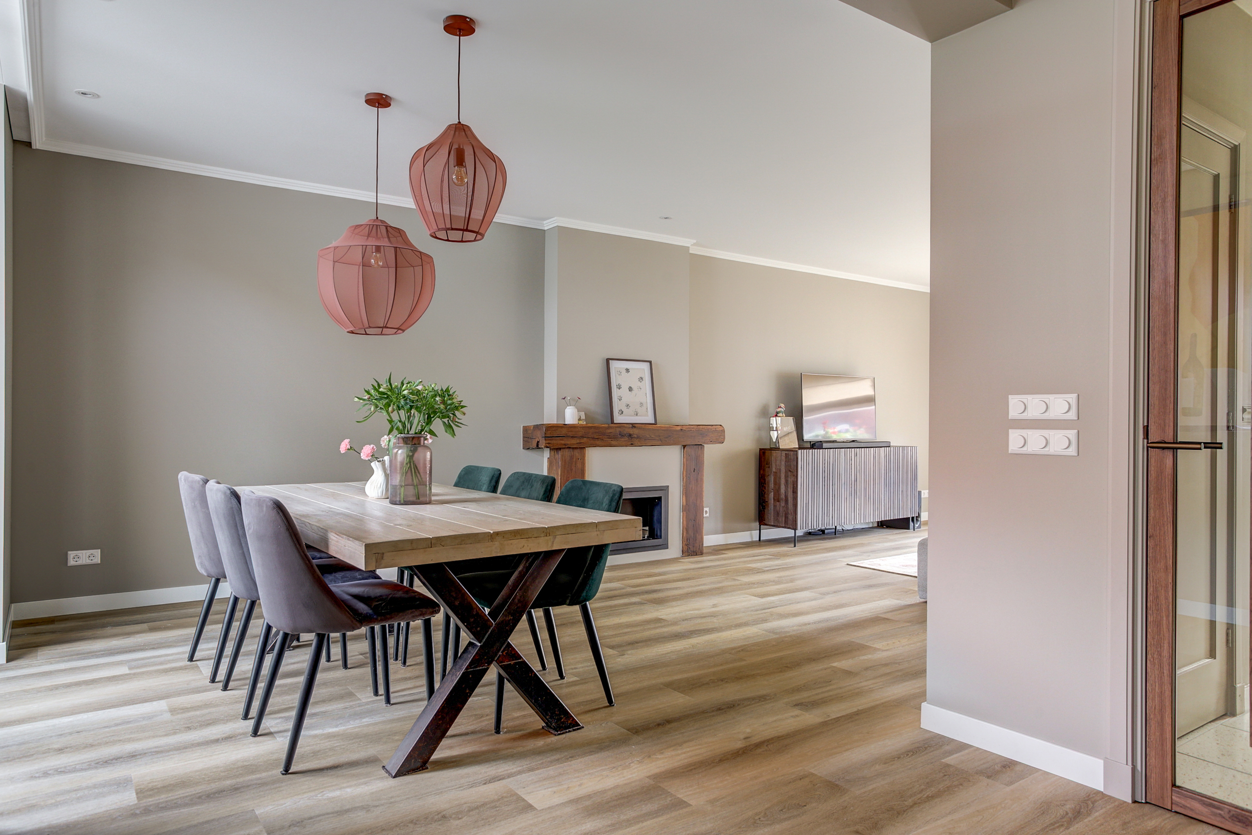 De huidige bewoners hebben de gehele benedenverdieping met veel zorg en oog voor detail naar het wooncomfort van nu gebracht. Zo is de houten vloer vervangen door een betonnen schuimbetonvloer met vloerverwarming, zijn de wanden gestuct, voorzetwanden nageïsoleerd, elektra en riolering vernieuwd, nieuwe binnendeuren geplaatst en is er een moderne keuken met walnootfronten en luxe apparatuur gerealiseerd. De combinatie van originele elementen en eigentijdse afwerking maakt dit een woning met karakter en comfort.