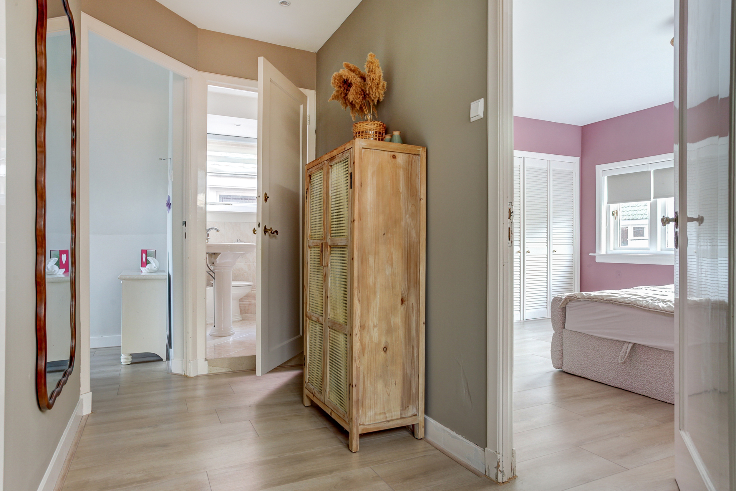 Op de eerste verdieping bevinden zich drie prima slaapkamers, waarvan één met openslaande deuren naar een eventueel te realiseren balkon. De kamers zijn licht, strak afgewerkt en behouden de originele jaren ’30-uitstraling. De badkamer is functioneel en netjes, met mogelijkheden om naar eigen wens te moderniseren.