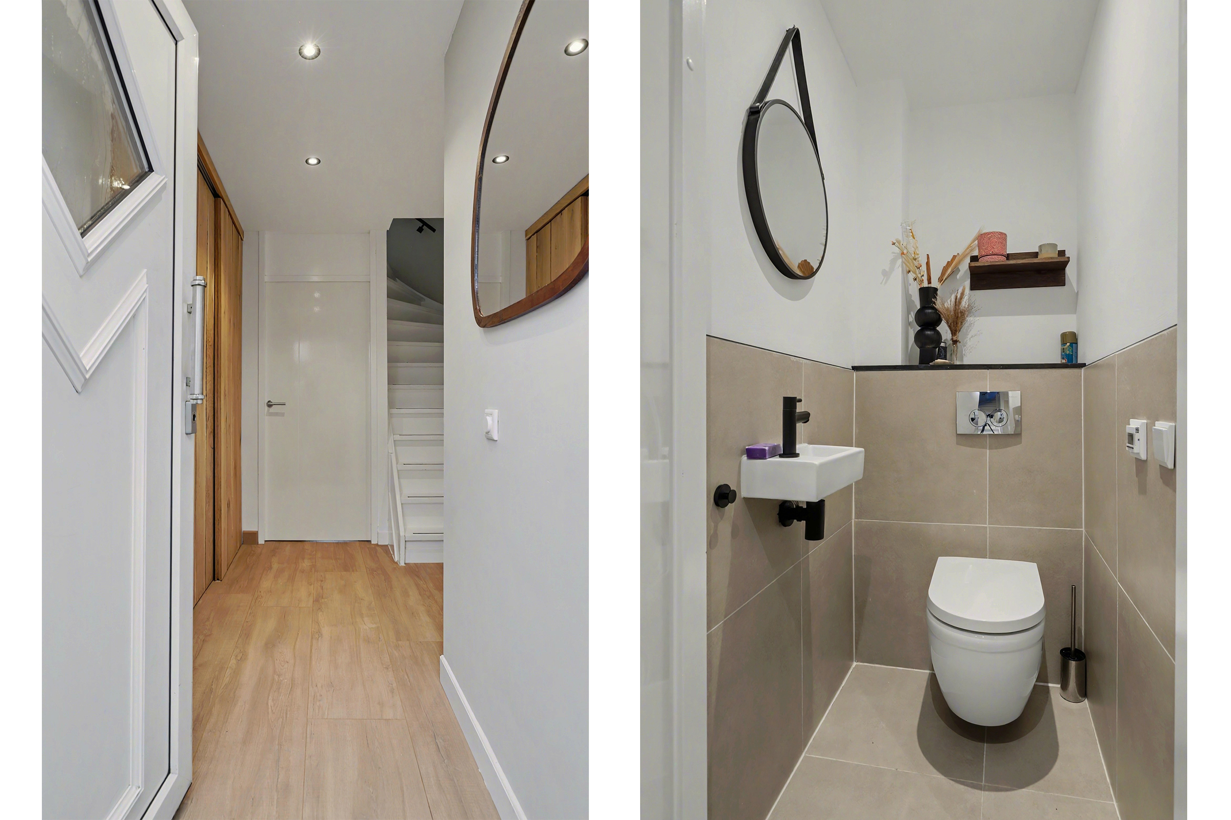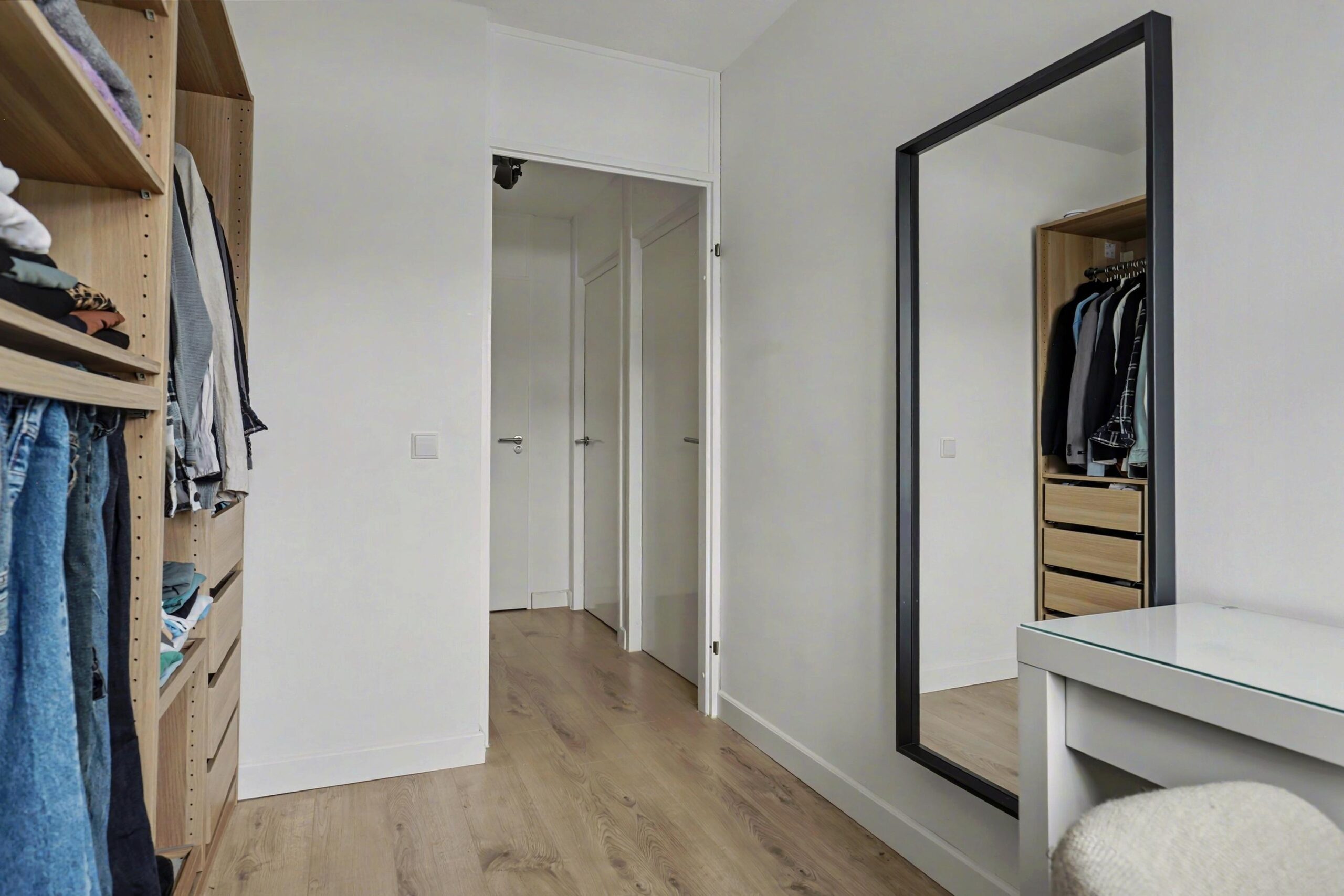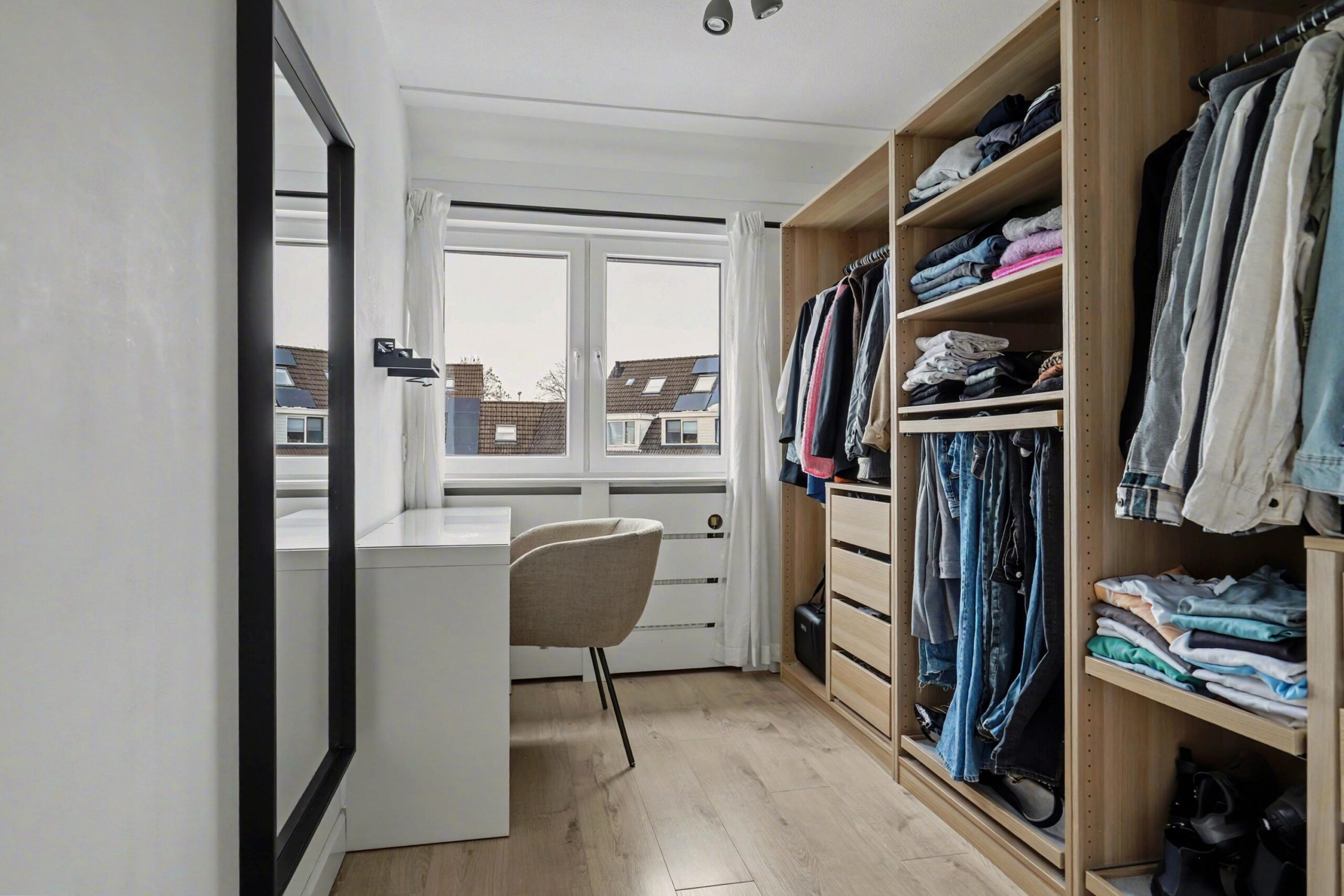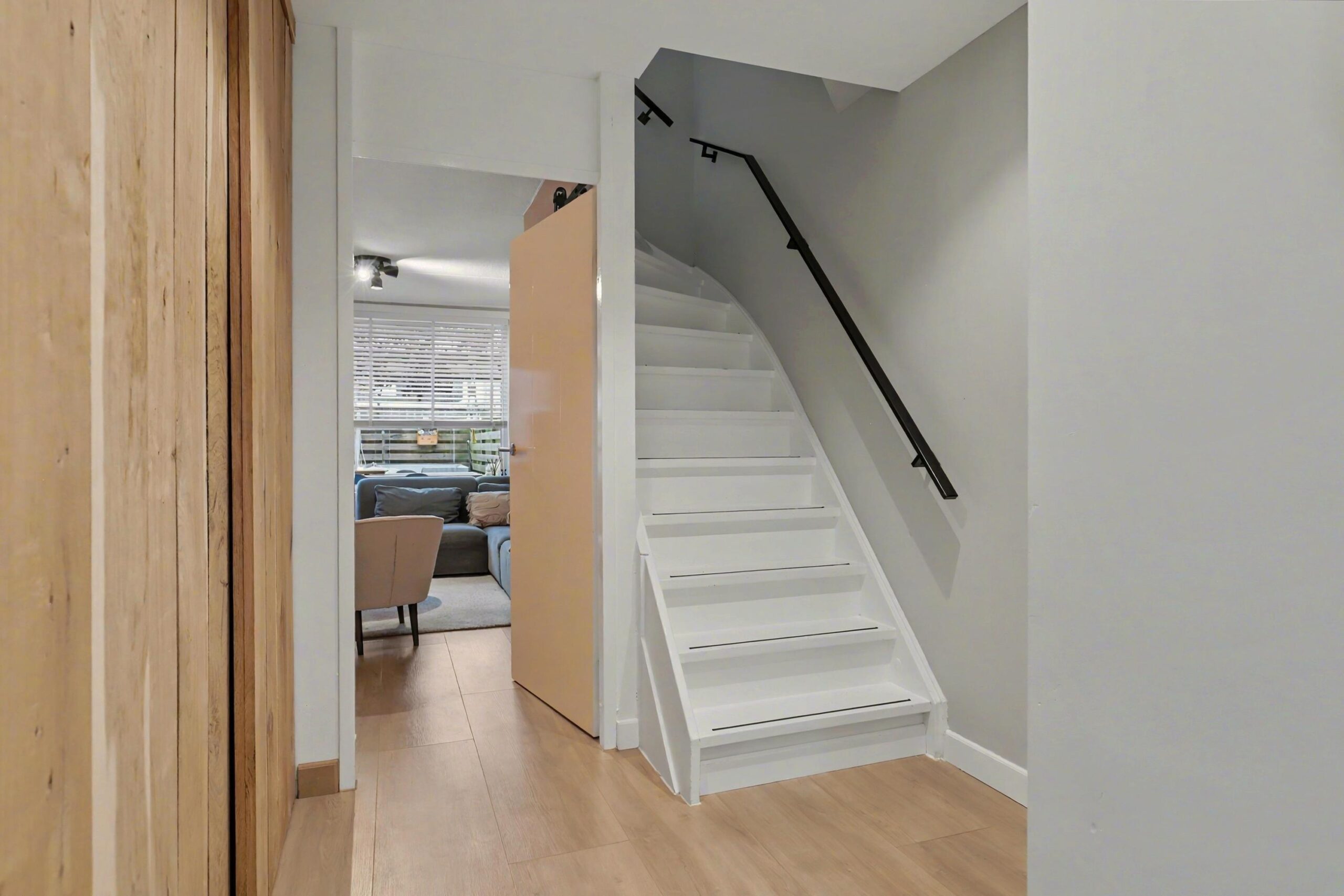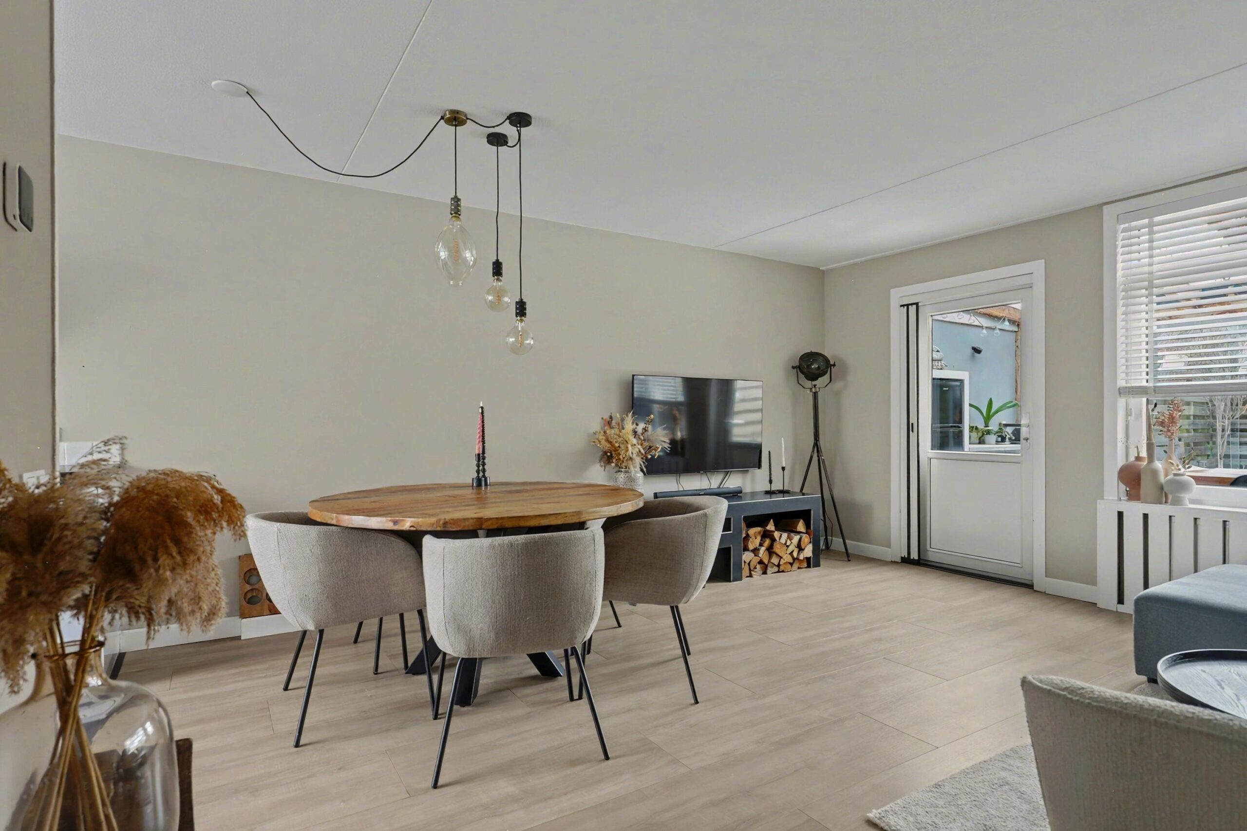 Via de entree komt u in de hal met meterkast, garderoberuimte, modern toilet (vernieuwd in 2023) en trapopgang. De woonkamer is tuingericht en prettig licht, met een trapkast voor extra bergruimte en een tuindeur naar buiten. Aan de achterzijde is een serre gerealiseerd met vaste kastruimte en een koelkastombouw, wat extra leefcomfort biedt.