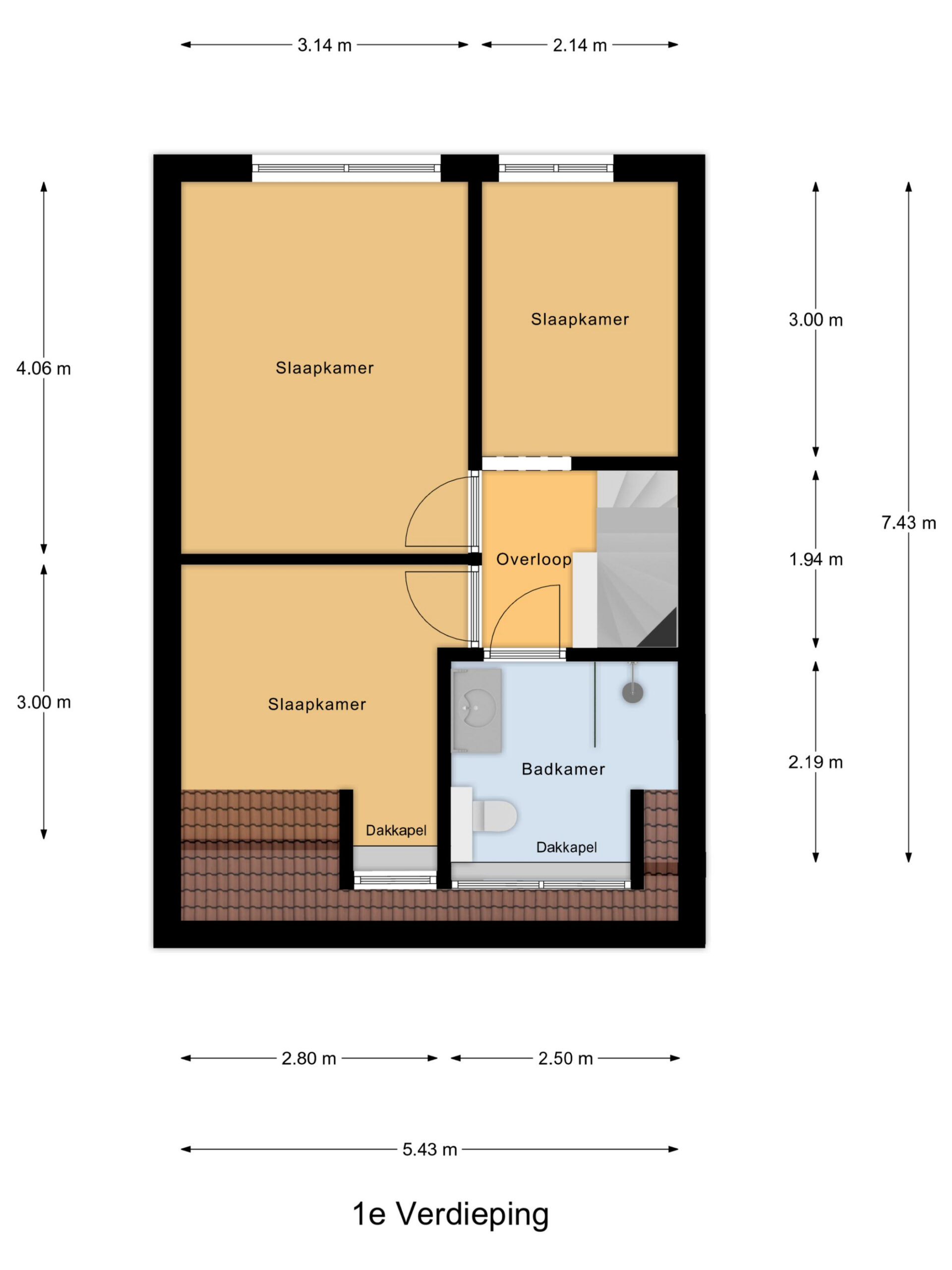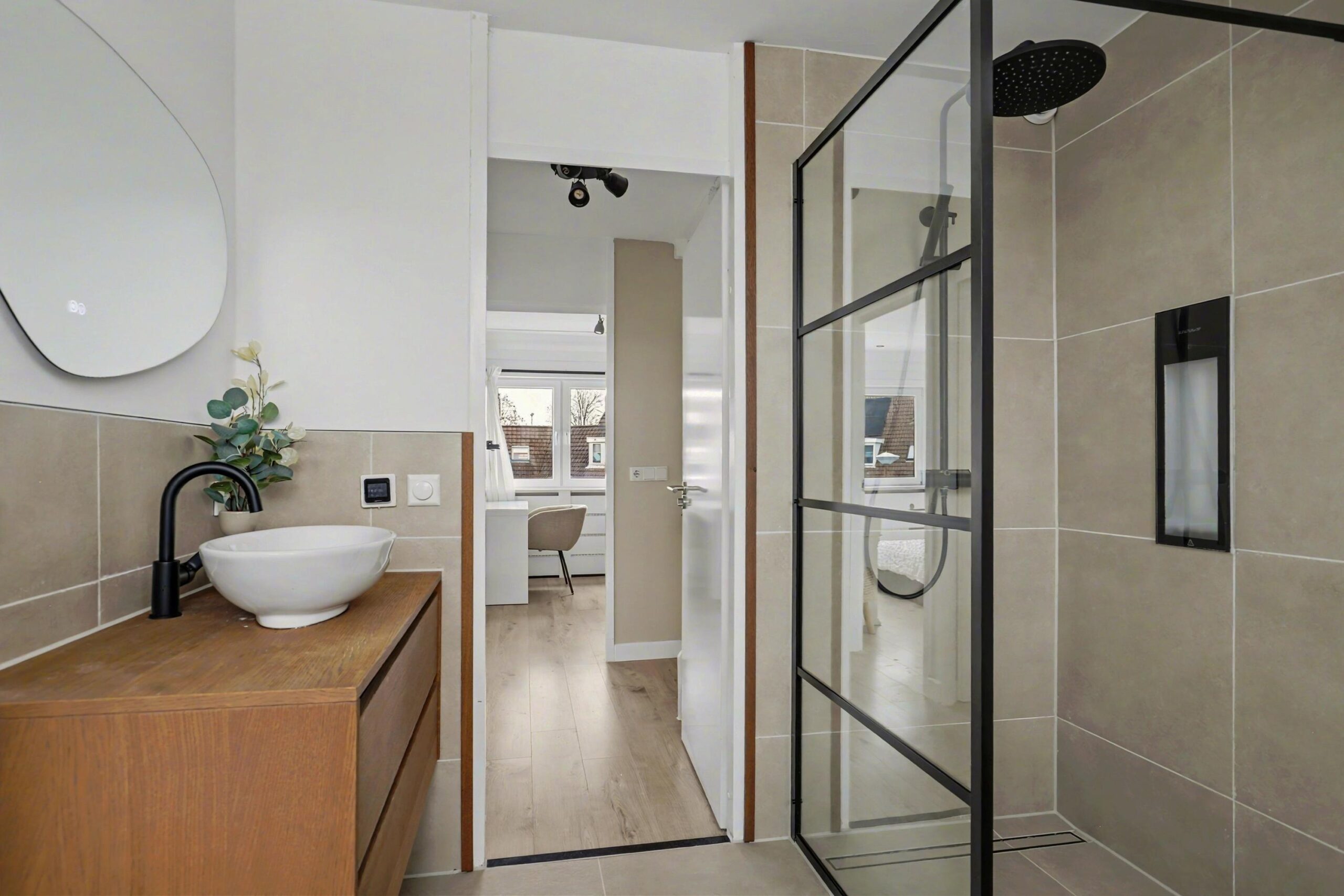 Op de eerste verdieping bevinden zich drie slaapkamers, allen strak afgewerkt met gestuukte wanden en plafonds en een laminaatvloer. De badkamer is modern en luxe uitgevoerd, vergroot door de geplaatste dakkapel en voorzien van vloerverwarming, een inloopdouche met sunshower, een tweede toilet en een wastafelmeubel.