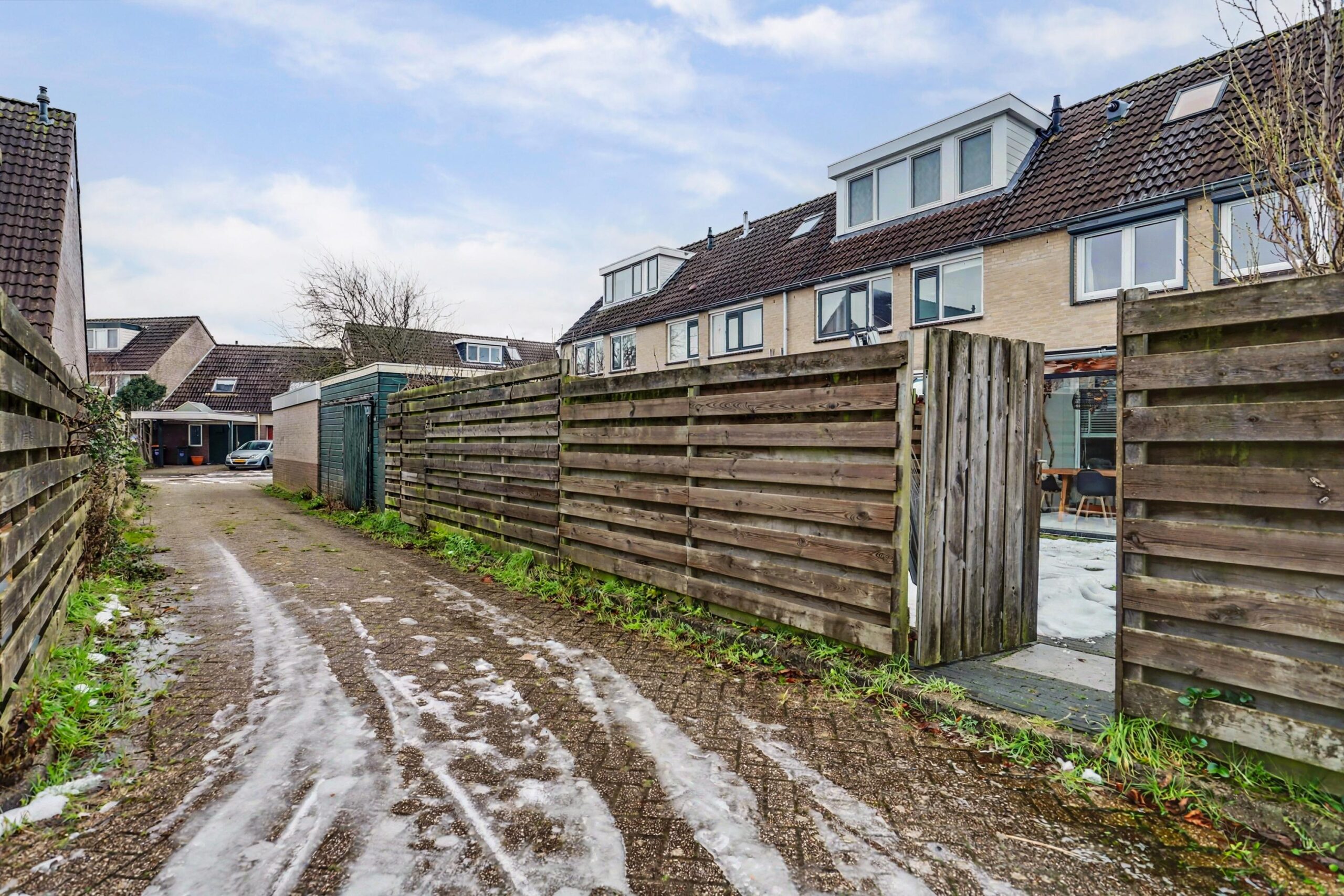 De achtertuin is netjes aangelegd met gras, een terras, plantenborders en een vaste bank. Daarnaast is er een praktische achterom aanwezig. Aan de voorzijde van de woning staat een stenen fietsenberging en op eigen terrein is parkeergelegenheid voor de auto.