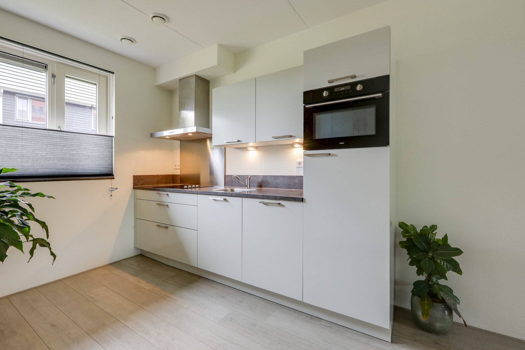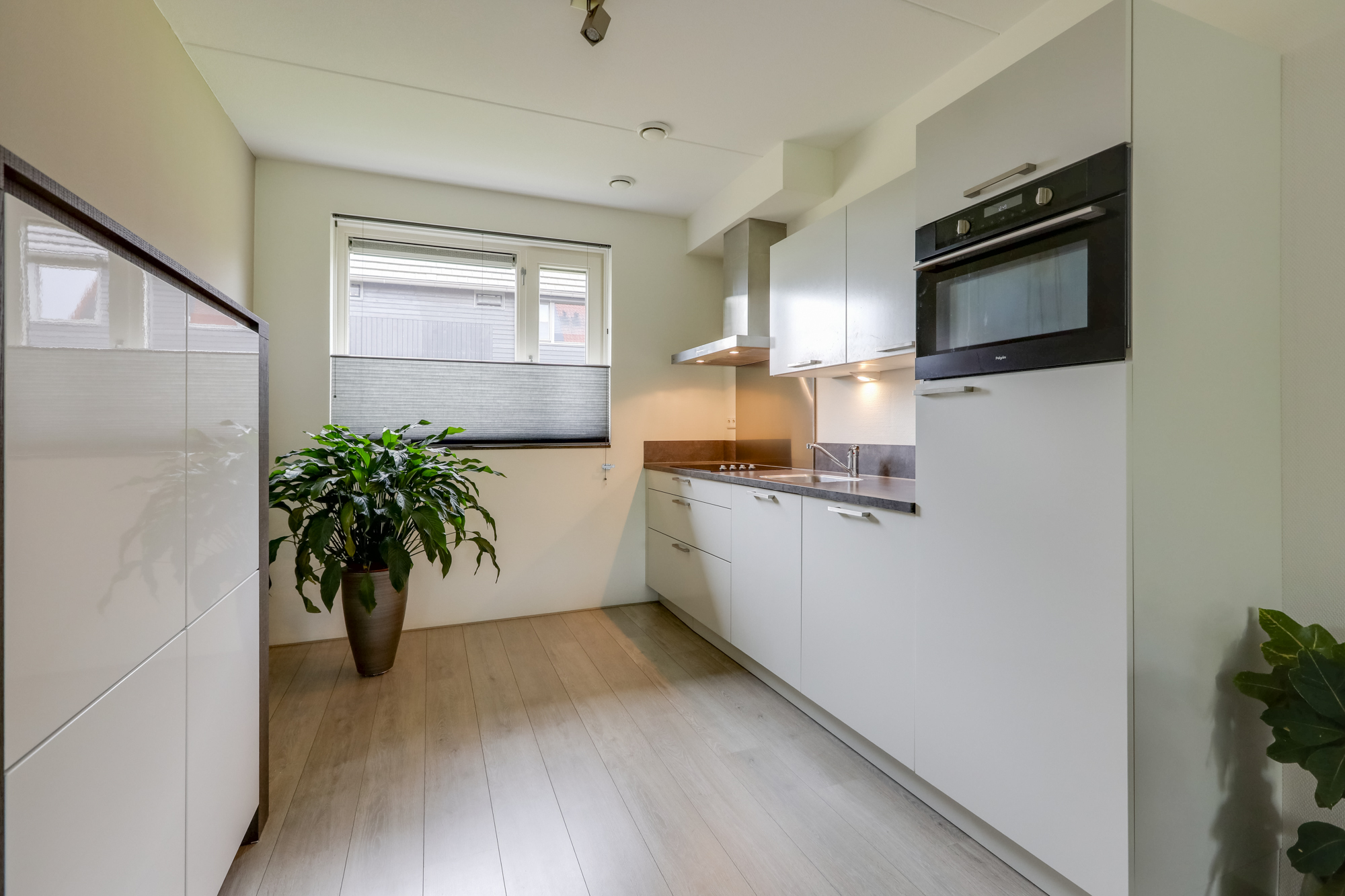 Je komt binnen in de hal met garderobe nis, meterkast (v.v. glasvezel, krachtstroom en stadsverwarming), toiletruimte met hangcloset en fontein. De ruime en lichte woonkamer is strak afgewerkt, met openslaande deuren naar de achtertuin. De open keuken aan de voorzijde is modern en licht, voorzien van diverse inbouwapparatuur zoals een keramische kookplaat, afzuigkap, koelkast, combimagnetron en vaatwasser. De trapkast biedt extra bergruimte.