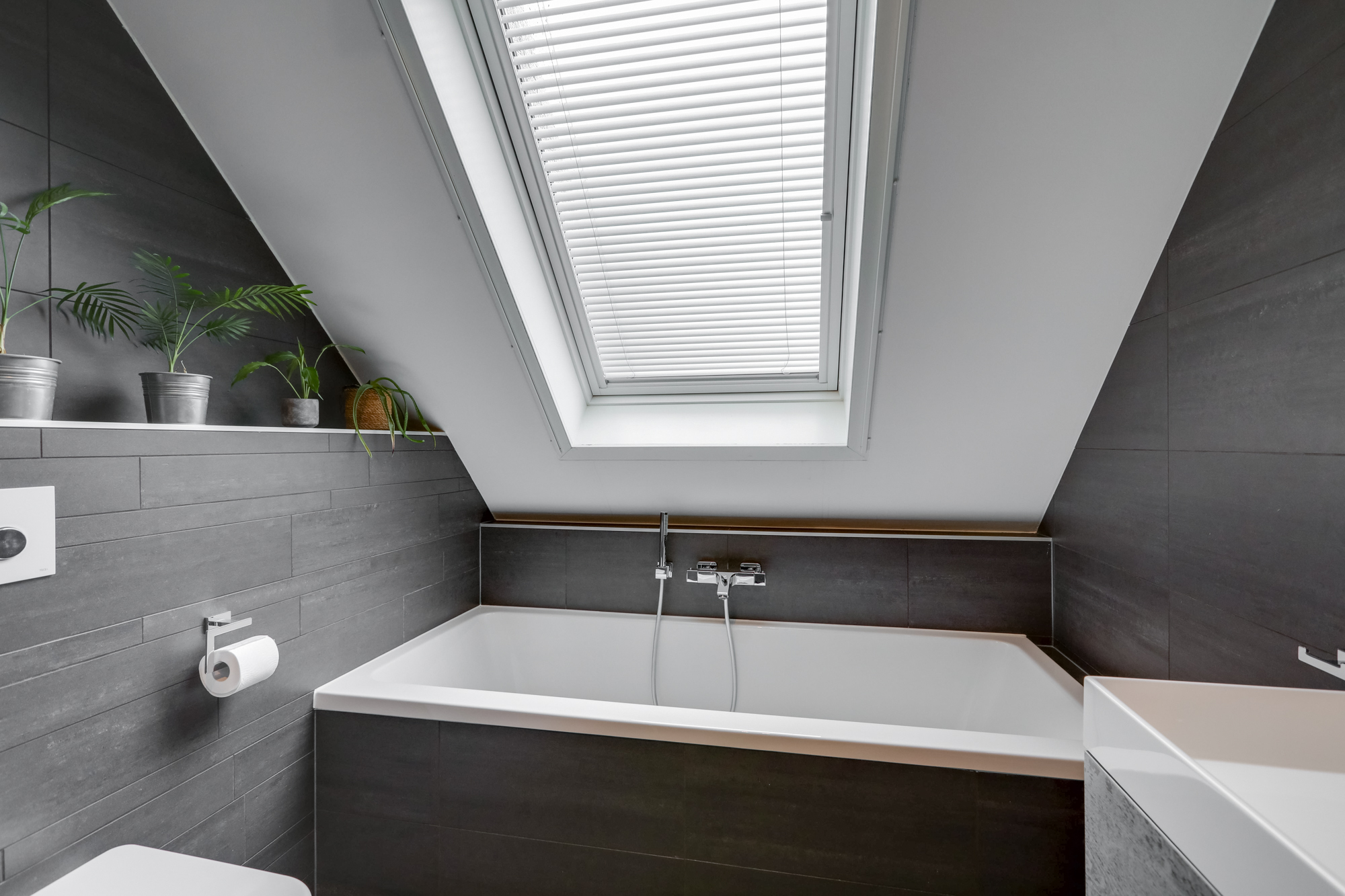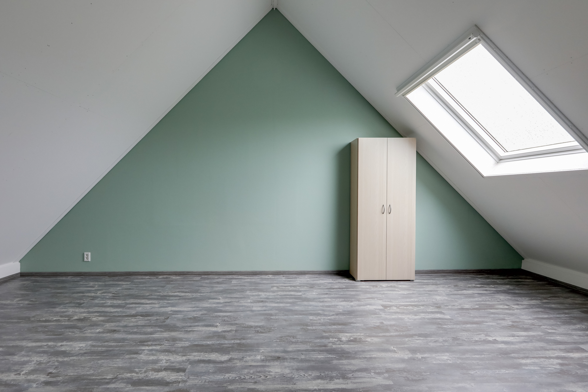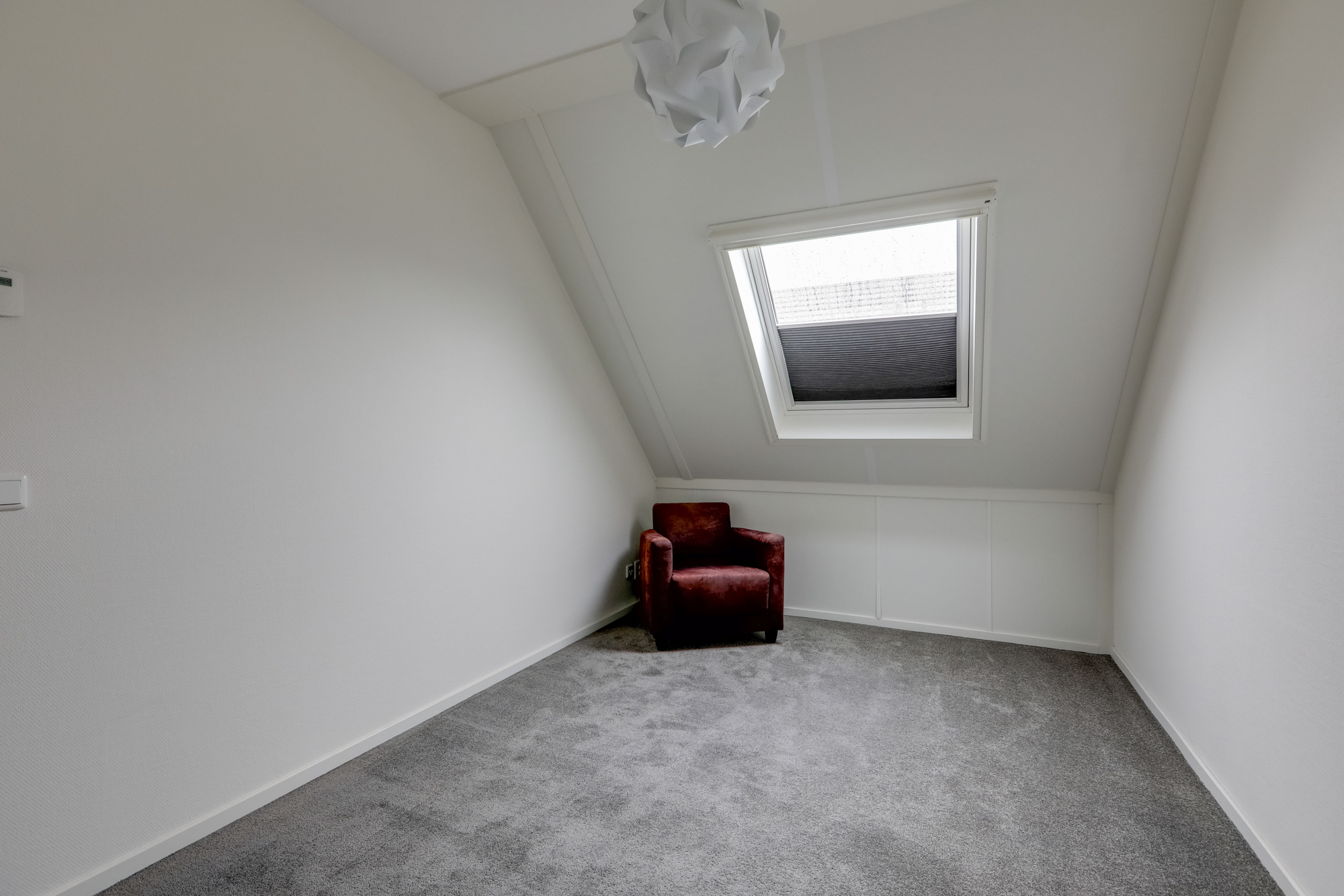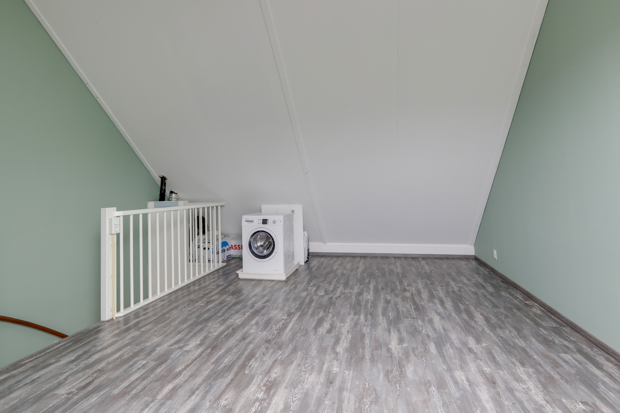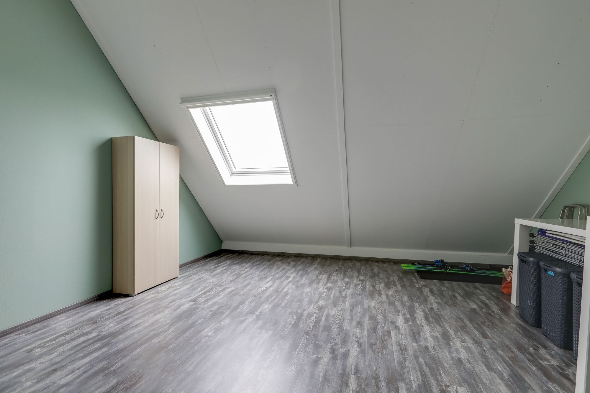 Ruime zolder met groot dakraam, nu in gebruik als bergruimte. Deze ruimte leent zich echter ook perfect als vierde slaapkamer, werkplek of hobbyruimte. Verder vinden we hier de aansluitingen voor het witgoed en de mechanische ventilatiebox.