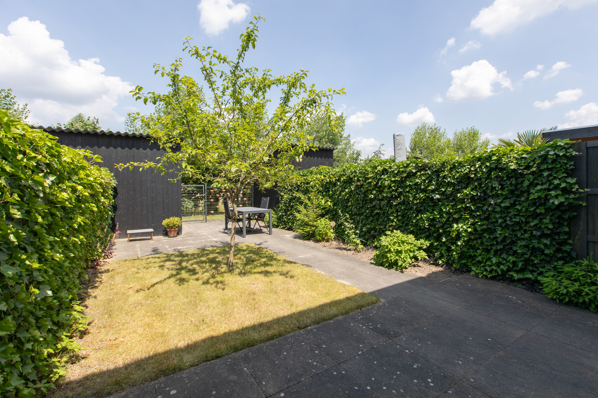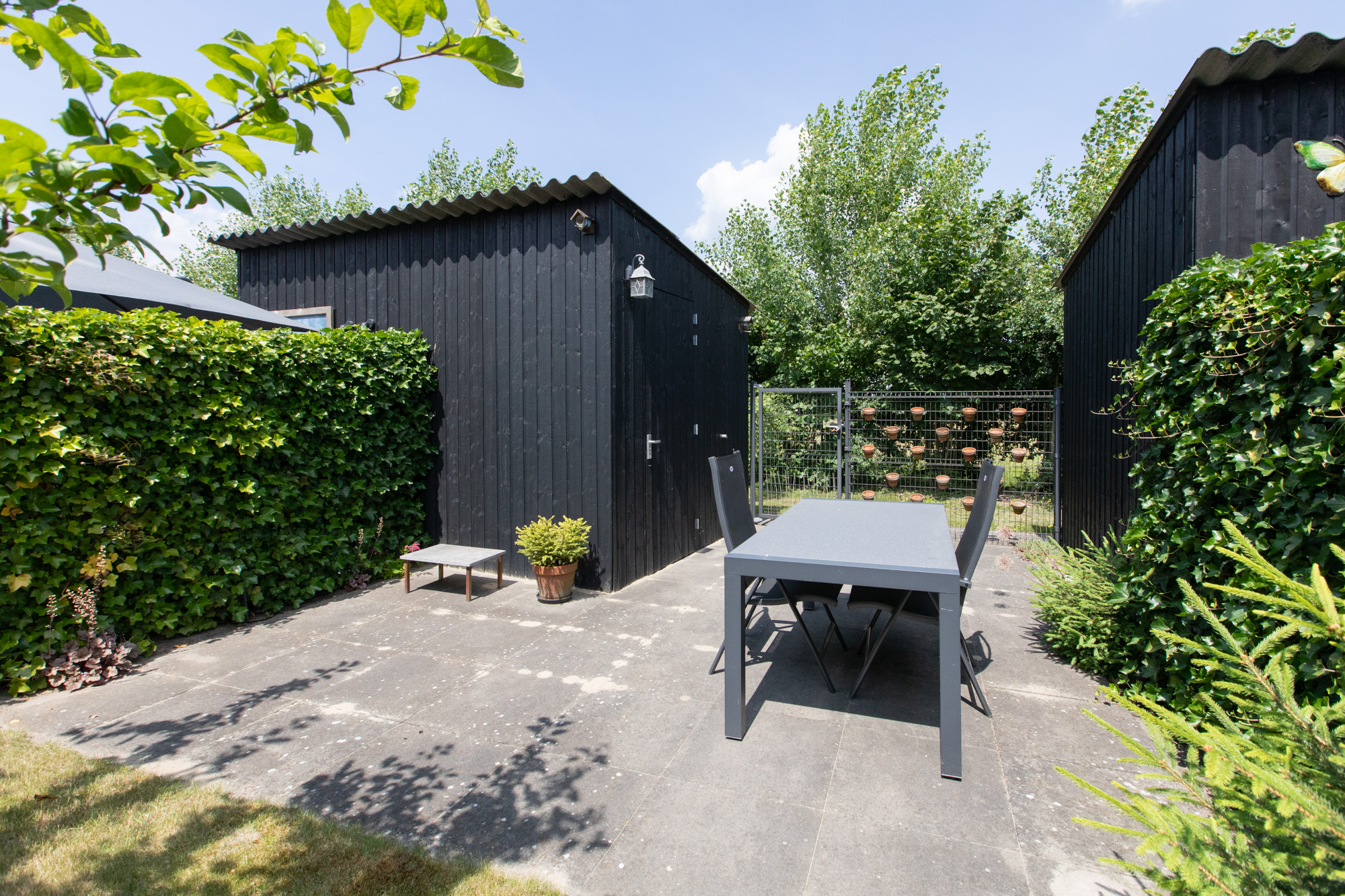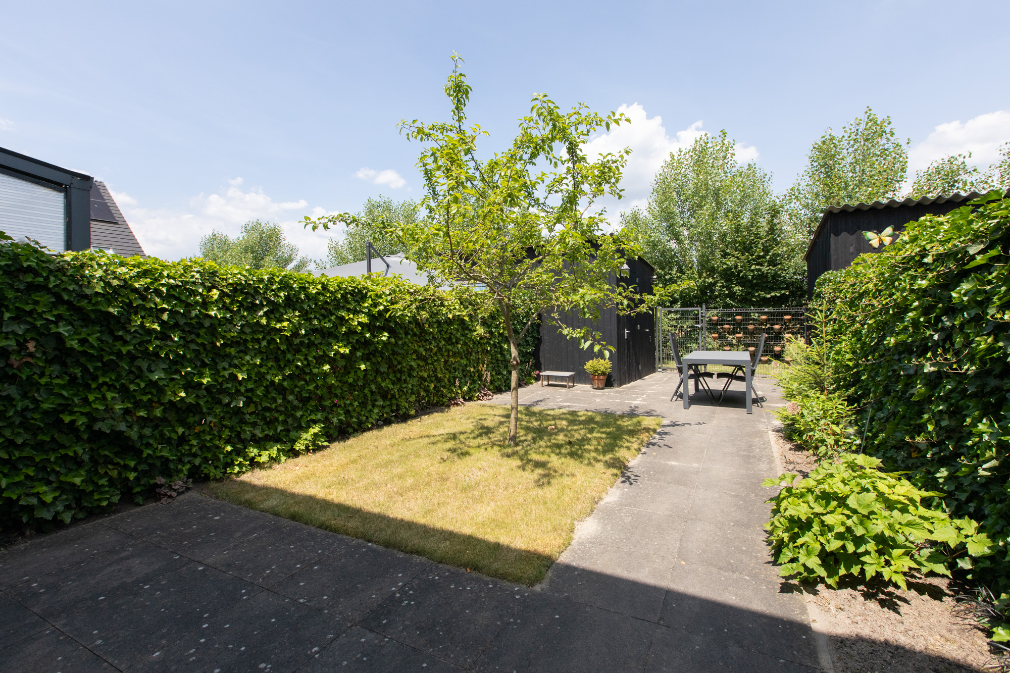 De achtertuin is verzorgd en onderhoudsvriendelijk ingericht met een combinatie van terras en gazon. Achterin staat een vrijstaande houten berging (ca. 5,7 m²) en je hebt toegang via de achterom. De ligging op het noorden zorgt voor fijne verkoeling in de zomer.