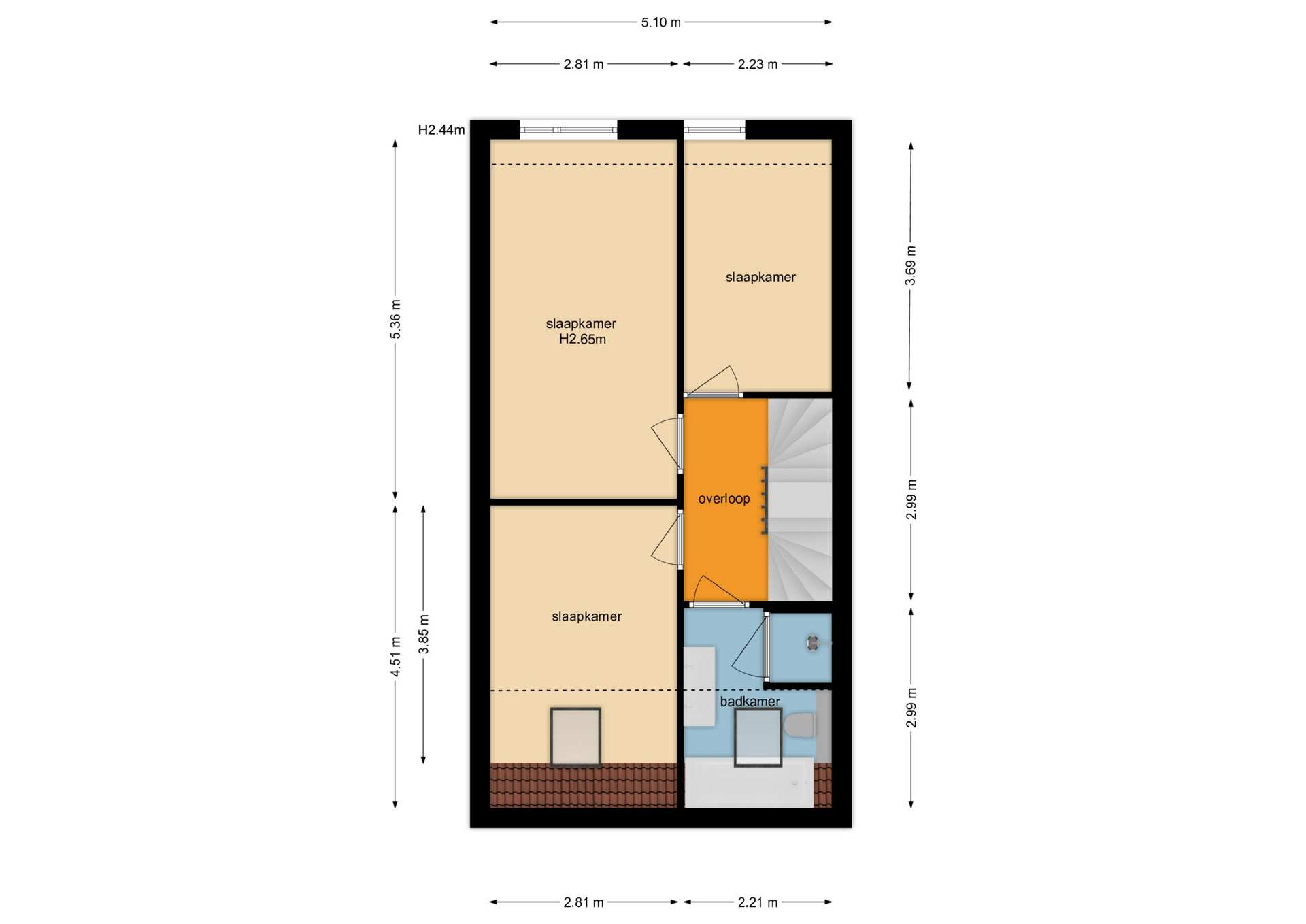 Via de overloop bereik je drie ruime slaapkamers. De moderne badkamer is voorzien van een ruime inloopdouche, een ligbad, dubbele wastafel met meubel en een tweede toilet.