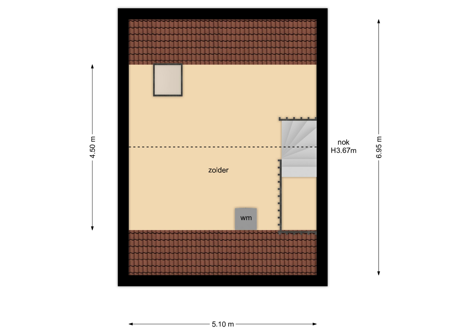 Ruime zolder met groot dakraam, nu in gebruik als bergruimte. Deze ruimte leent zich echter ook perfect als vierde slaapkamer, werkplek of hobbyruimte. Verder vinden we hier de aansluitingen voor het witgoed en de mechanische ventilatiebox.