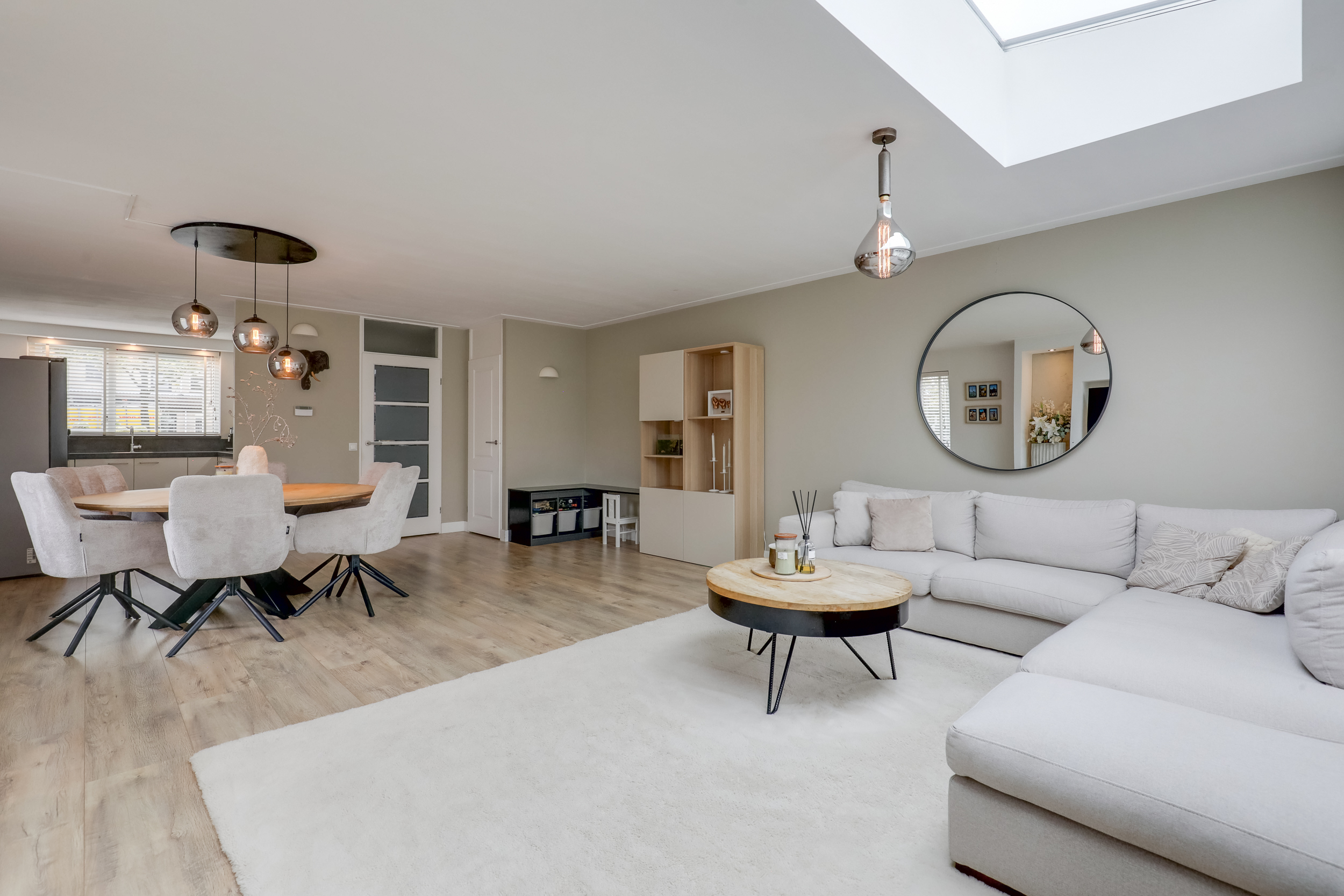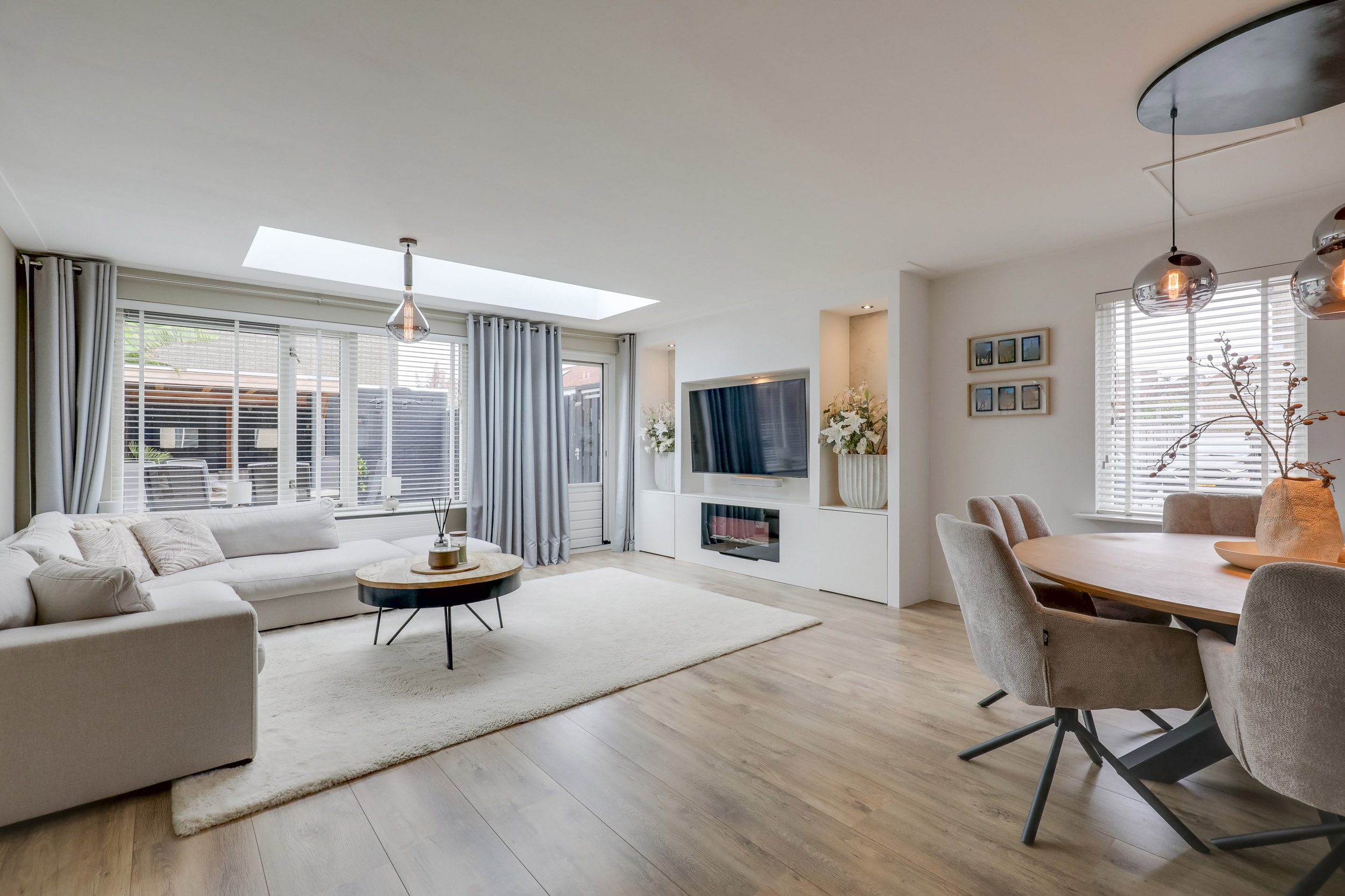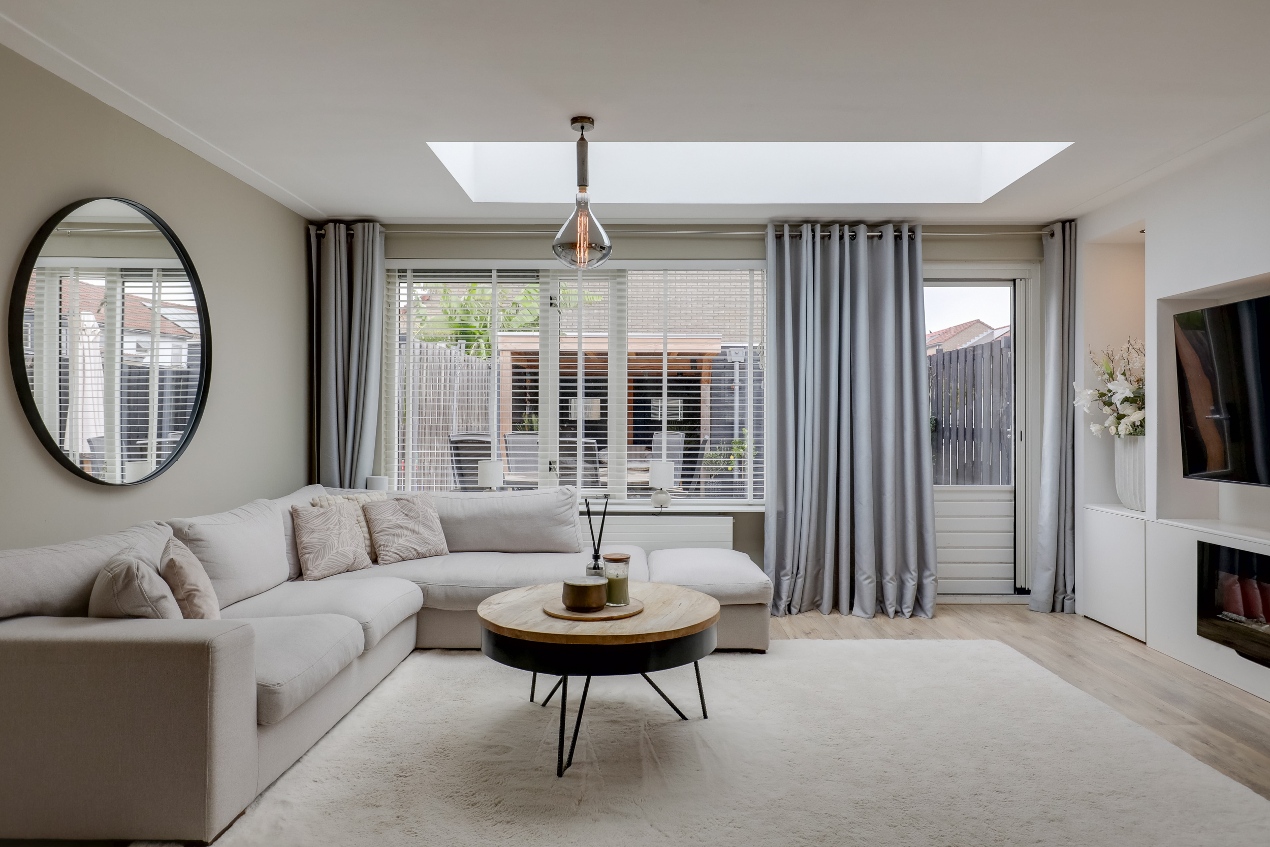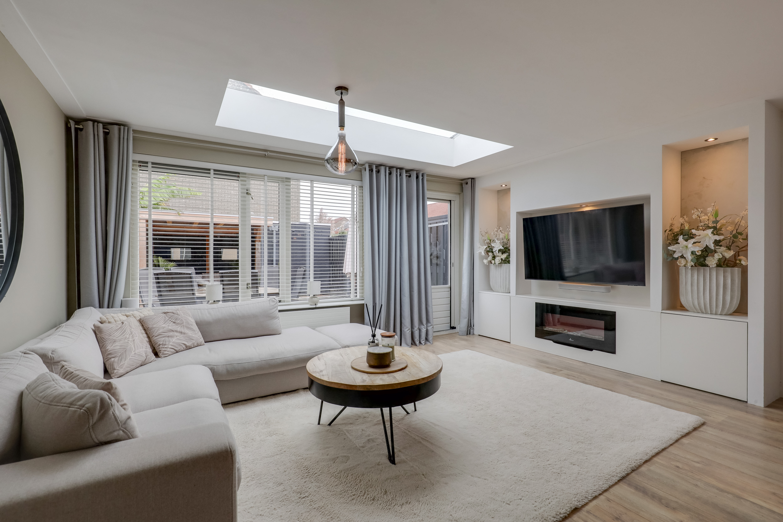 De woonkamer is in 2017 uitgebouwd en biedt daardoor extra veel leefruimte. De lichtstraat in het dak zorgt voor een fijne, natuurlijke lichtinval. De wanden en plafonds zijn strak gestuukt, er ligt een moderne laminaatvloer en de Cinewall geeft de ruimte een eigentijdse uitstraling.