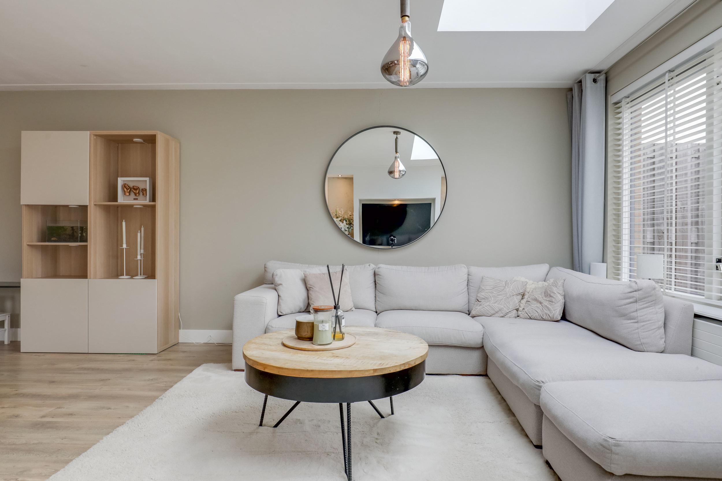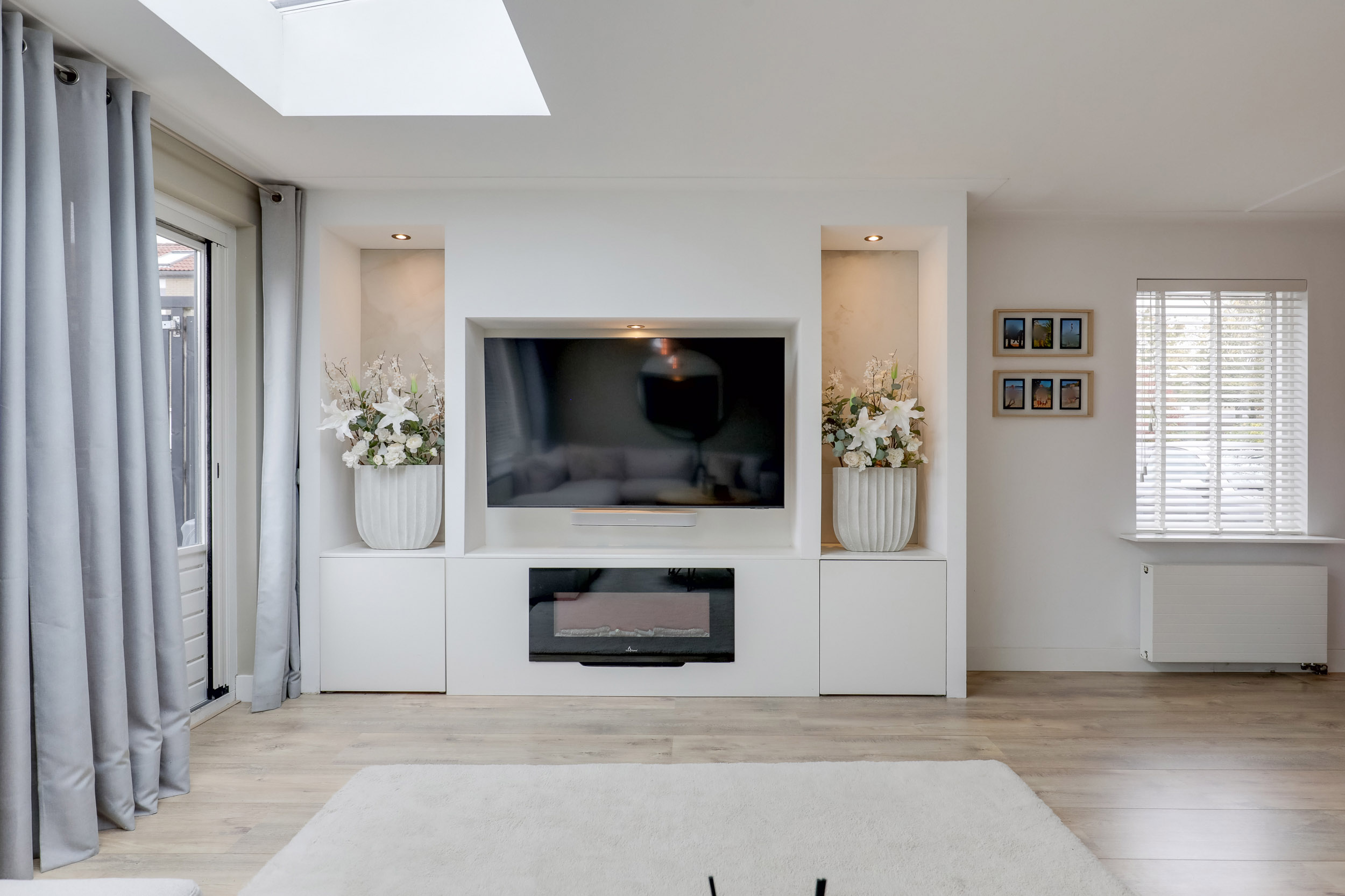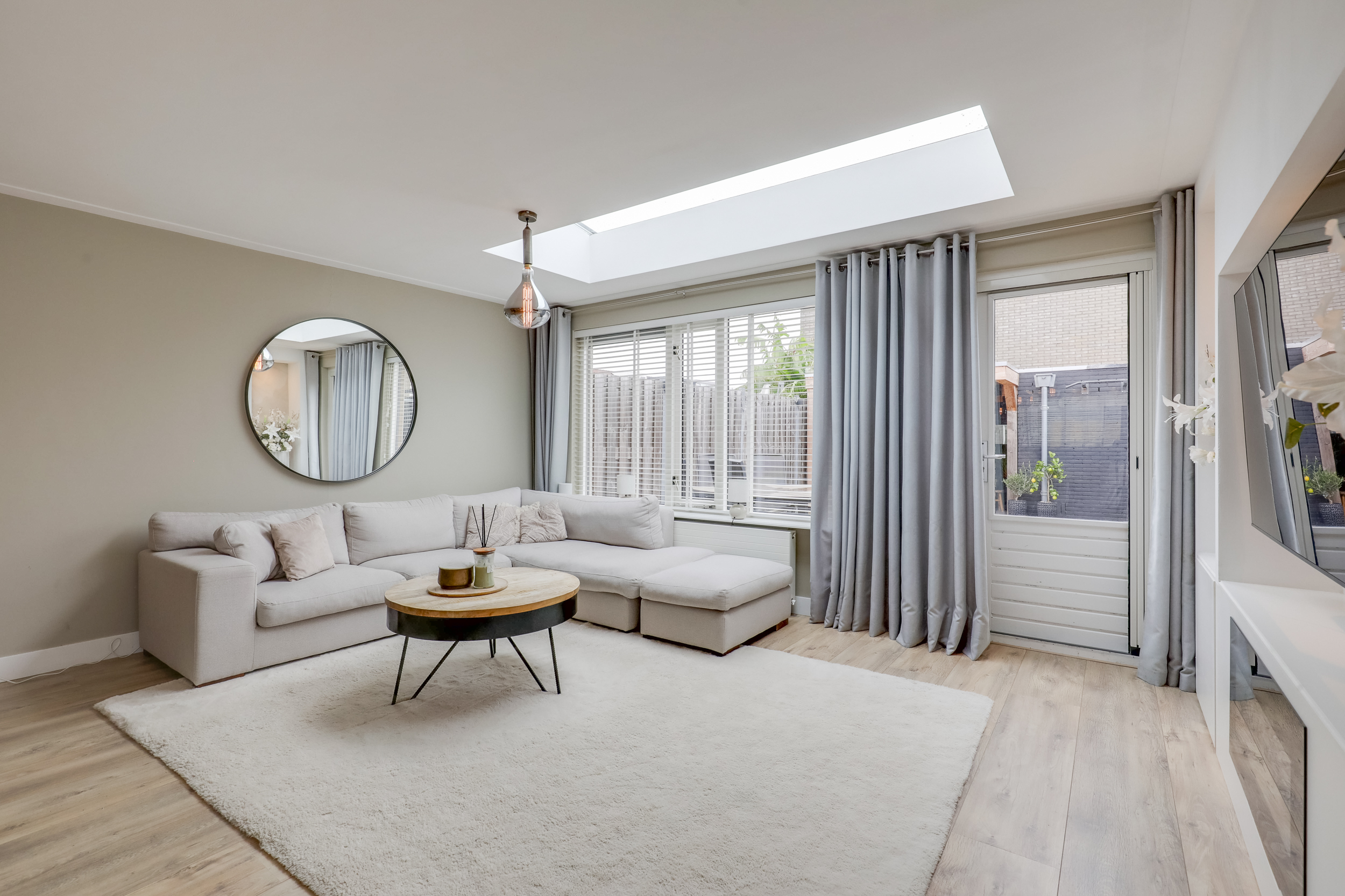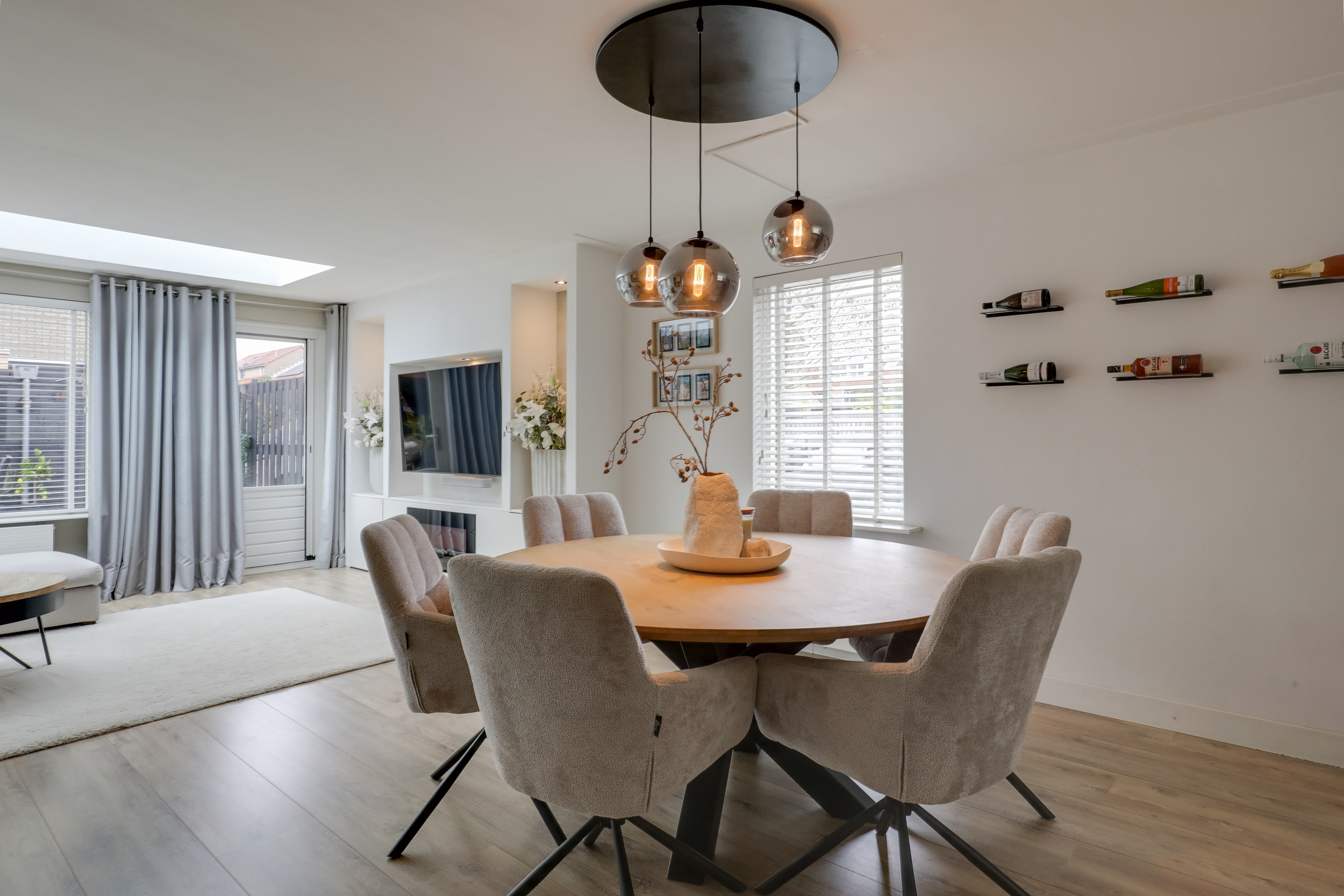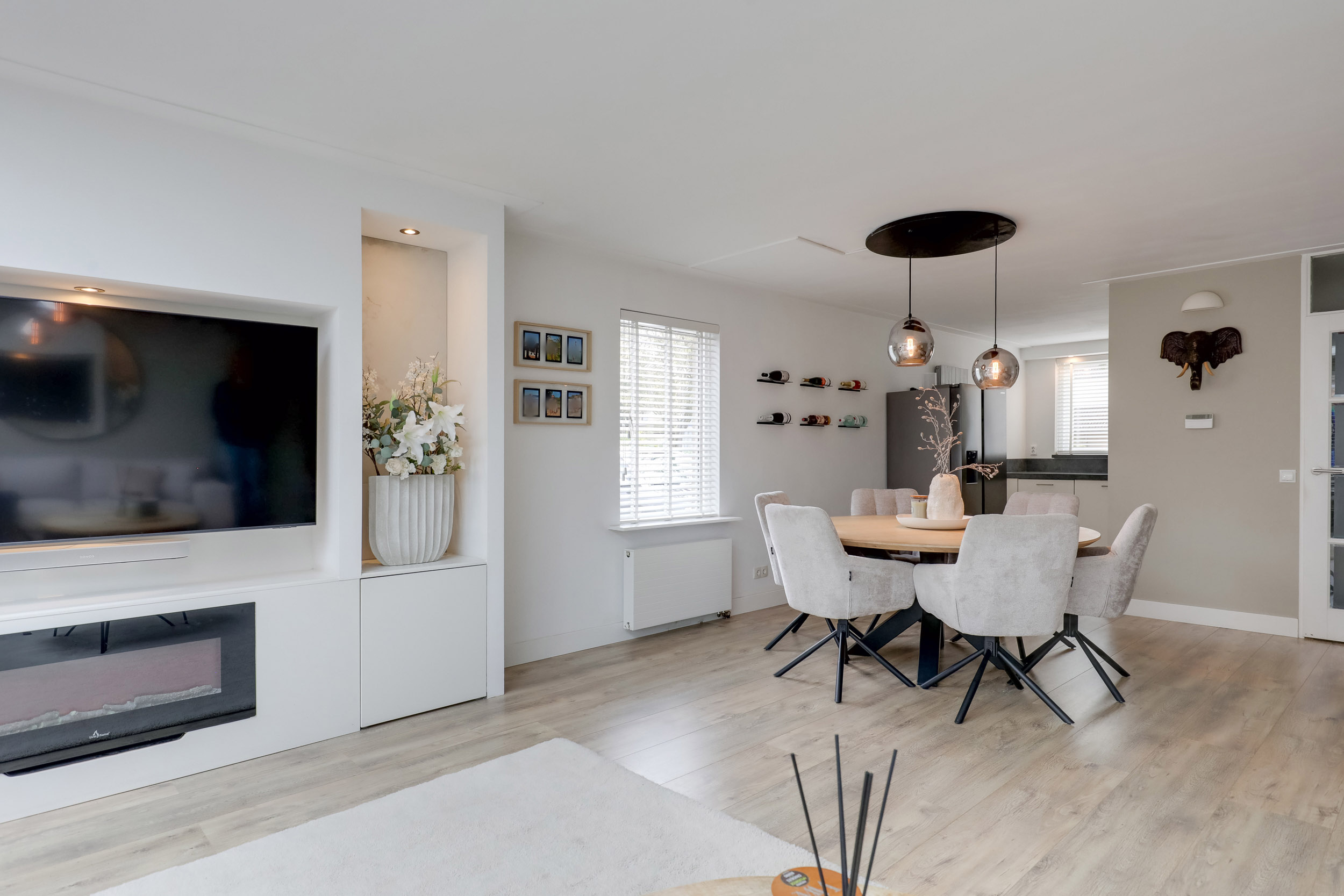 De woonkamer is in 2017 uitgebouwd en biedt daardoor extra veel leefruimte. De lichtstraat in het dak zorgt voor een fijne, natuurlijke lichtinval. De wanden en plafonds zijn strak gestuukt, er ligt een moderne laminaatvloer en de Cinewall geeft de ruimte een eigentijdse uitstraling.