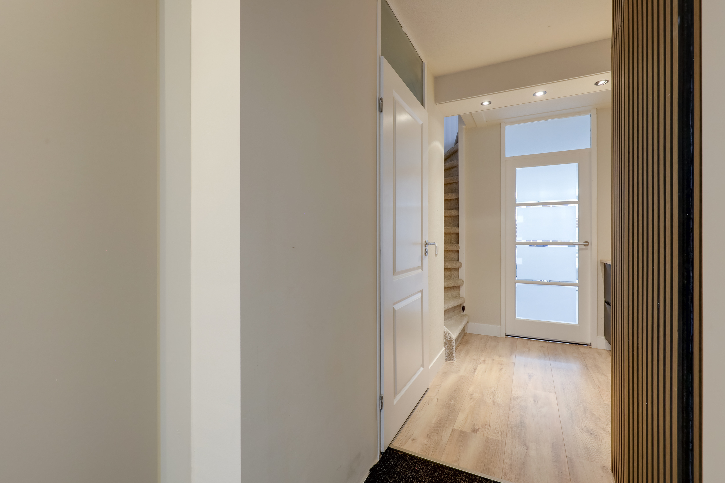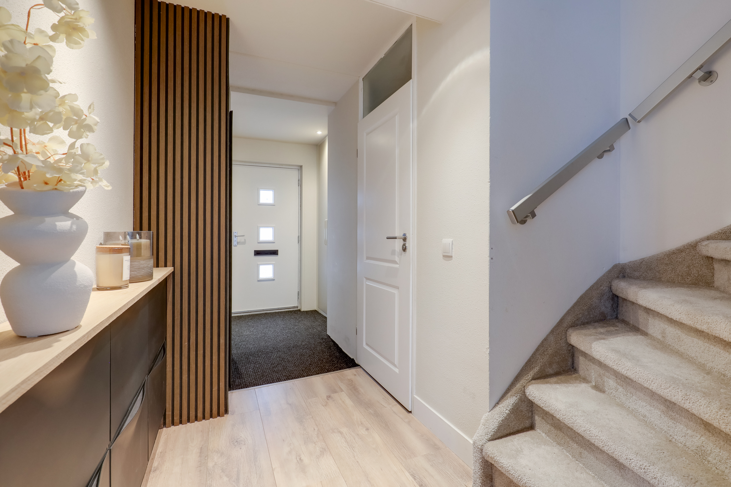 Via de ruime entree hal die in 2025 naar voren toe is uitgebouwd entree tot de woning. Voldoende plek voor garderobe, eventueel kinderwagen of andere spullen. Meterkast en toiletruimte.