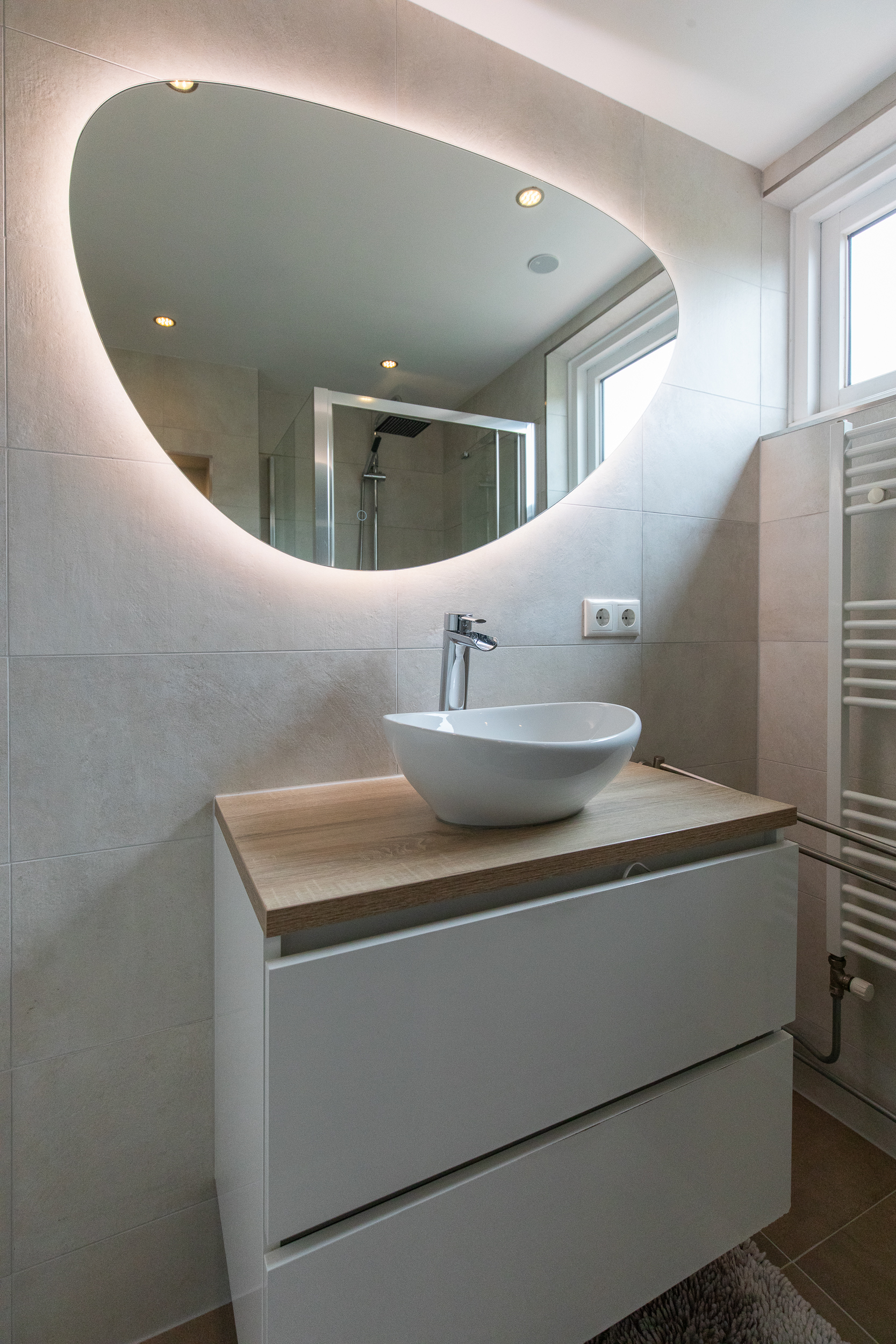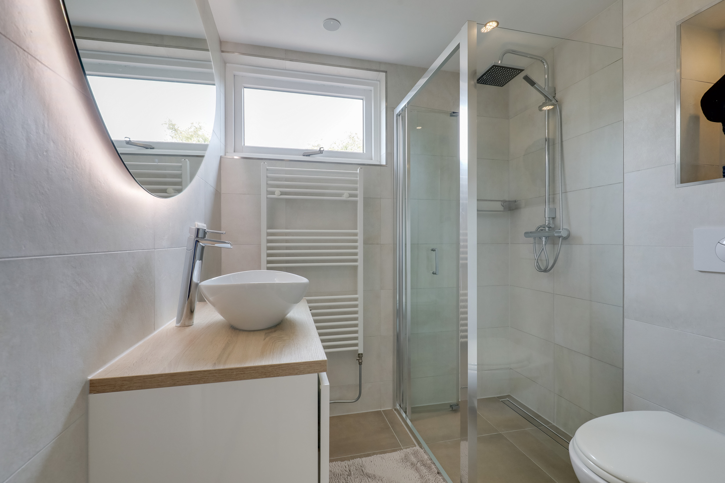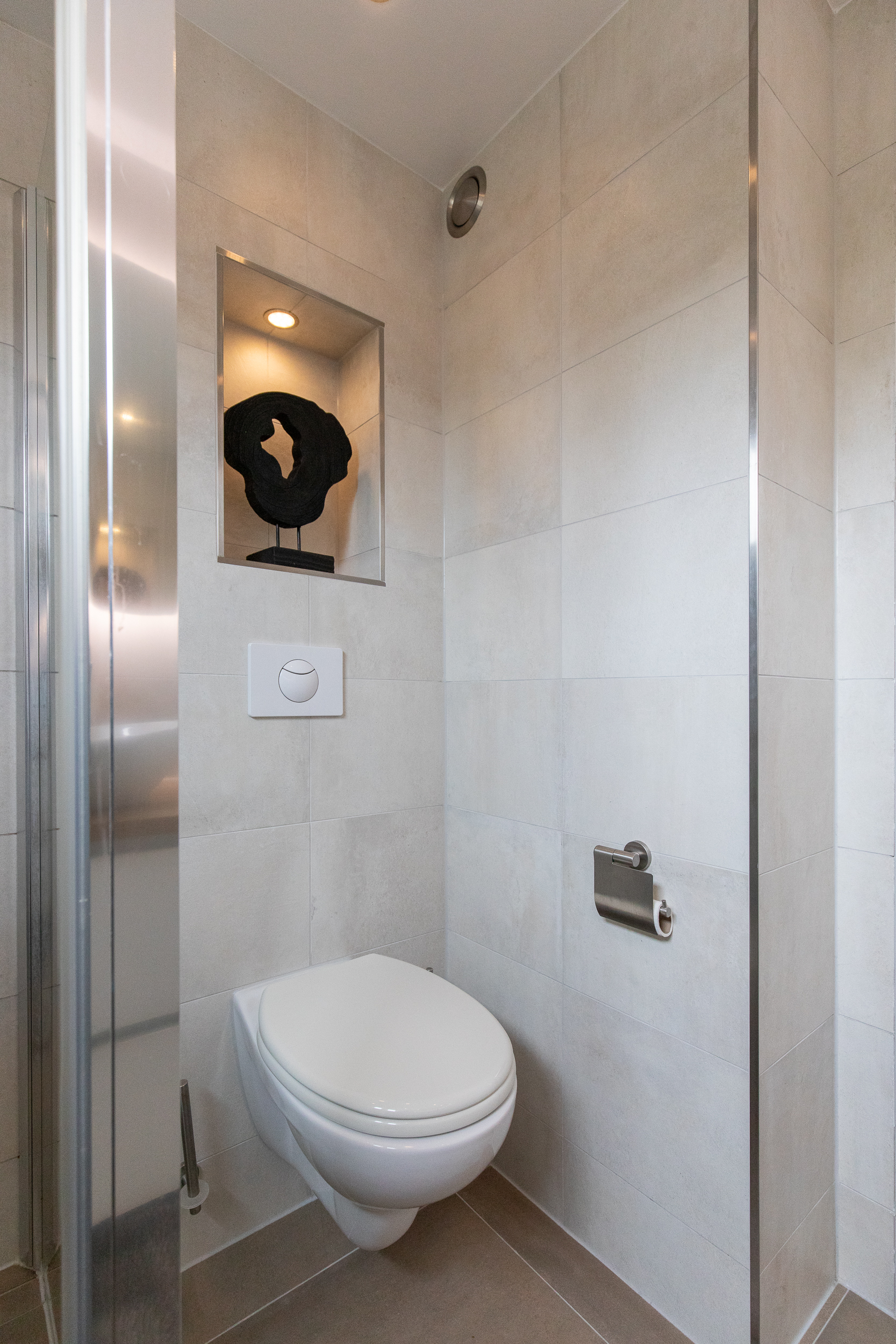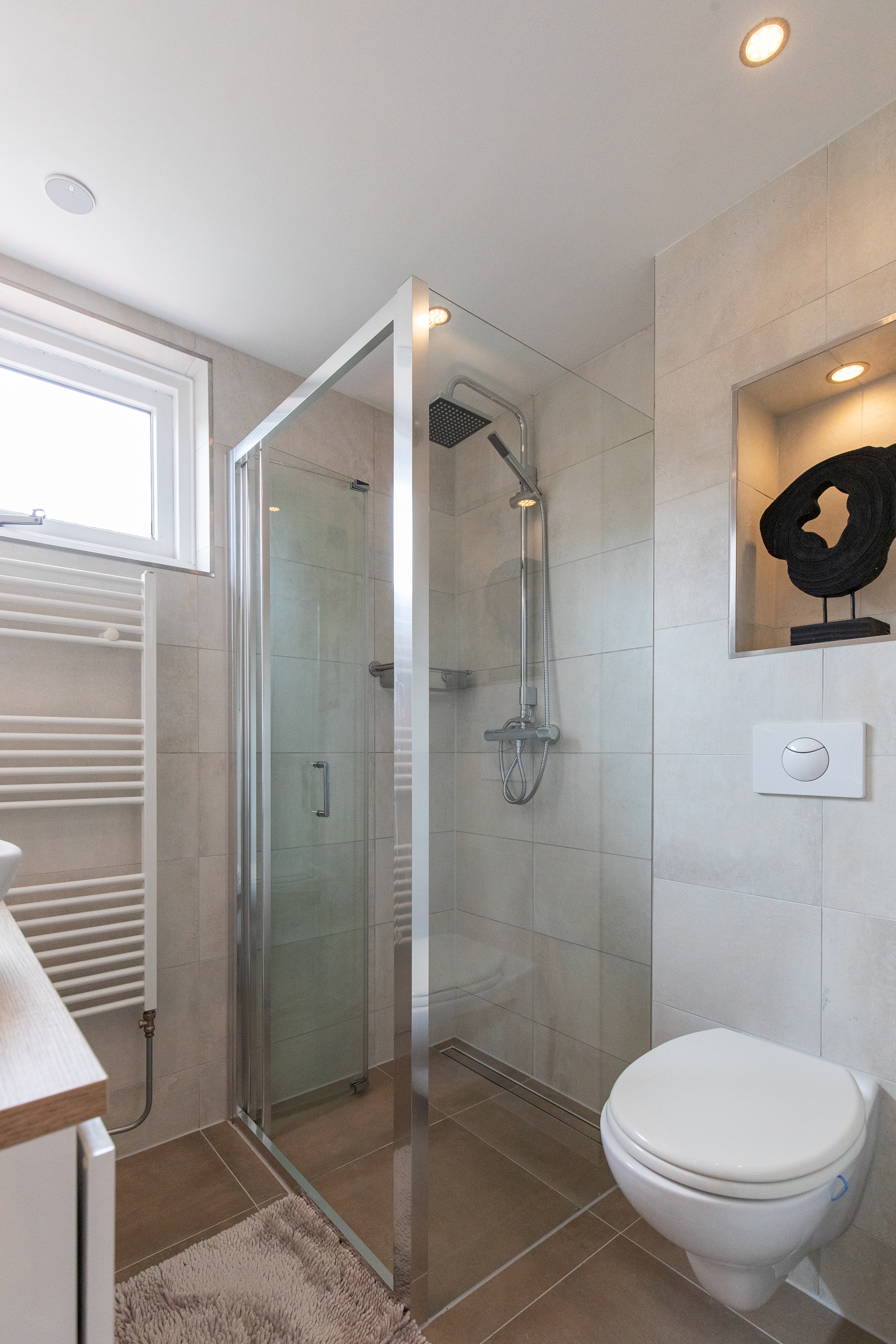 De moderne badkamer (2017) met douche, toilet, wastafelmeubel en mechanische ventilatie.