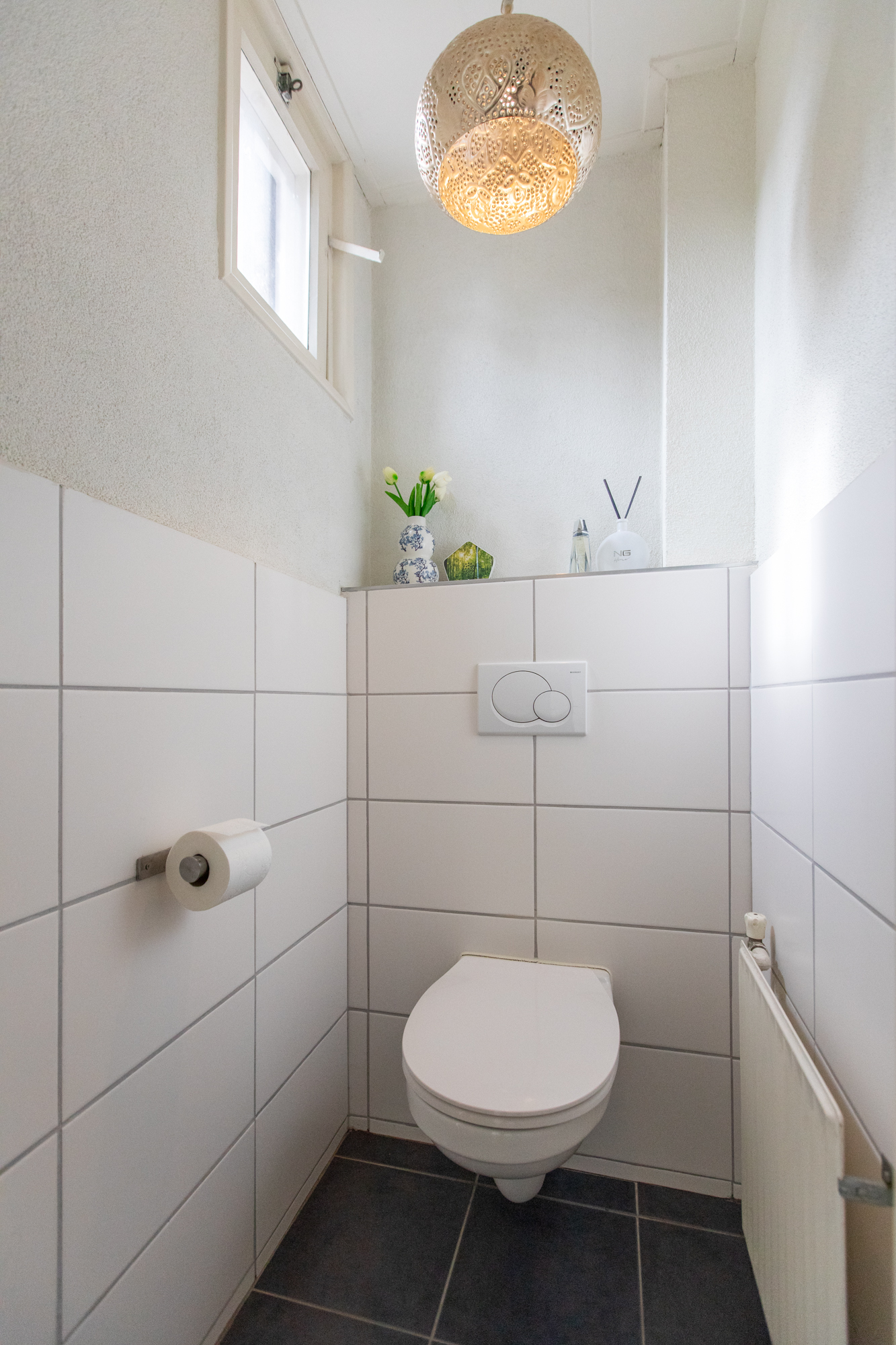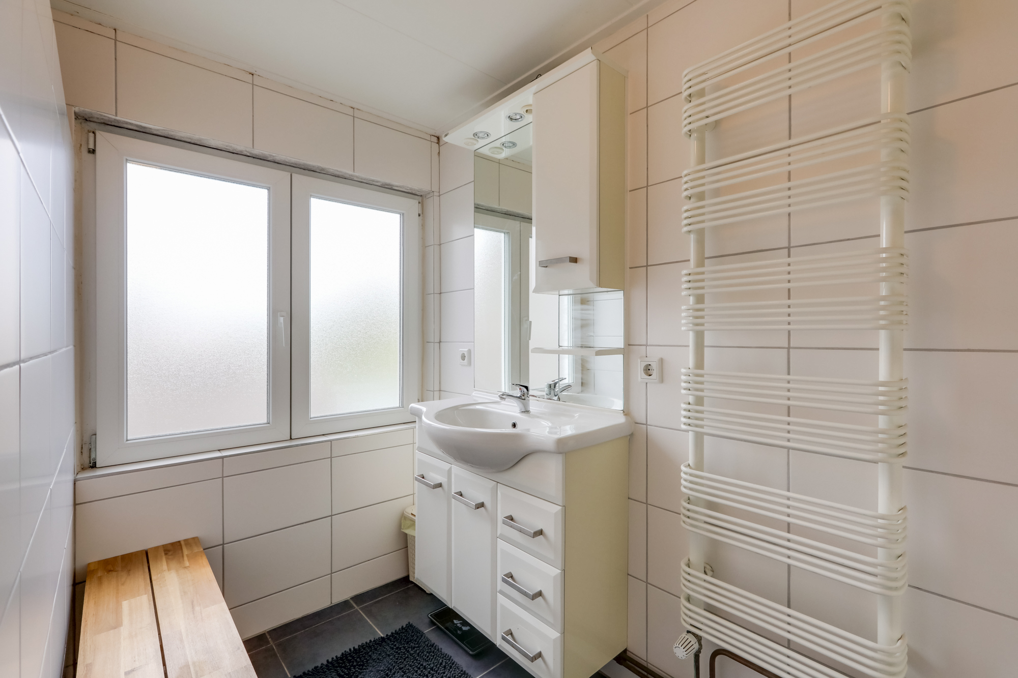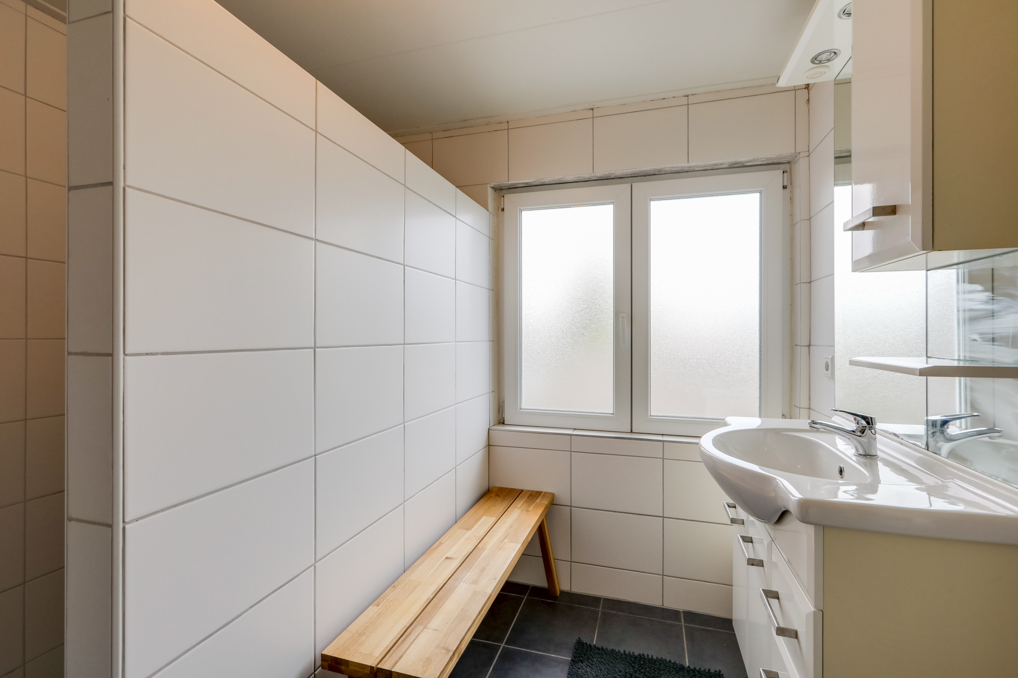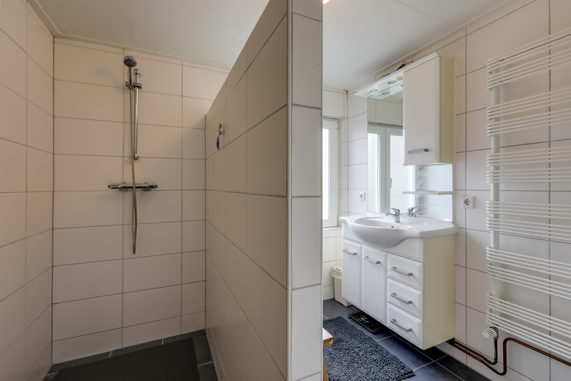 • Badkamer op de achterzijde (voormalige slaapkamer) met ruime inloopdouche, wastafelmeubel en toilet