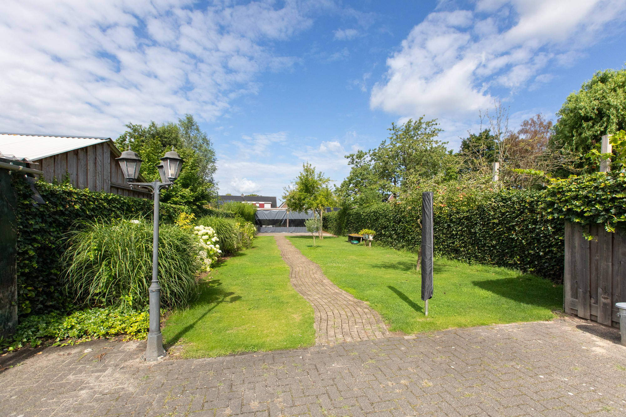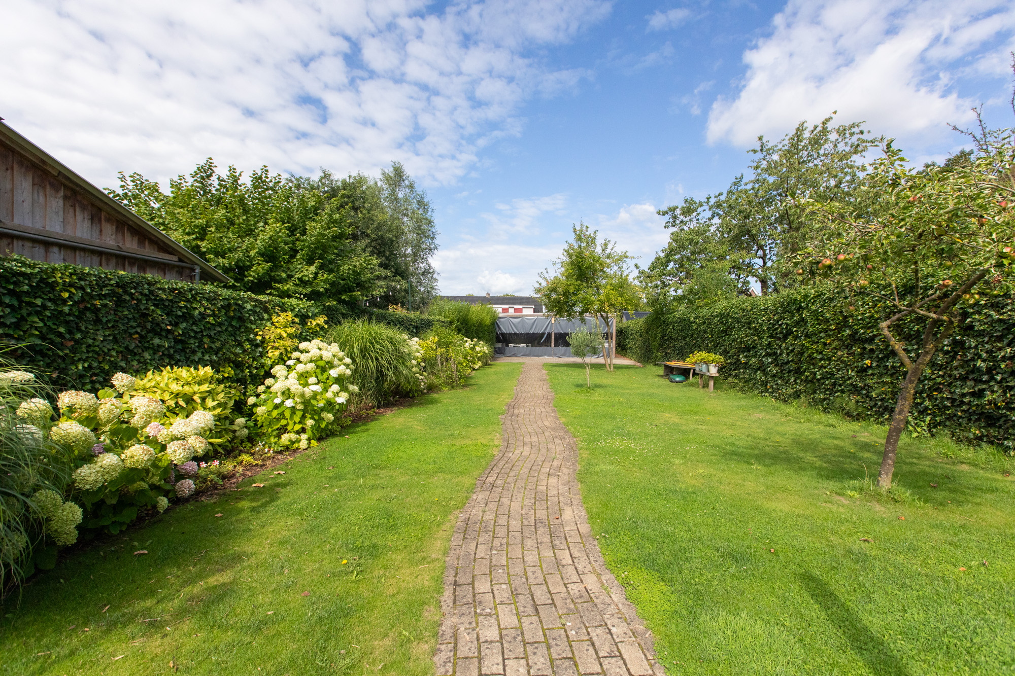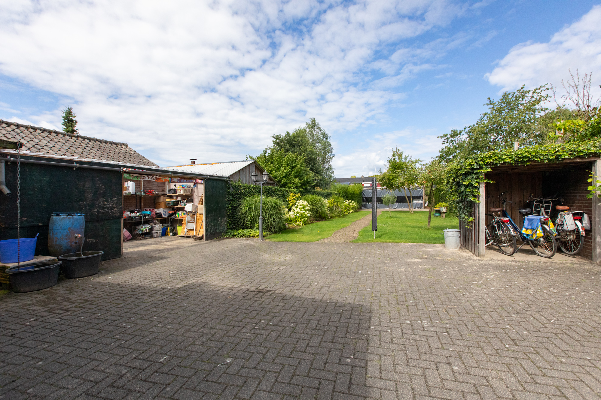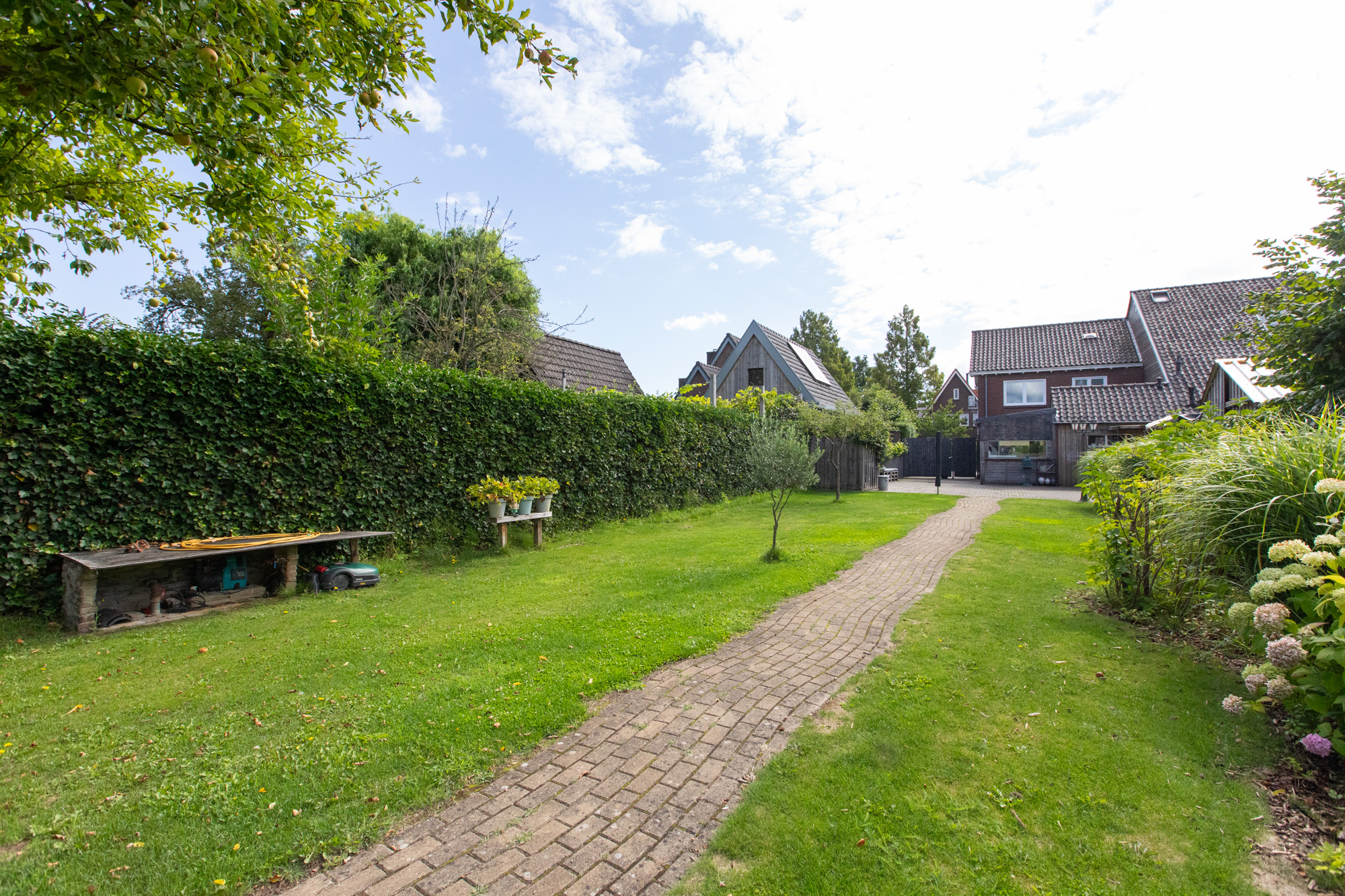 Riante achtertuin met fraaie vrije ligging, voorzien van diverse vaste beplanting, fruitbomen en een groot gazon. Achterin de tuin bevindt zich een grote overkapping / schuur met veel opslagruimte, ideaal voor hobby’s of als opslagplek voor zzp’ers. Aan de voorzijde van de woning is een ruime oprit aanwezig.