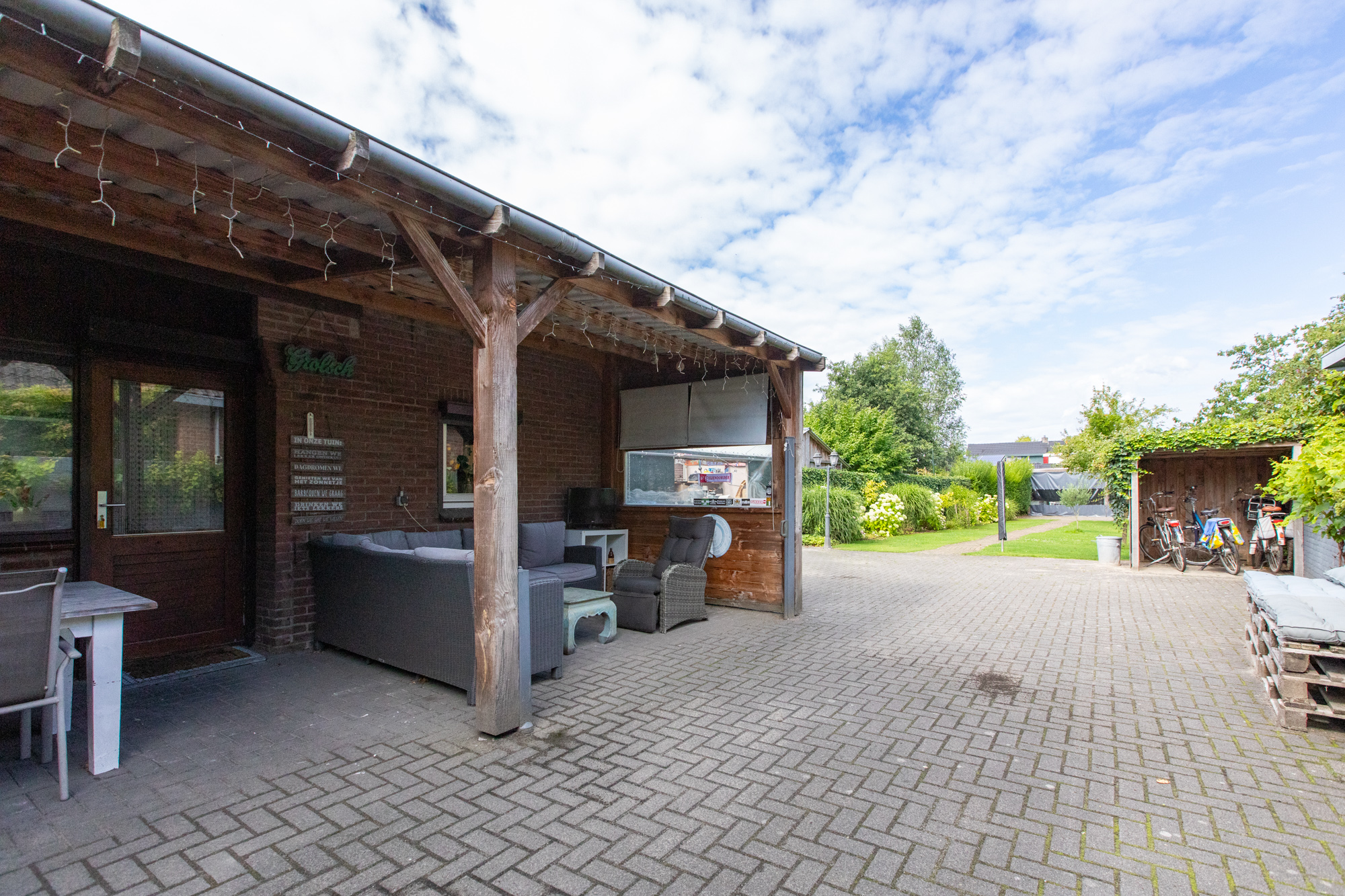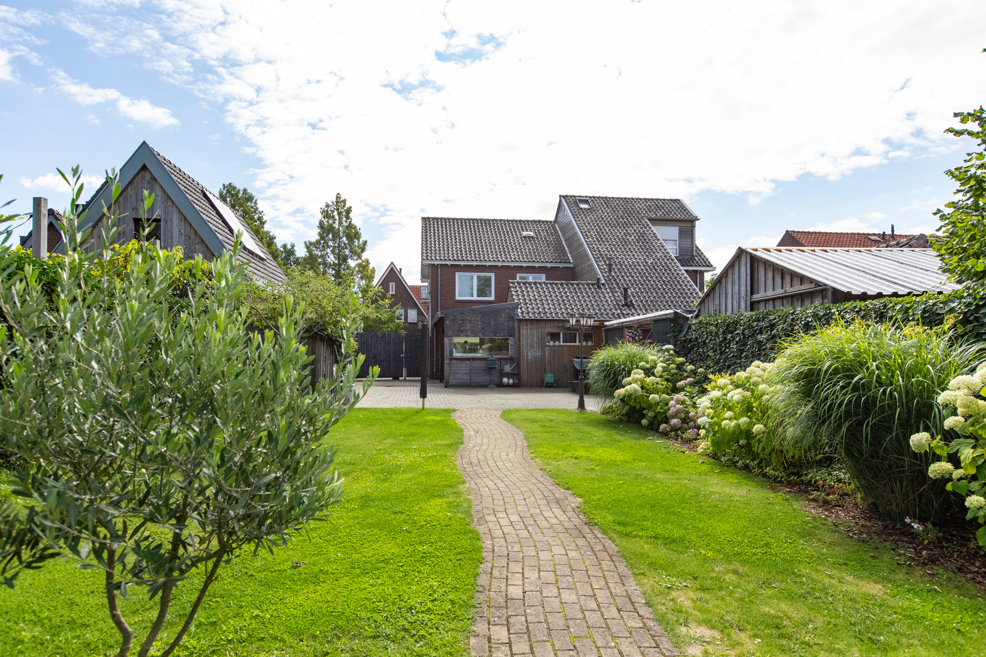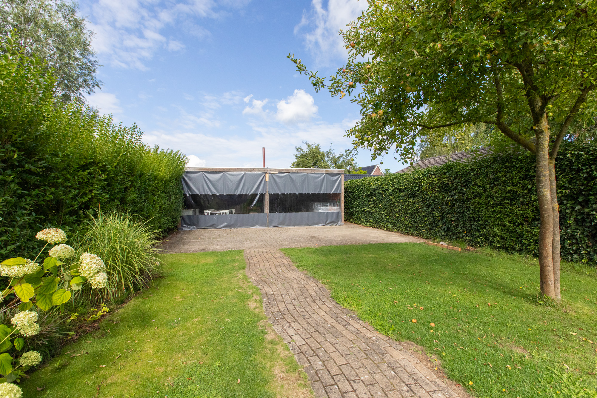 Riante achtertuin met fraaie vrije ligging, voorzien van diverse vaste beplanting, fruitbomen en een groot gazon. Achterin de tuin bevindt zich een grote overkapping / schuur met veel opslagruimte, ideaal voor hobby’s of als opslagplek voor zzp’ers. Aan de voorzijde van de woning is een ruime oprit aanwezig.