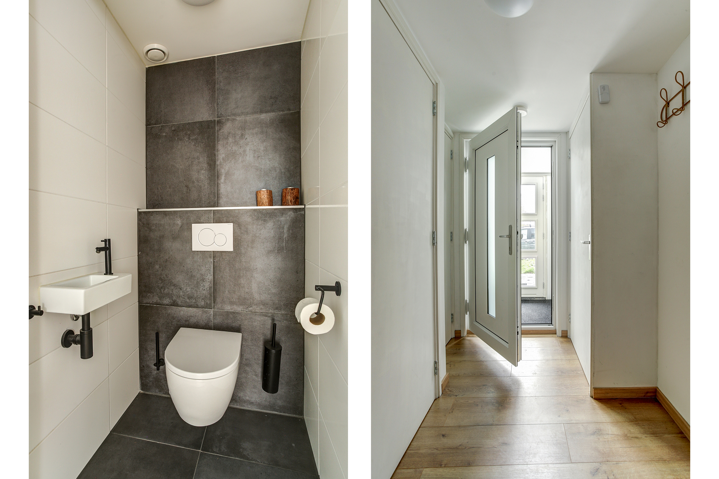 Voorentree naar de hal met de meterkast, trapkast, wasruimte en het toilet. U loopt door naar de lichte woonkamer met grote raampartijen, openslaande tuindeuren, laminaatvloer en gestuukte wanden en plafond. Open keuken met recht keukenblok, koel-vriescombinatie, vaatwasser, Quooker, combi oven en inductie kookplaat met geïntegreerde afzuigkap. Beneden treft u tevens nog een tweepersoons slaapkamer met badkamer en suite. De badkamer is betegeld heeft een wastafel en inloopdouche.