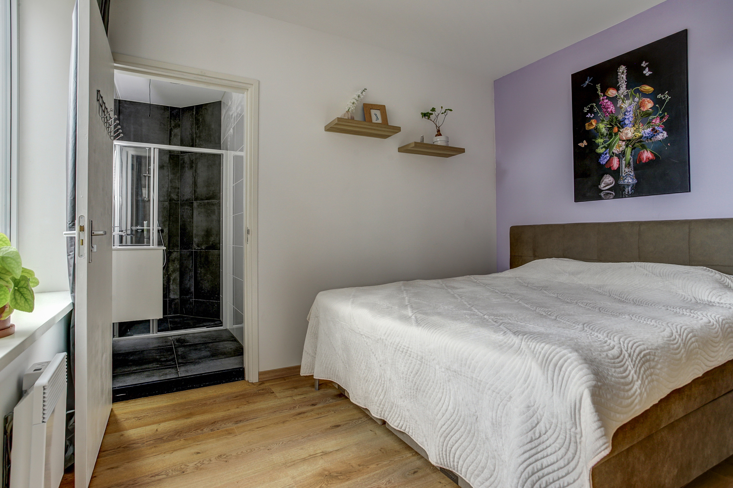 U komt boven op de overloop. Op de eerste verdieping zijn drie slaapkamers met allen een raampartij, elektrische radiator, laminaatvloer en gestuukte wanden en plafond. Moderne betegelde badkamer met toilet, wastafel en inloopdouche.