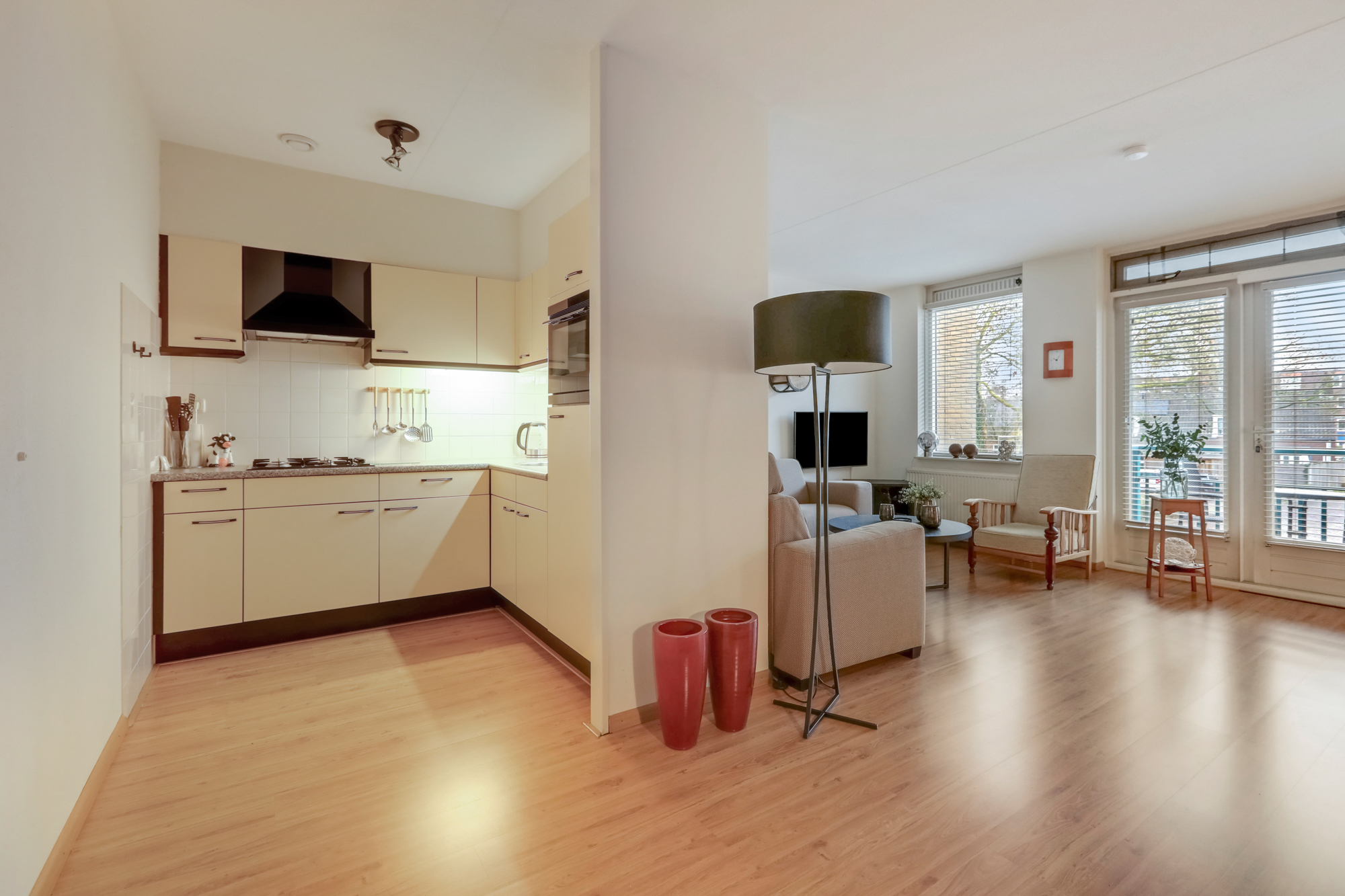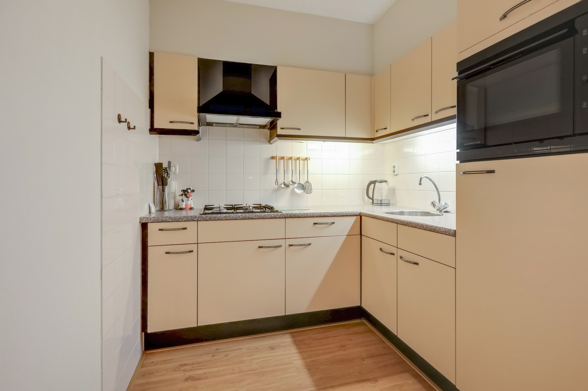De halfopen keuken grenst aan de ruime en lichte woonkamer, welke toegang biedt tot het balkon via naar buiten openslaande deuren. De verzorgde keuken in hoekopstelling is uitgerust met diverse inbouwapparatuur, waaronder een koelkast, combimagnetron, en gaskookplaat met afzuigkap.