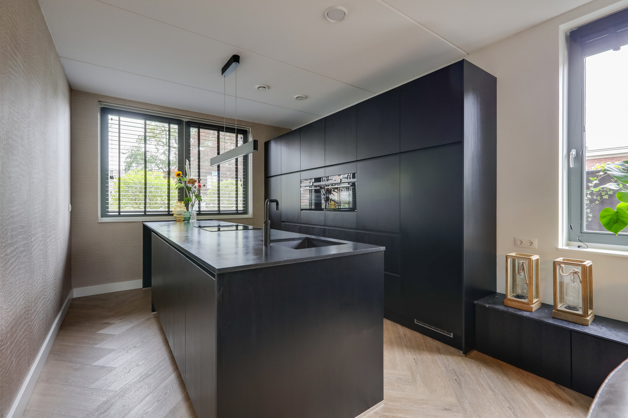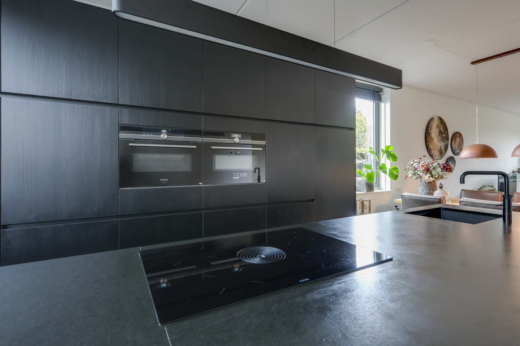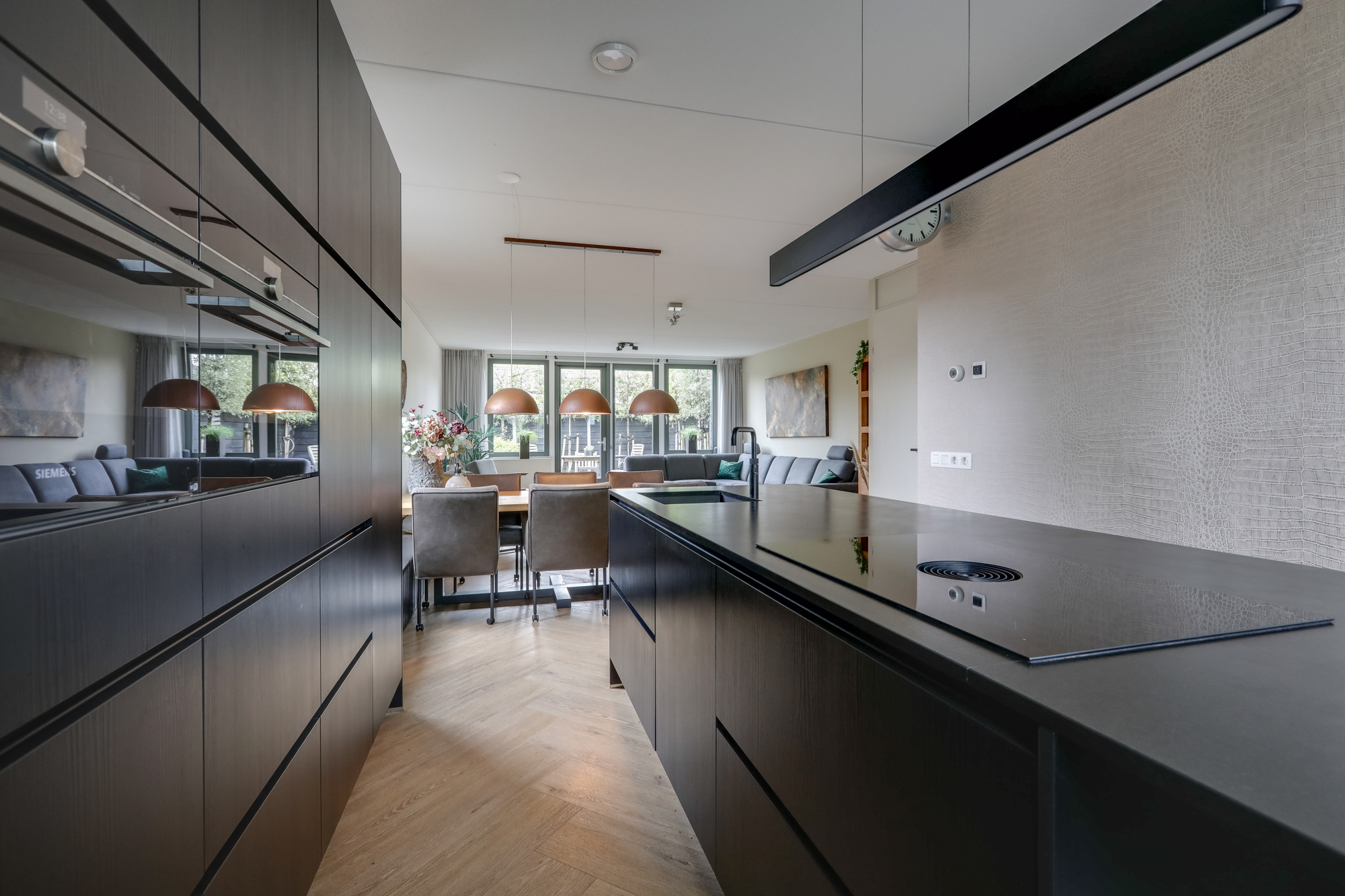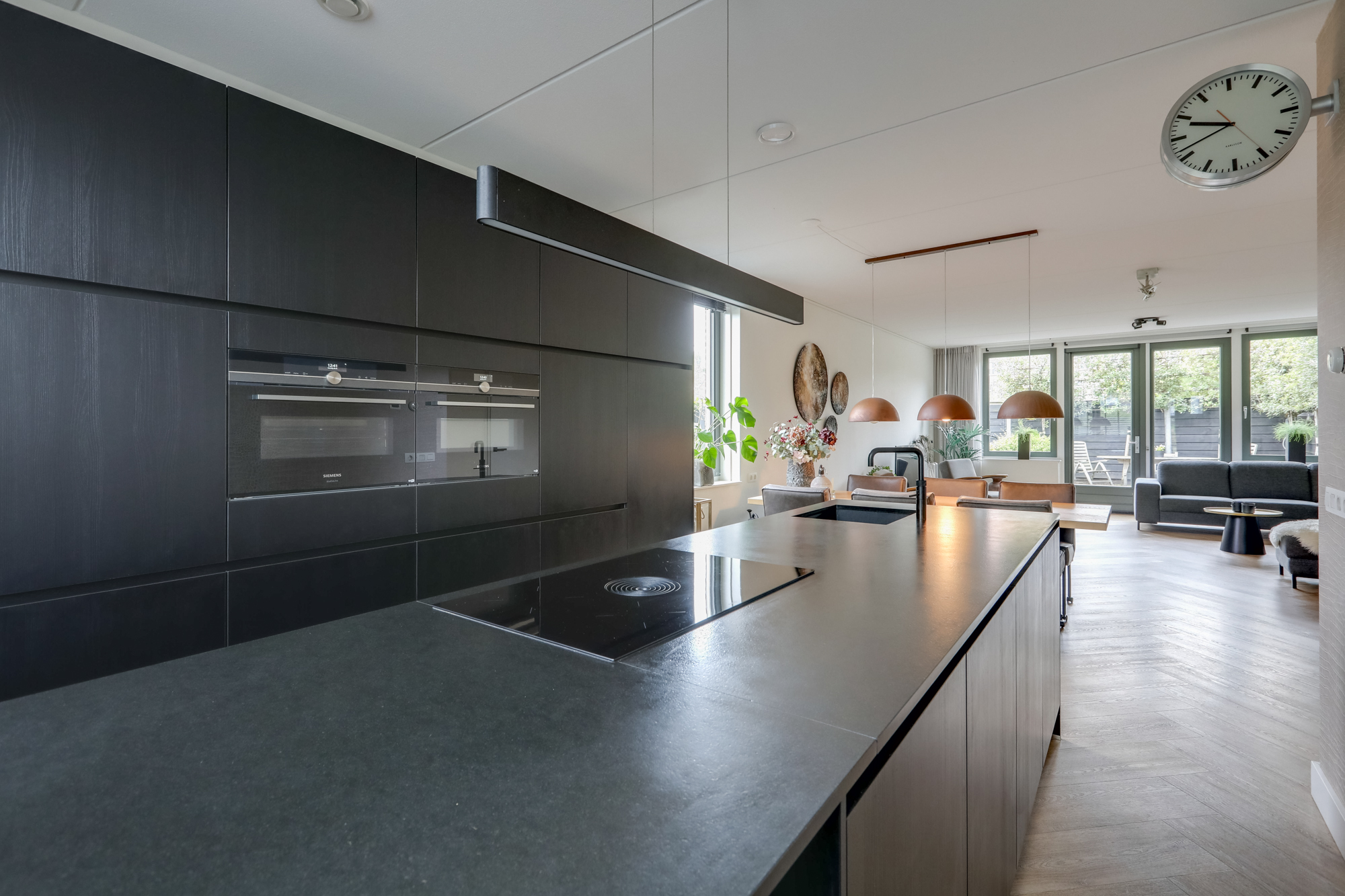 De open keuken aan de voorzijde is luxe uitgevoerd met een groot kookeiland met natuurstenen blad. Hier vind je een Bora-inductiekookplaat met ingebouwde afzuiging, grote koelkast, aparte vriezer (5 lades), stoomoven, combi-oven/magnetron, koffiemachine, Quooker en vaatwasser.