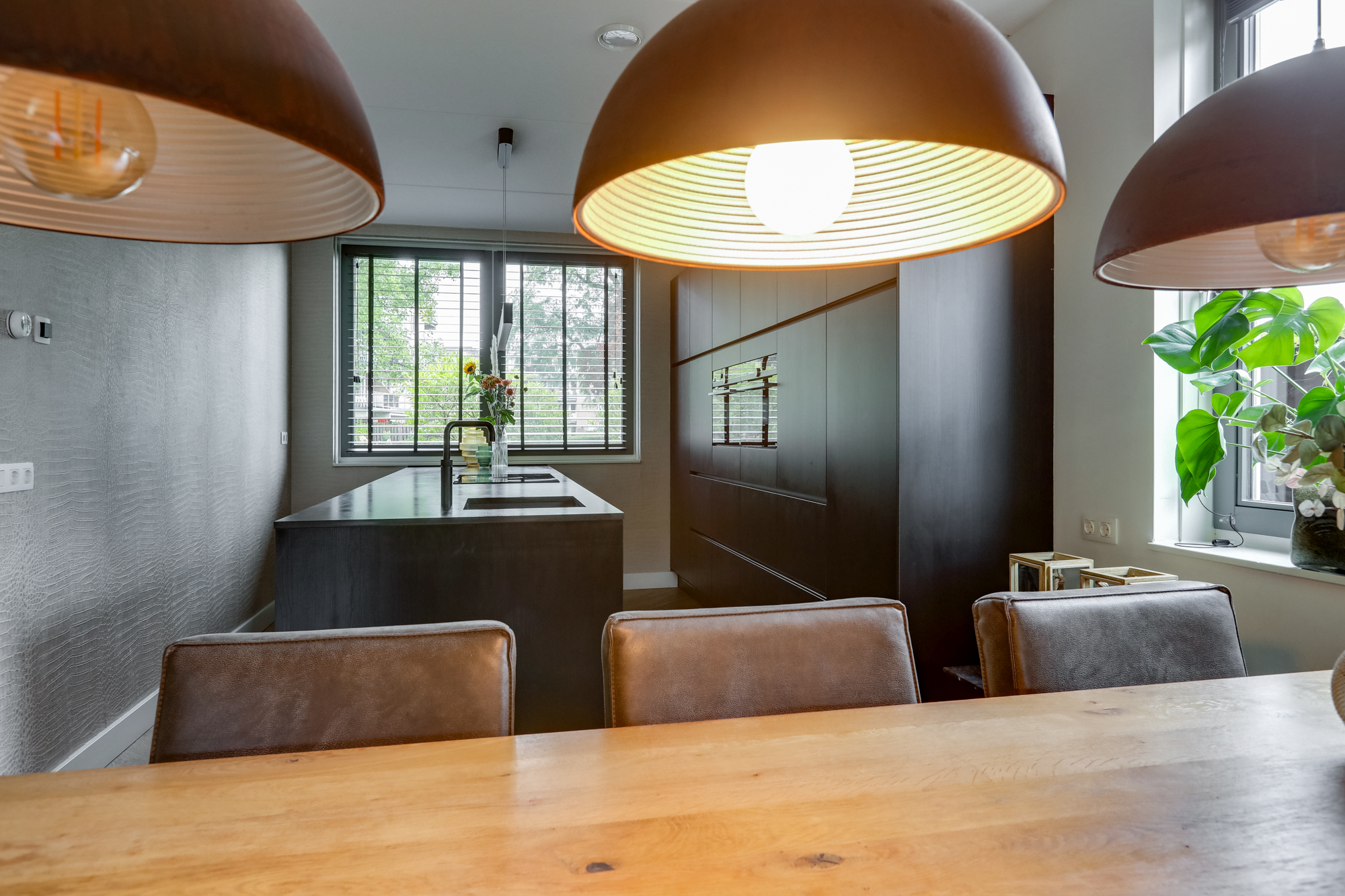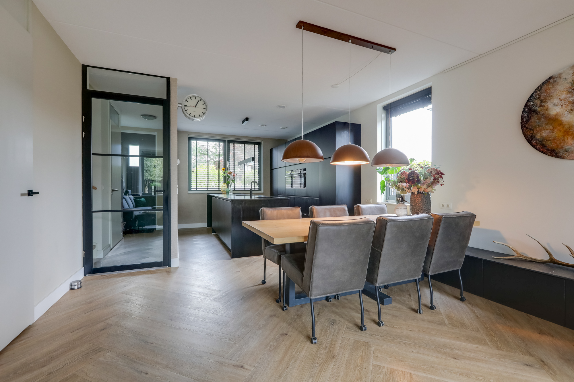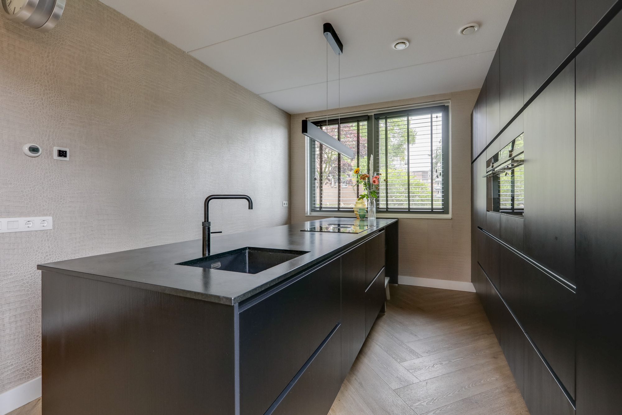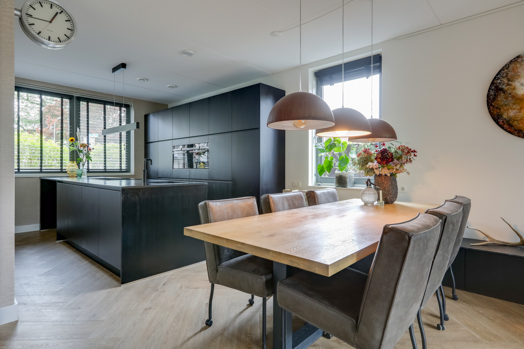 De open keuken aan de voorzijde is luxe uitgevoerd met een groot kookeiland met natuurstenen blad. Hier vind je een Bora-inductiekookplaat met ingebouwde afzuiging, grote koelkast, aparte vriezer (5 lades), stoomoven, combi-oven/magnetron, koffiemachine, Quooker en vaatwasser.