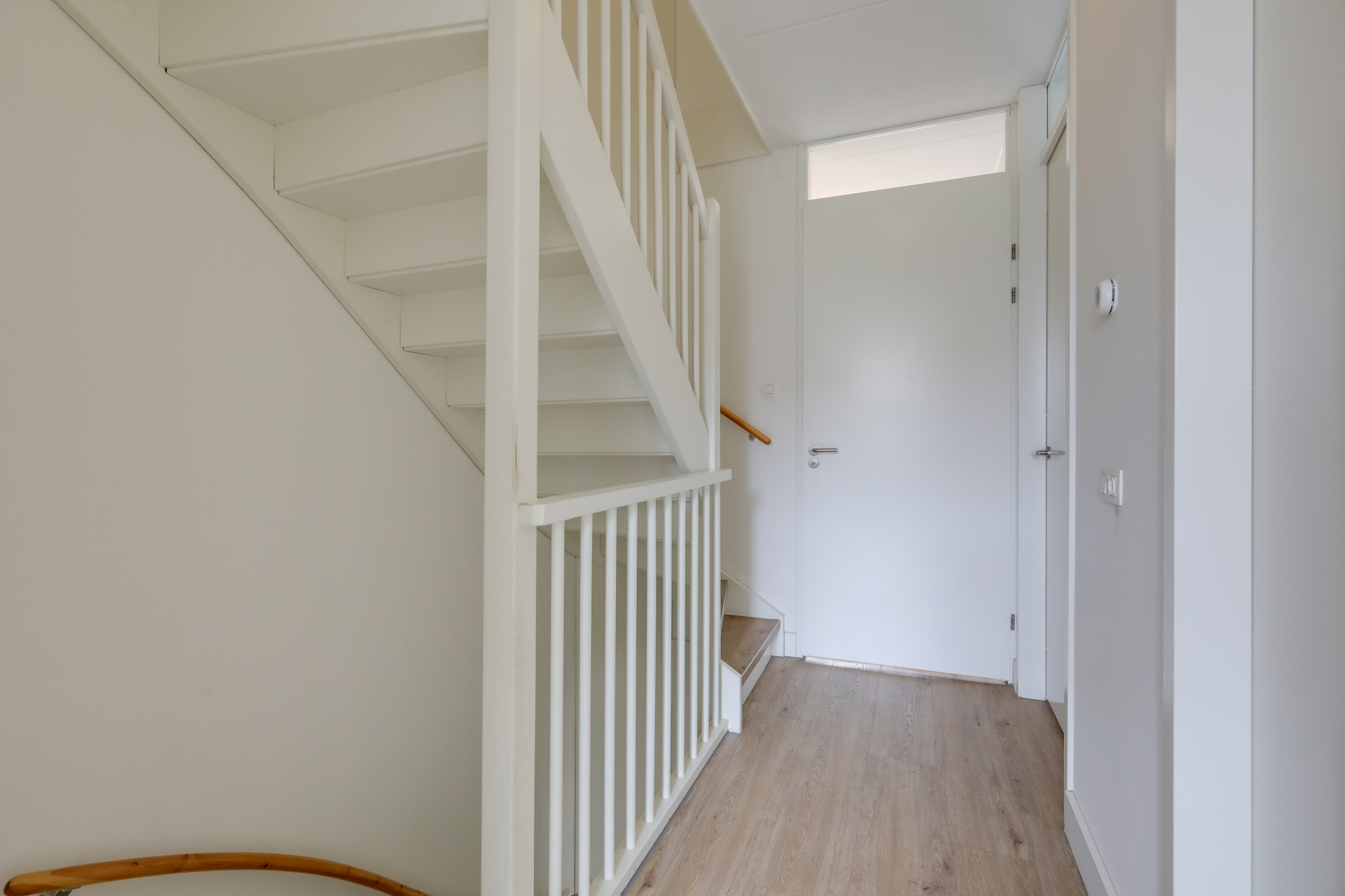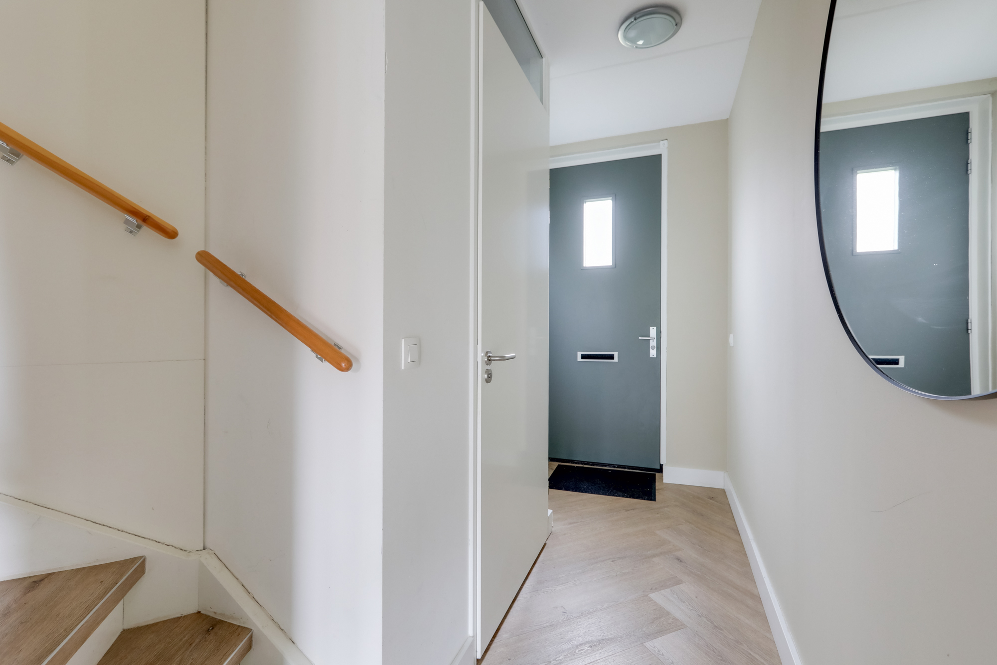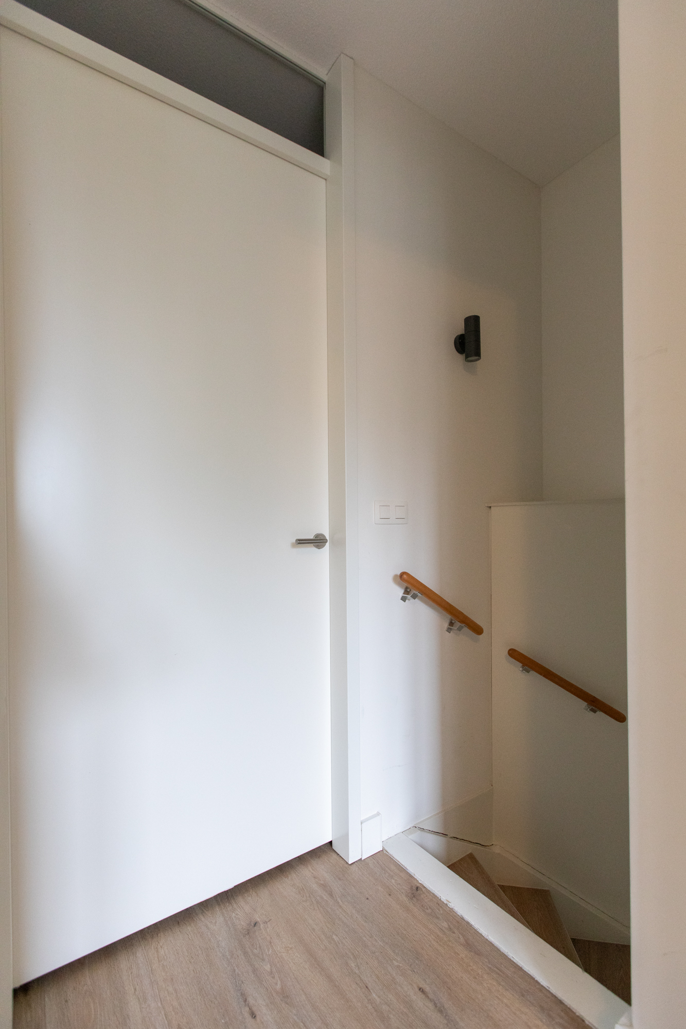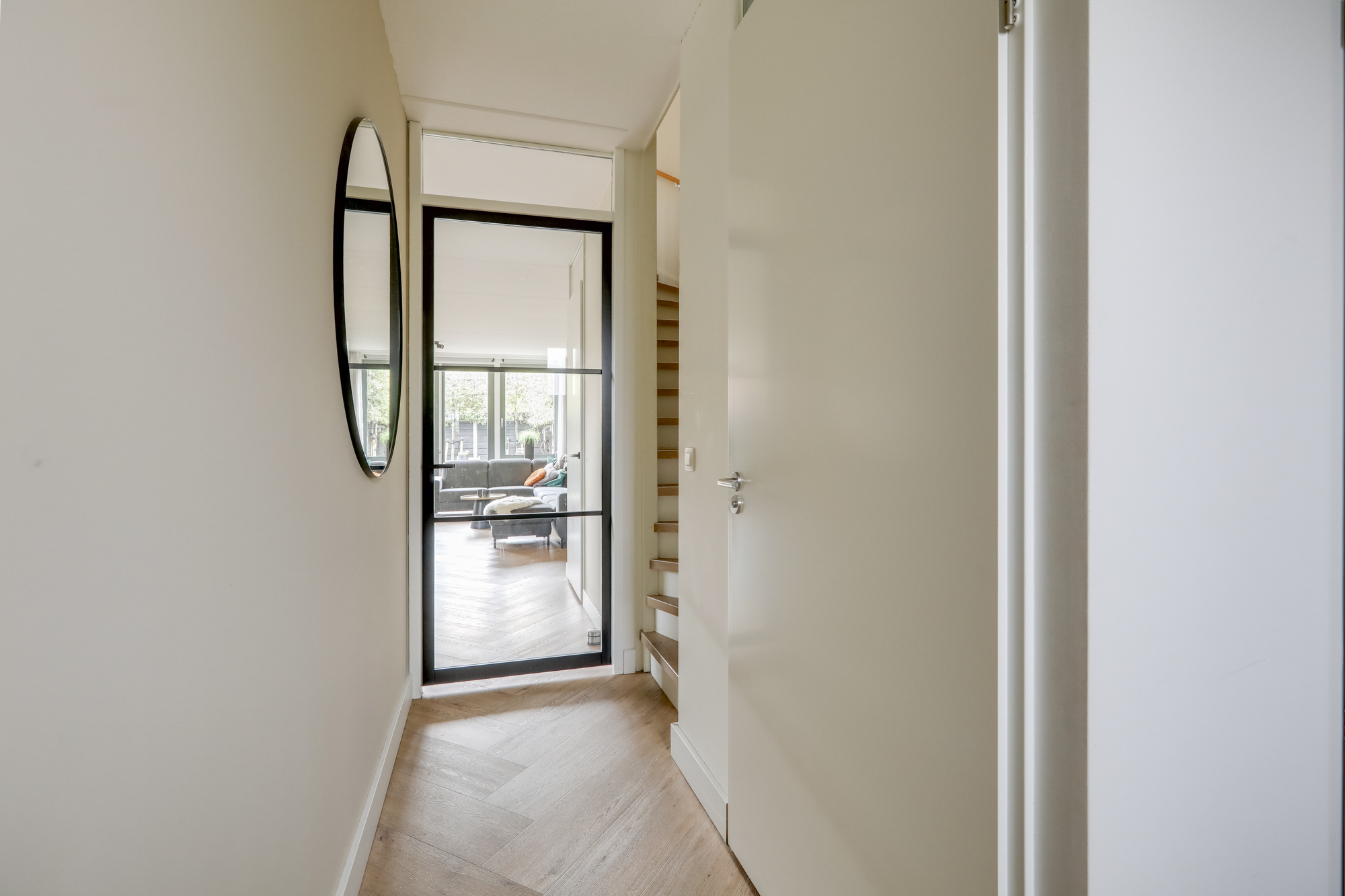 Via de voordeur stap je de hal binnen met meterkast (voorzien van krachtstroom en glasvezelaansluiting) en modern toilet met fontein. De moderne glazen deur geeft toegang tot de ruime woonkamer met openslaande deuren naar de zonnige tuin. De trapkast herbergt de verdeler van de vloerverwarming en extra bergruimte.