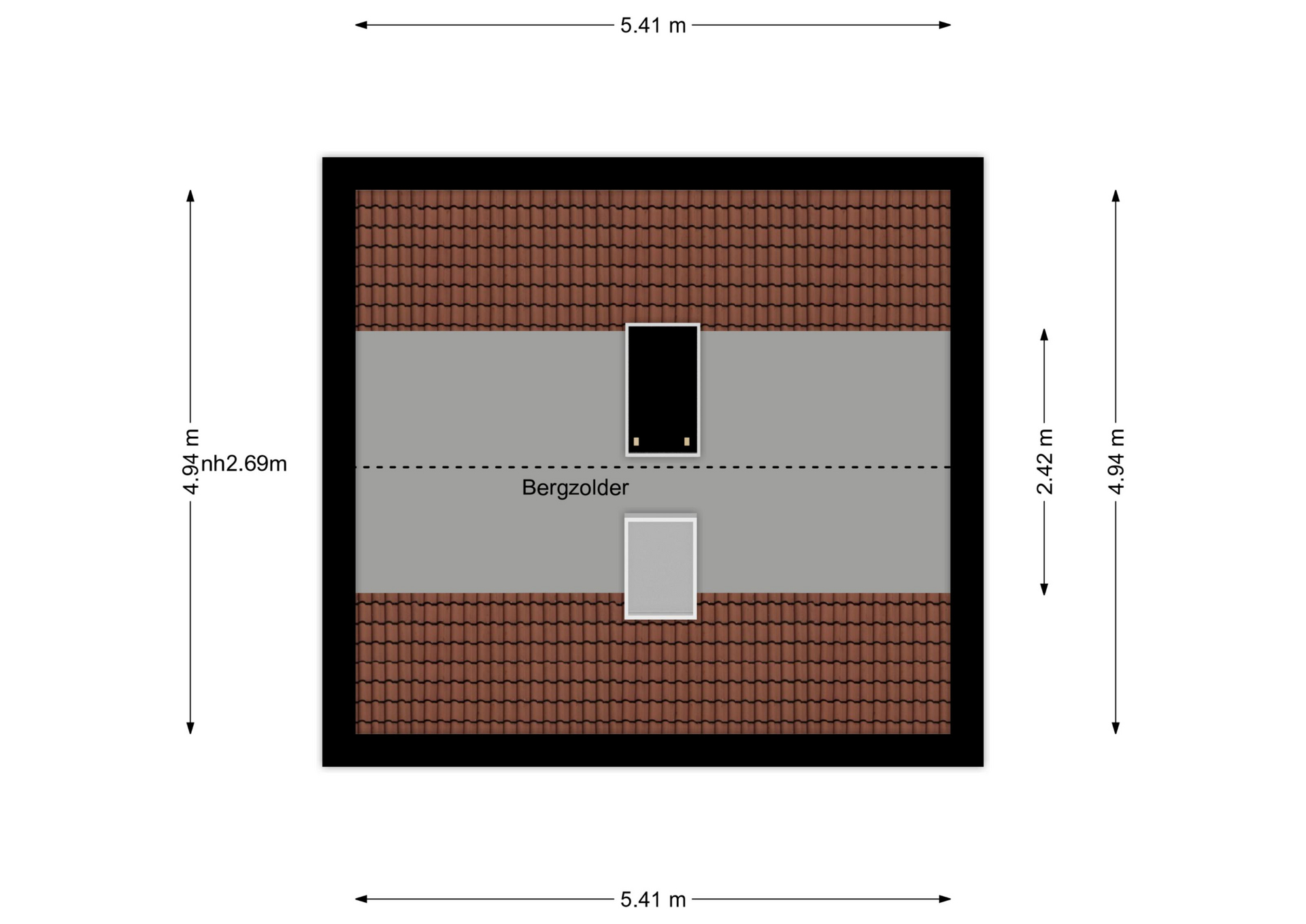 Via een vlizotrap bereik je de hoge en ruime bergzolder met betonnen vloer voorzien van een laminaatvloer, stellingkasten en een dakraam voor ventilatie. Hier is ook de WTW-installatie met omvormer voor de 10 zonnepanelen geplaatst.